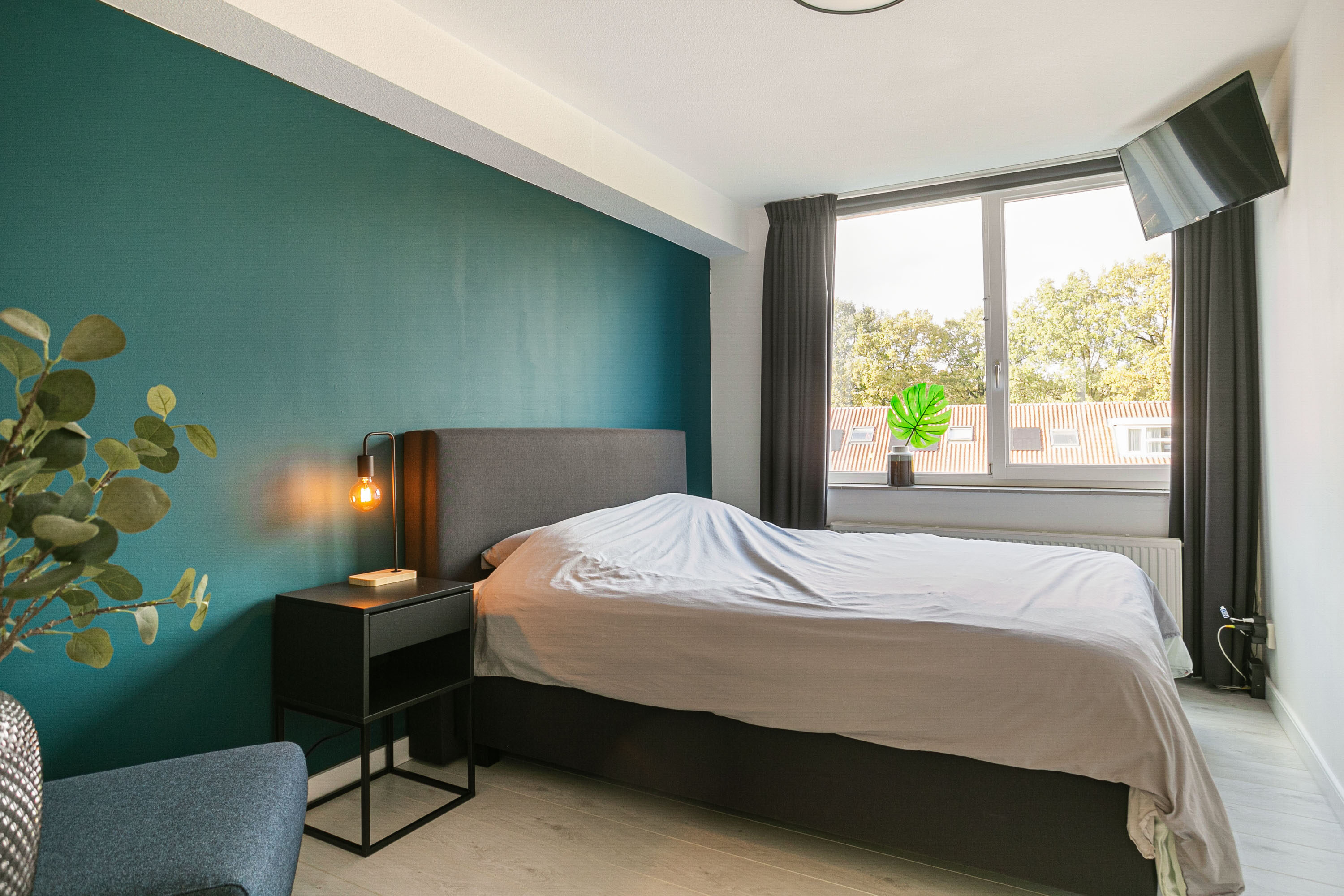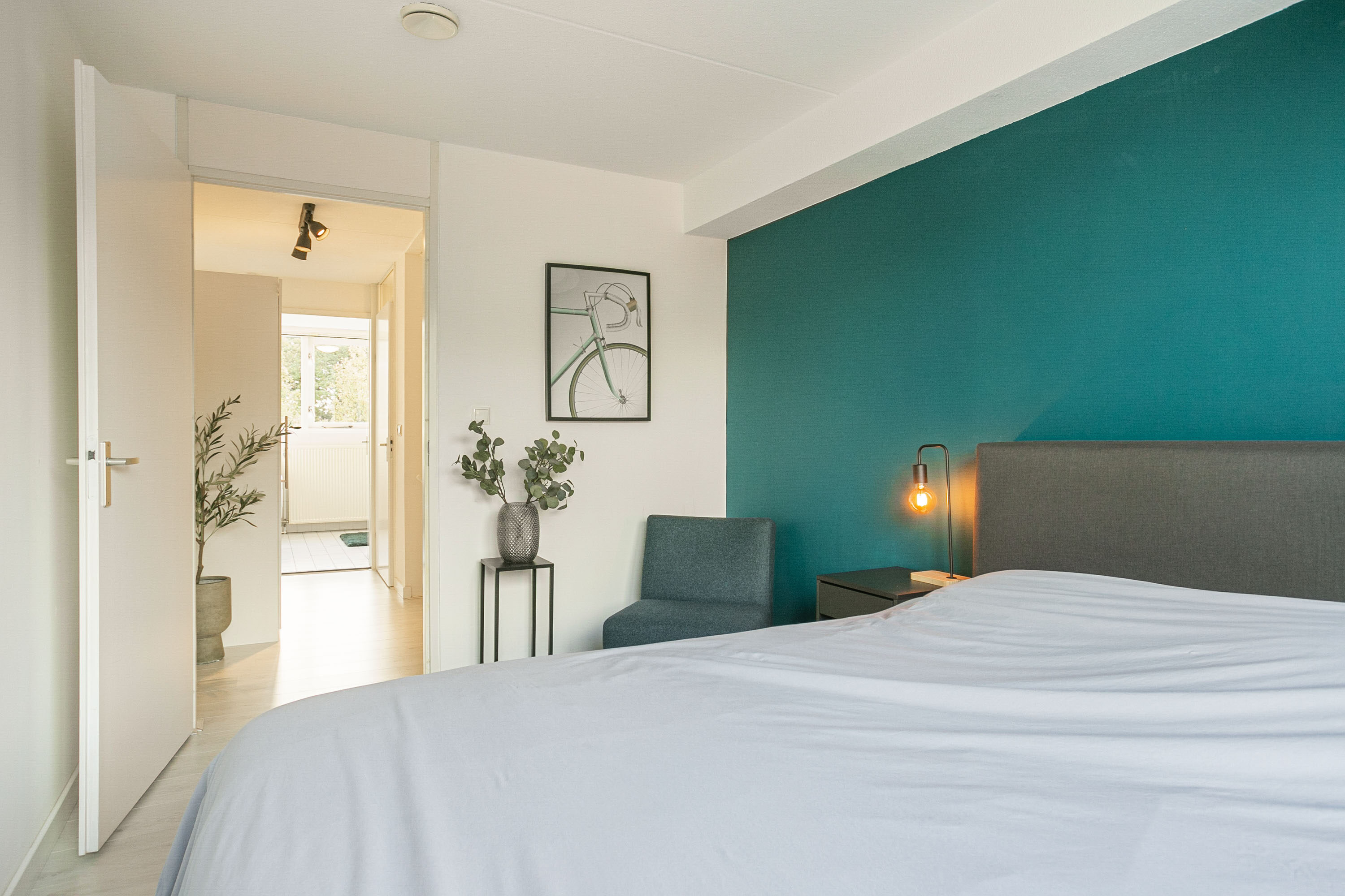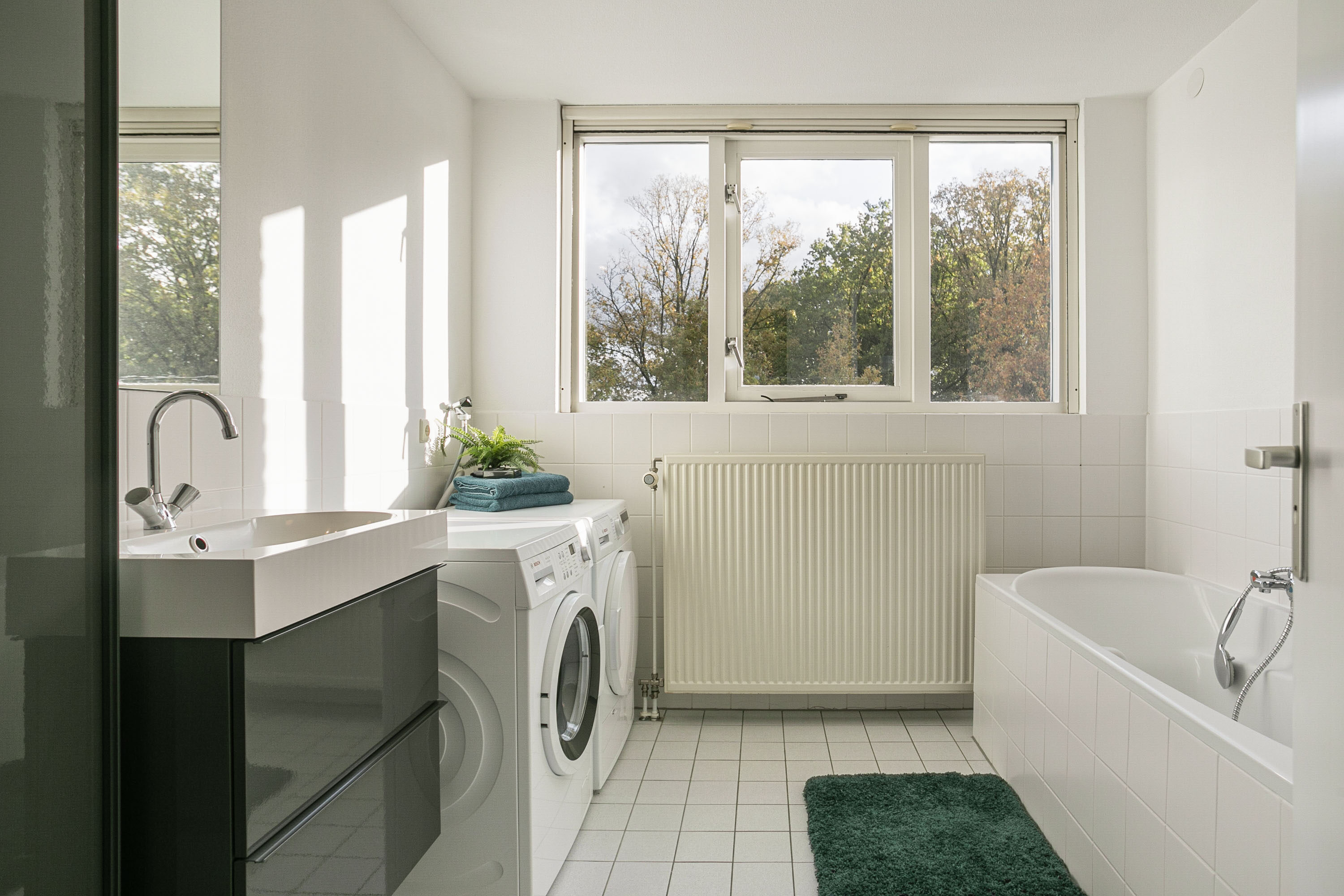 Vanaf de overloop heb je toegang tot een slaapkamer van circa 11 m² gelegen aan de rustige achterzijde. Daarnaast vind je op deze verdieping een apart toilet en de verzorgde badkamer, voorzien van een ligbad, douche en wastafelmeubel. De aansluitingen voor de wasmachine en droger zijn hier praktisch weggewerkt.