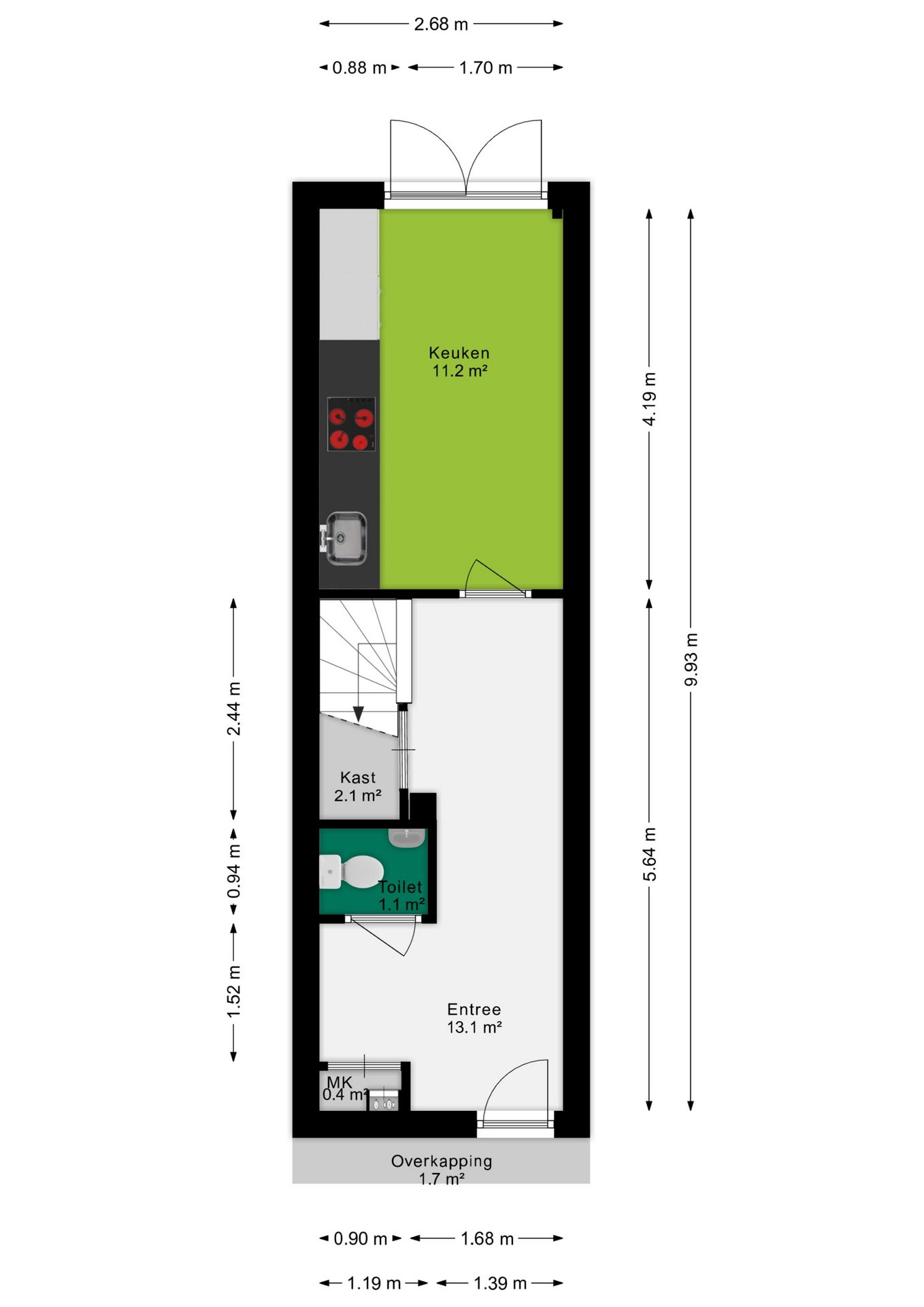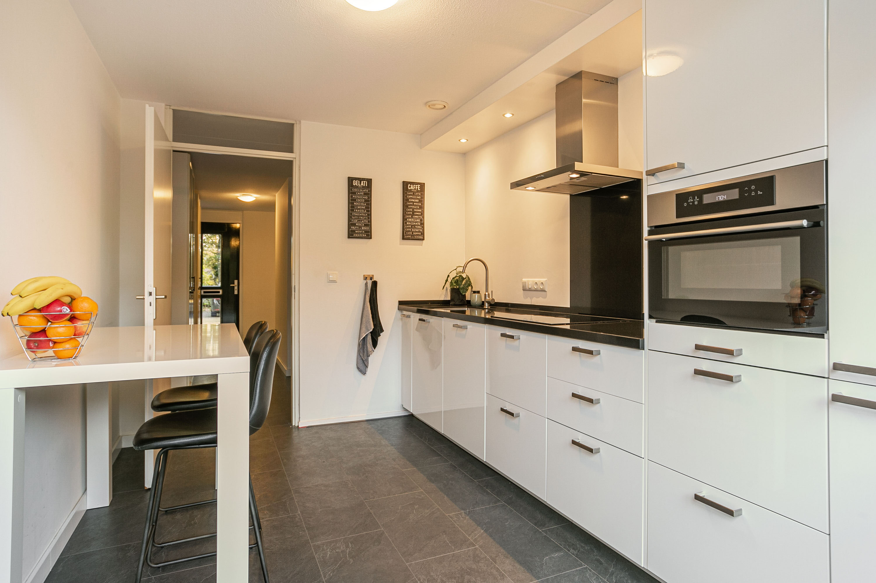 Je komt binnen in een ruime hal met meterkast en toiletruimte. Loop je door, dan kom je in de moderne keuken, voorzien van combi-oven, vaatwasser, kookplaat en koel-vriescombinatie. Er is plek voor een ontbijthoek of eettafel. De openslaande deuren geven direct toegang tot de diepe tuin, waardoor binnen en buiten prettig met elkaar verbonden zijn.