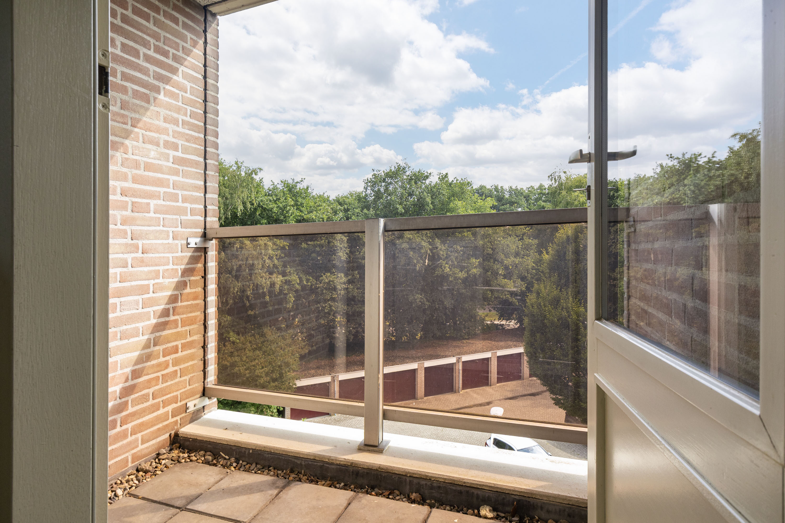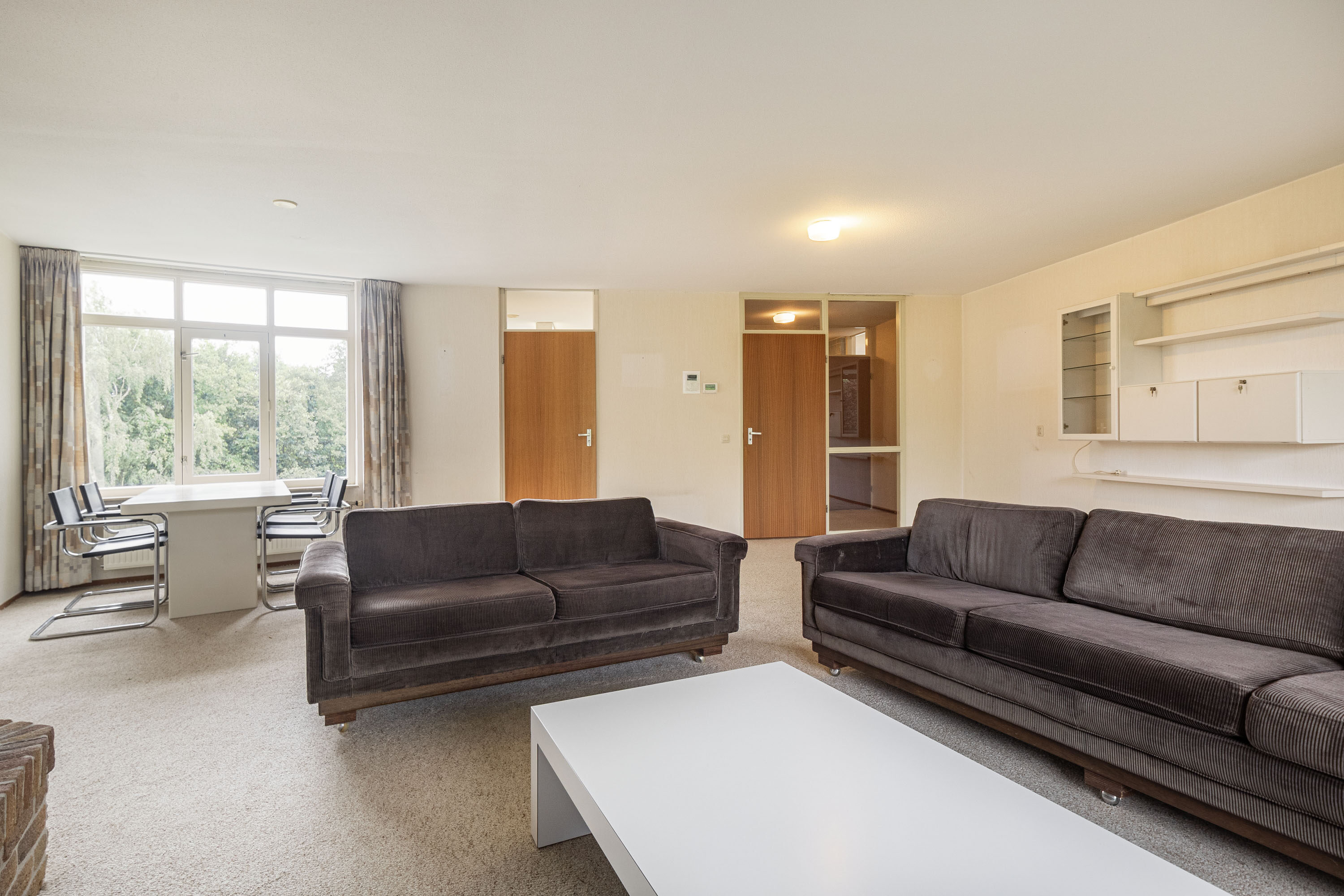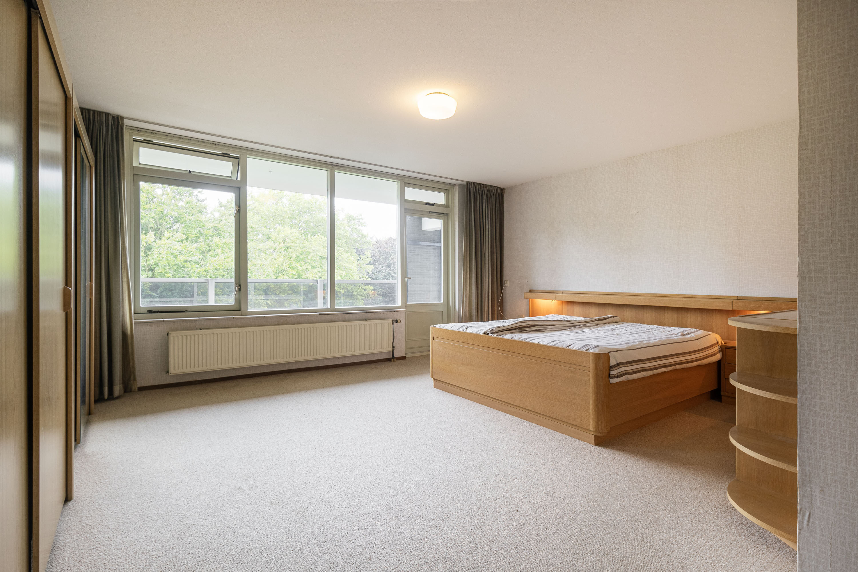De woonkamer van 45 m² is het hart van het appartement. De grote raampartijen zorgen voor veel licht en een fijn uitzicht op het groen. De open haard maakt het geheel sfeervol. Vanuit de woonkamer heb je toegang tot het zonnige balkon op het zuidwesten (18 m²), een heerlijke plek om buiten te zitten.