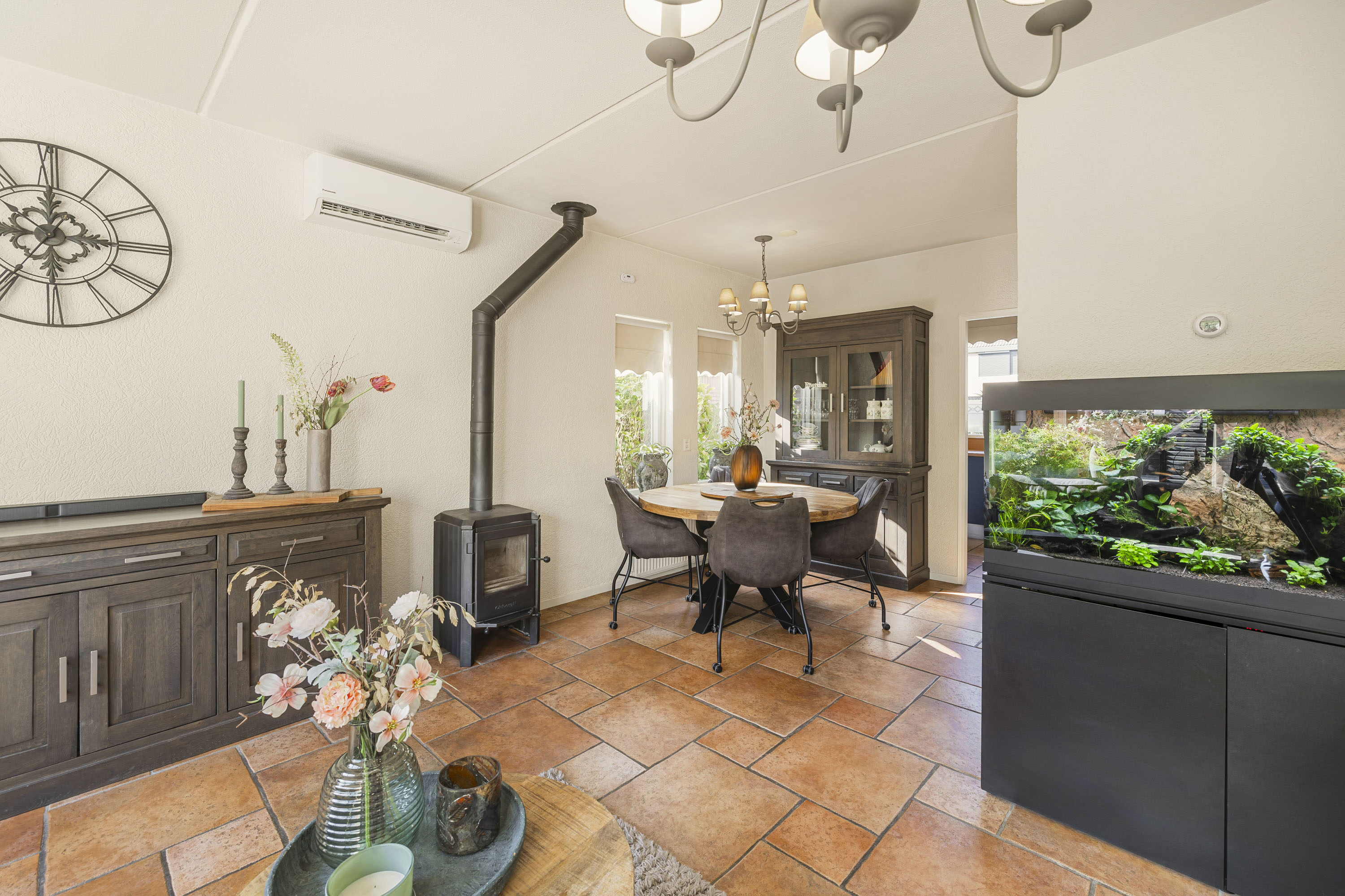Bij binnenkomst kom je in een ruime entree van 6,6 m² met toilet, fonteintje, berging en trapopgang. Vanuit de hal bereik je de woonkamer van 25,2 m², die dankzij de grote ramen aan de achterzijde veel lichtinval heeft. De houtkachel zorgt hier voor extra sfeer. Aan de voorzijde ligt de keuken, uitgerust met een inductiekookplaat, afzuigkap, koelkast, vaatwasser en combi-oven/magnetron.