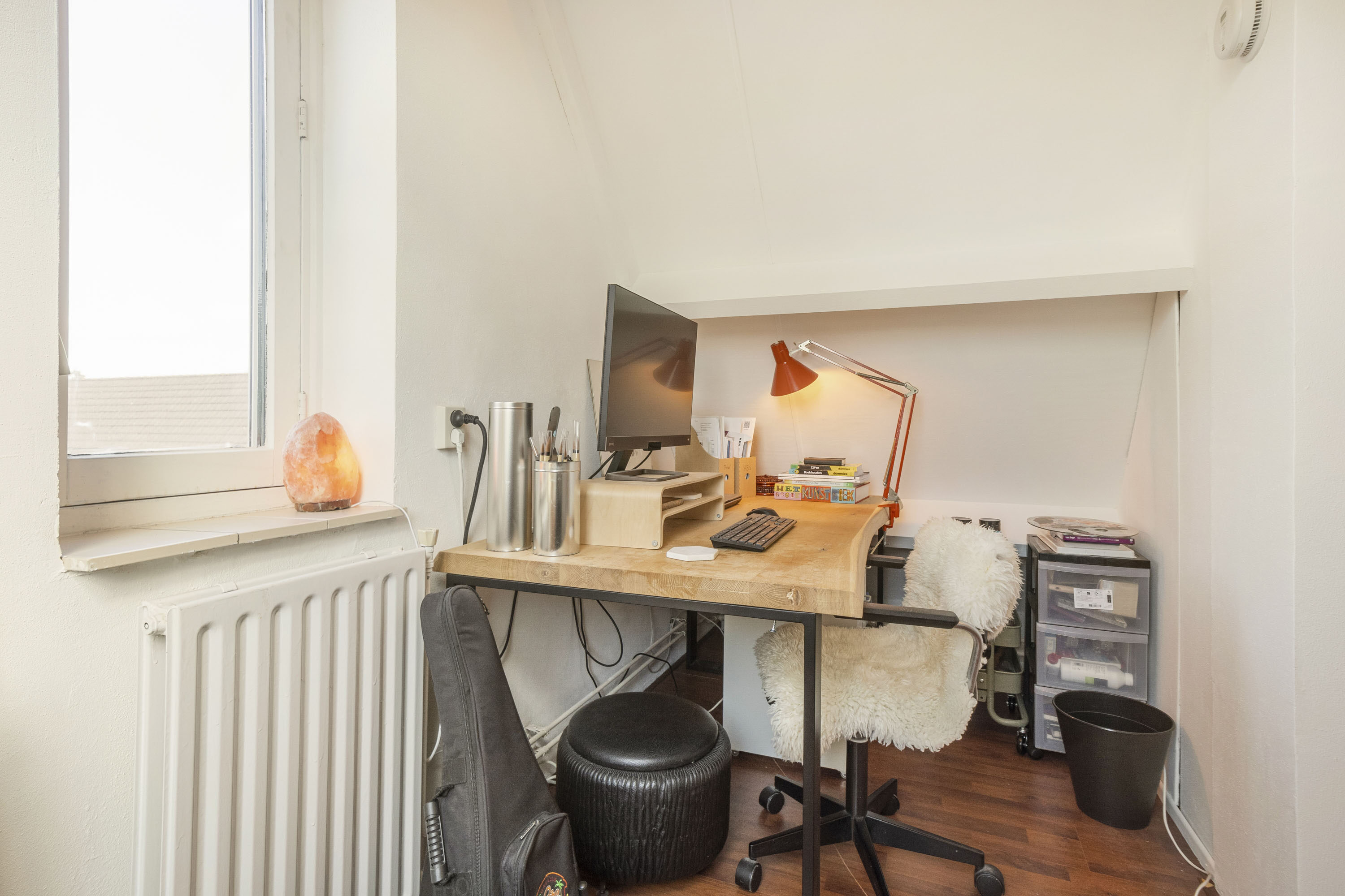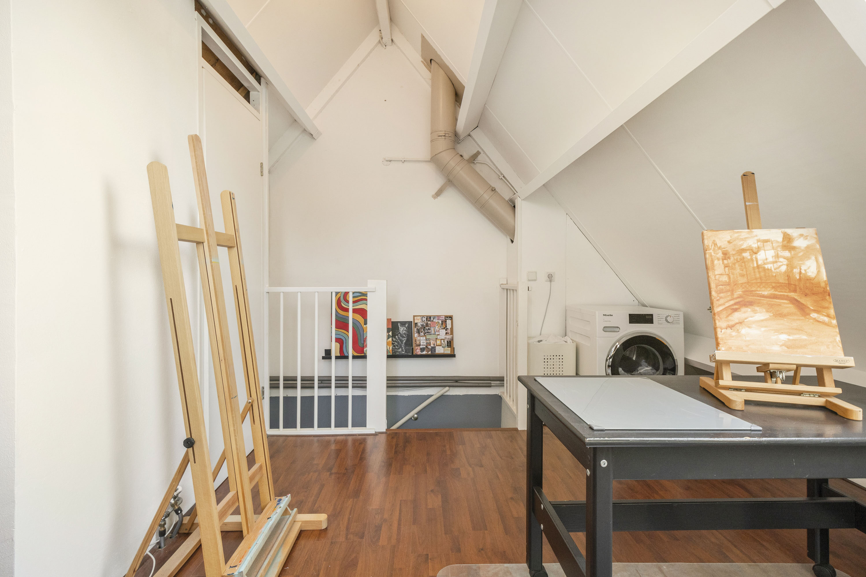 Via de vaste trap kom je op de zolderverdieping met een derde kamer van 11,1 m², geschikt als slaap-, werk- of sportruimte. Een dakraam op het westen en een raam aan de noordzijde zorgen voor een fijne lichtinval. Verder bevindt zich hier ook de C.V.-ketel en de aansluiting voor de wasmachine.
