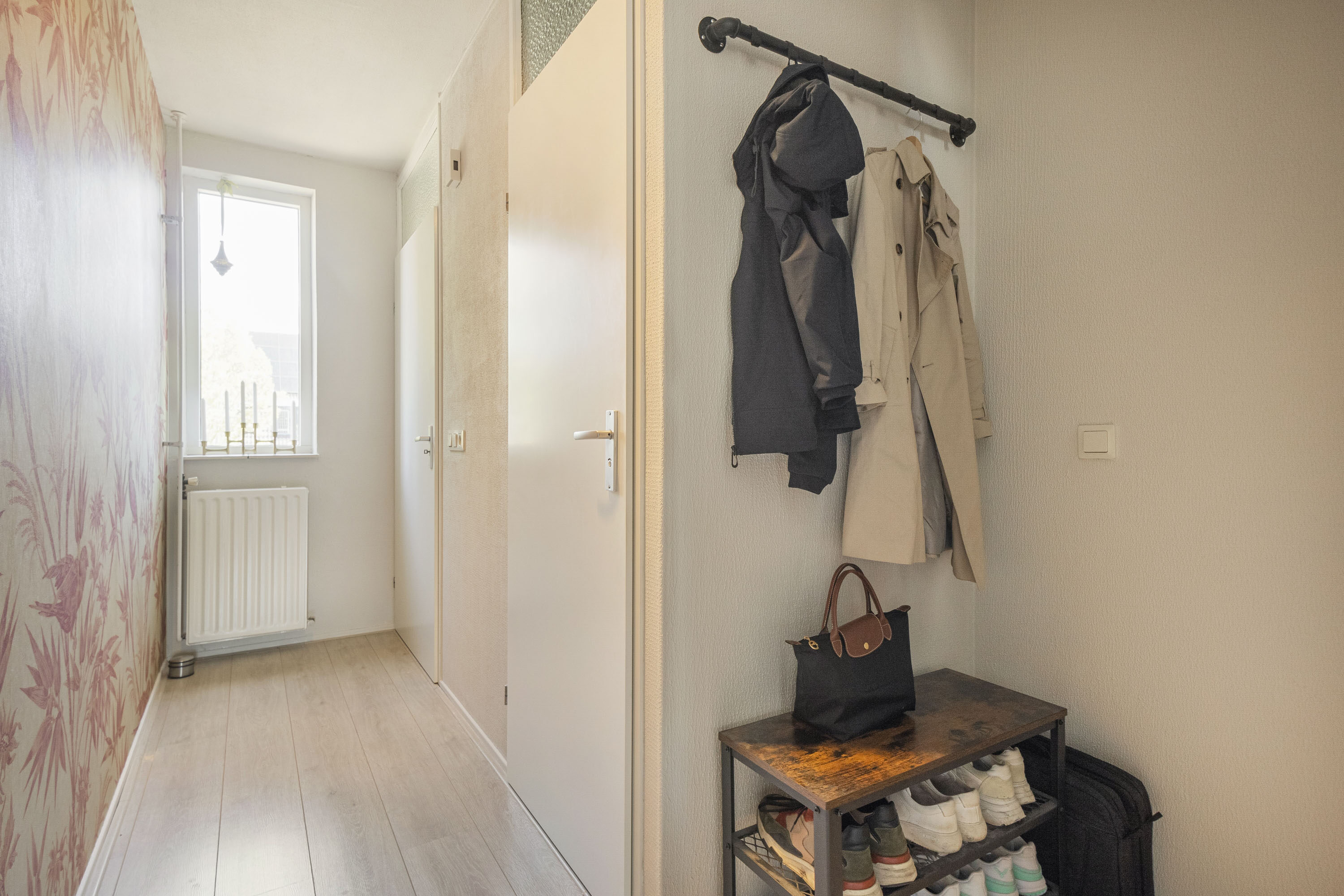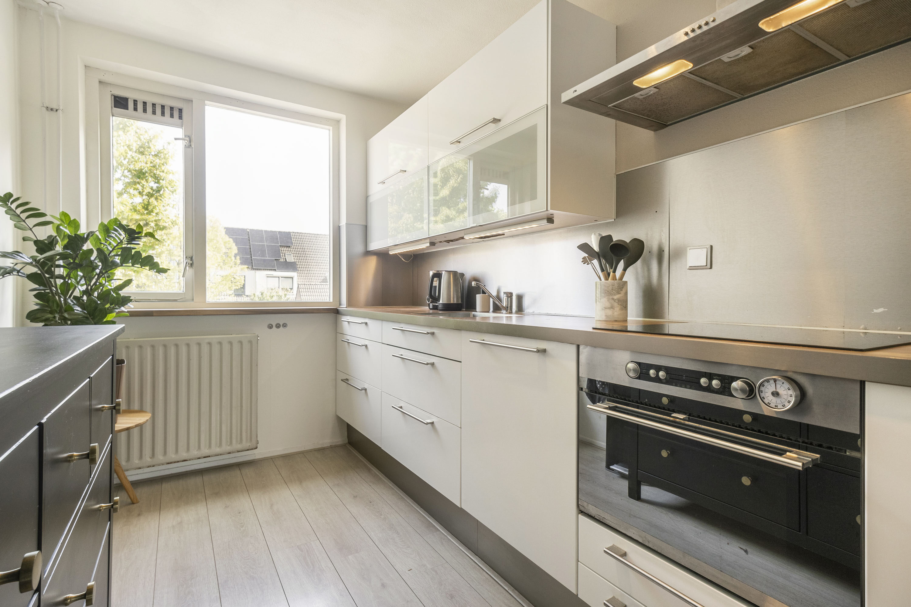 Via de eigen voordeur op de begane grond bereik je de trap naar boven. In de hal vind je het toilet en de trapopgang. De lichte woonkamer, met een royaal raampartij aan de achterzijde, biedt toegang tot het balkon. Centraal ligt het eetgedeelte met ruimte voor een grote eettafel. De keuken met hoogglans witte kasten is voorzien van diverse inbouwapparatuur zoals: de kookplaat, afzuigkap, combi-oven, koel-vriescombinatie en vaatwasser.