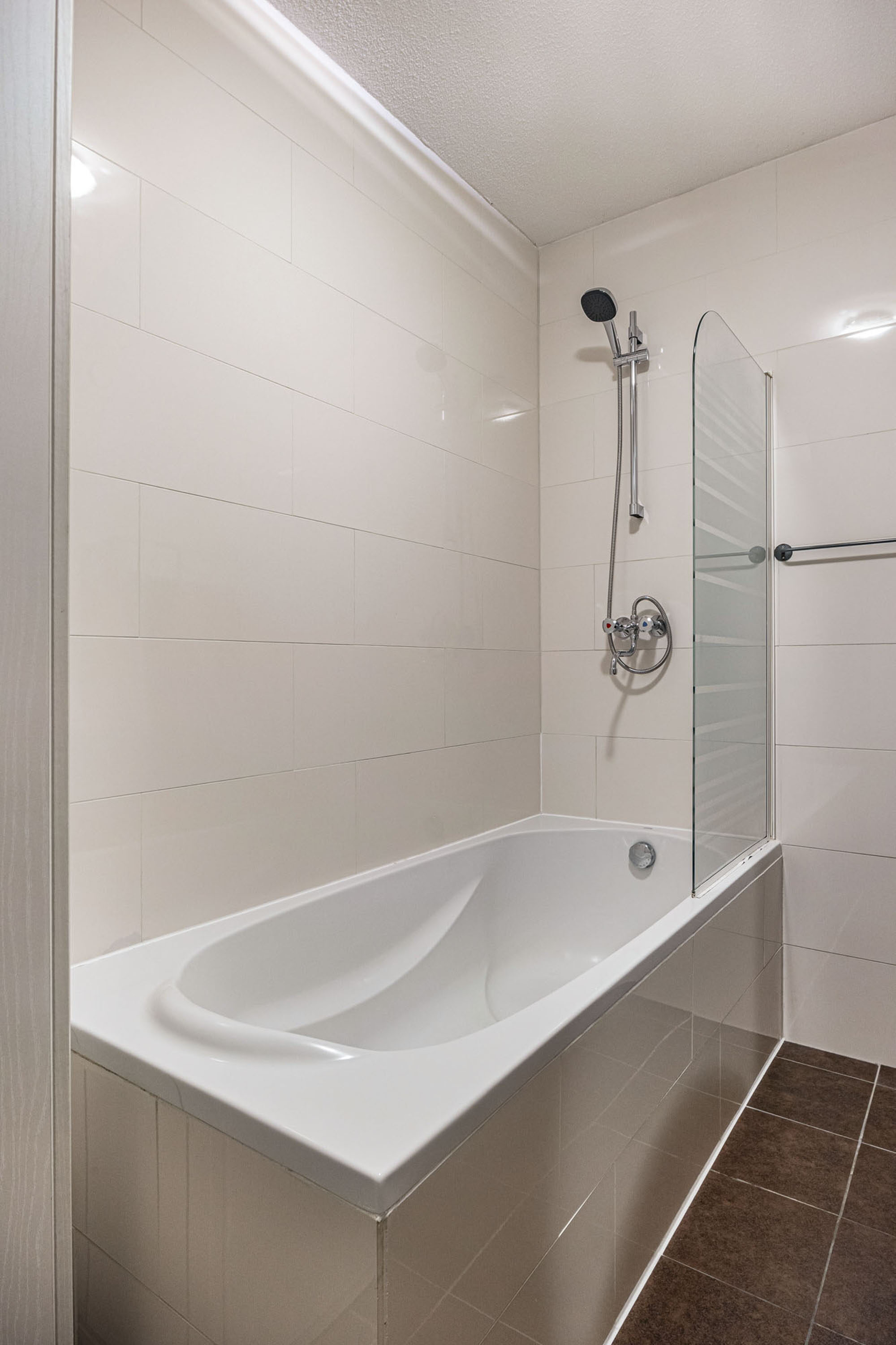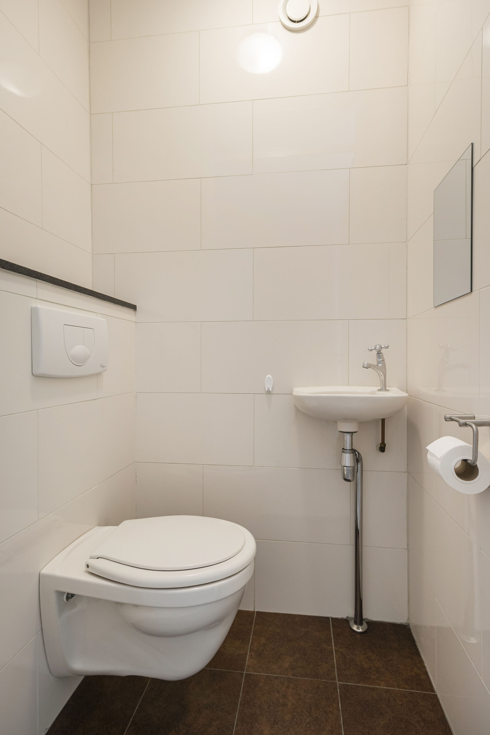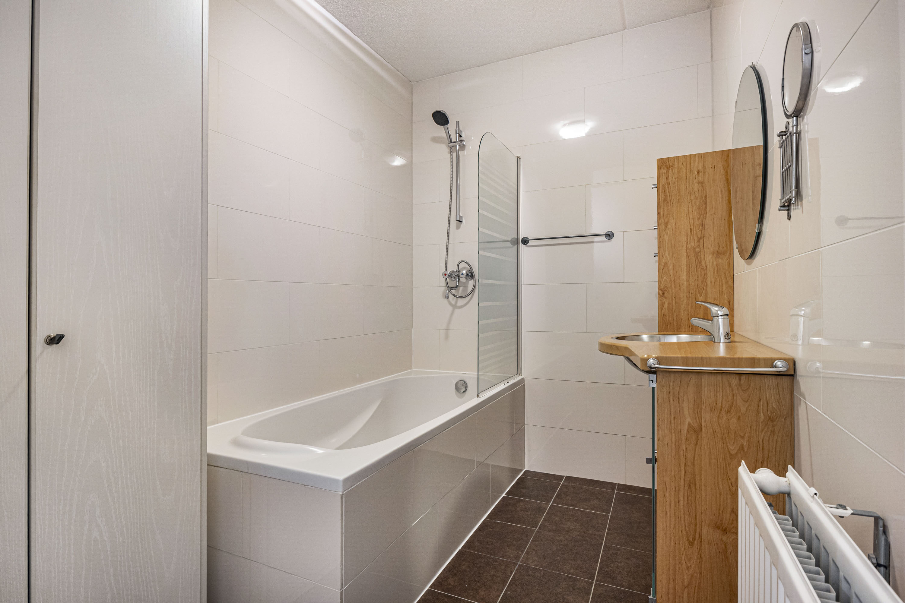 Vanuit de hal bereik je de grote slaapkamer van ca. 16 m². De badkamer is volledig betegeld en uitgerust met: