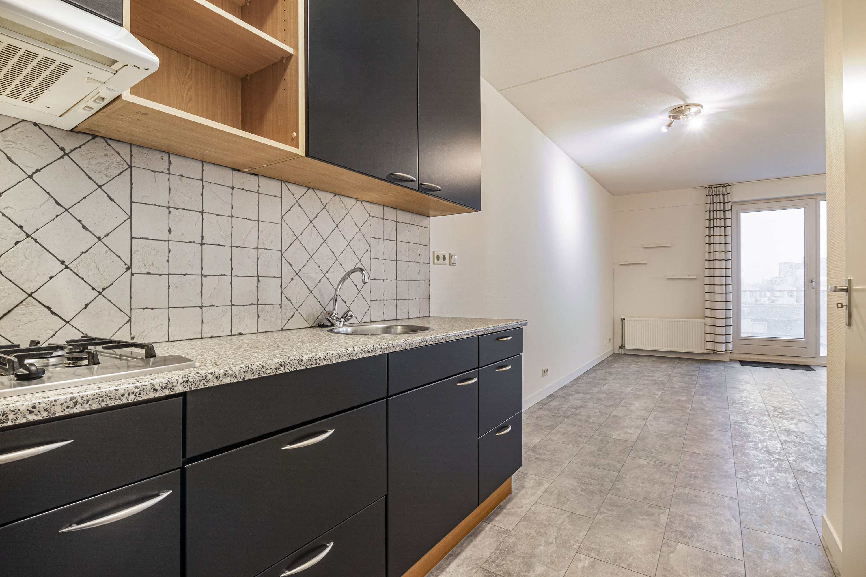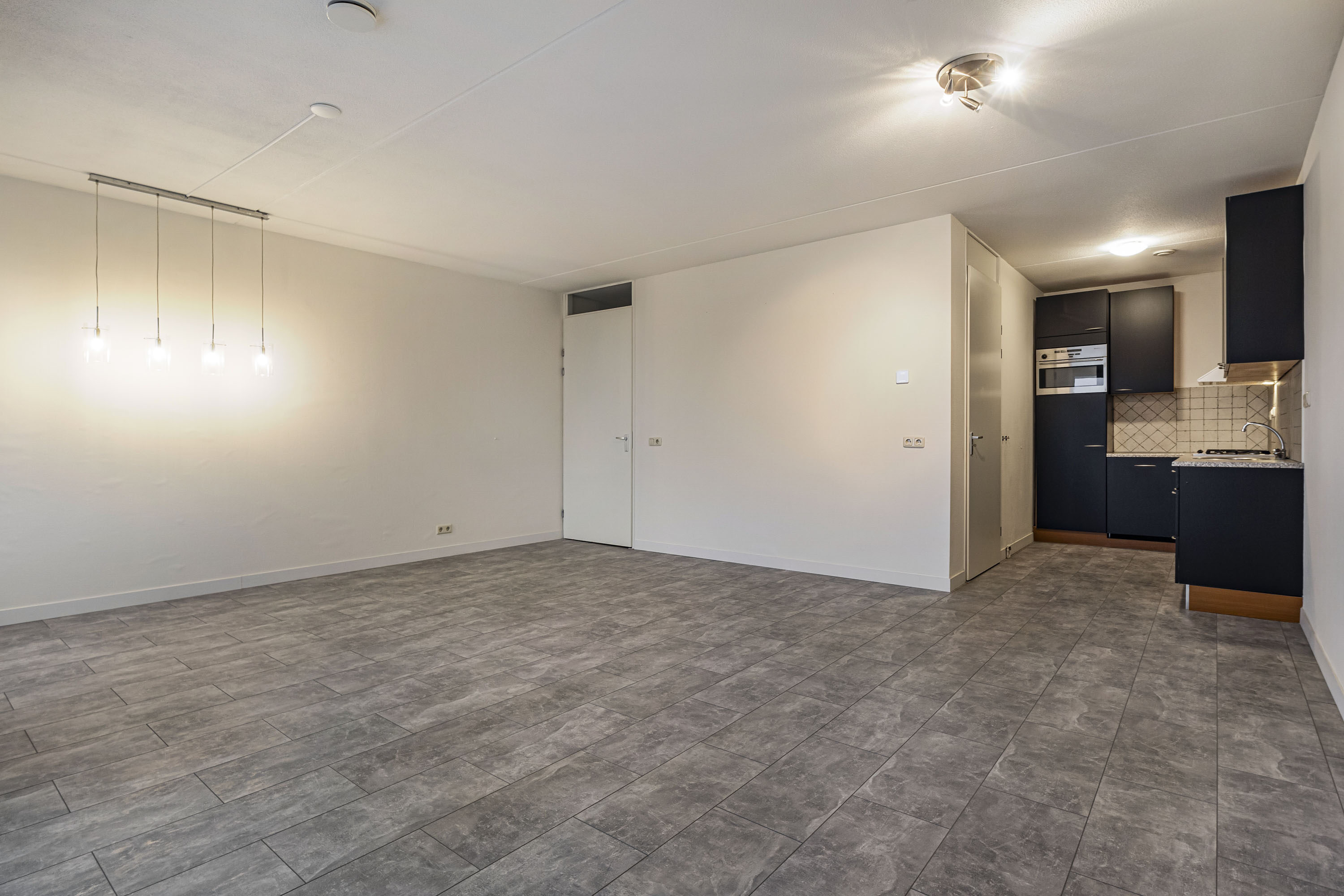 Bij binnenkomst kom je in een ruime hal met videofoon-installatie, toiletruimte met hangend toilet en fonteintje, en toegang tot alle vertrekken. De lichte woonkamer is royaal opgezet en geeft via een draai-/kiepdeur toegang tot het balkon. Je kijkt vanuit de woonkamer en vanaf het balkon prettig weg door de hoogte van het appartement.