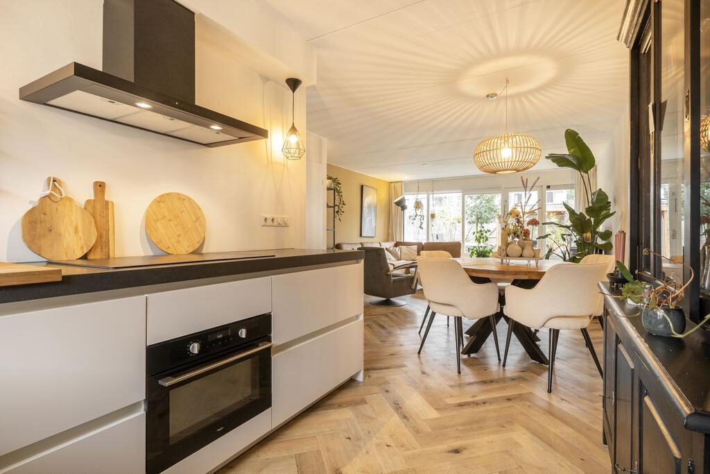 De moderne keuken is uitgevoerd in een lichte kleurstelling, met een stijlvol donker werkblad. Deze keuken is voorzien van alle benodigde inbouwapparatuur, waaronder een inductiekookplaat, afzuigkap, oven, vaatwasser en een koelkast met vriescombinatie. Hierdoor is de keuken niet alleen functioneel, maar ook een plezierige plek om te koken.