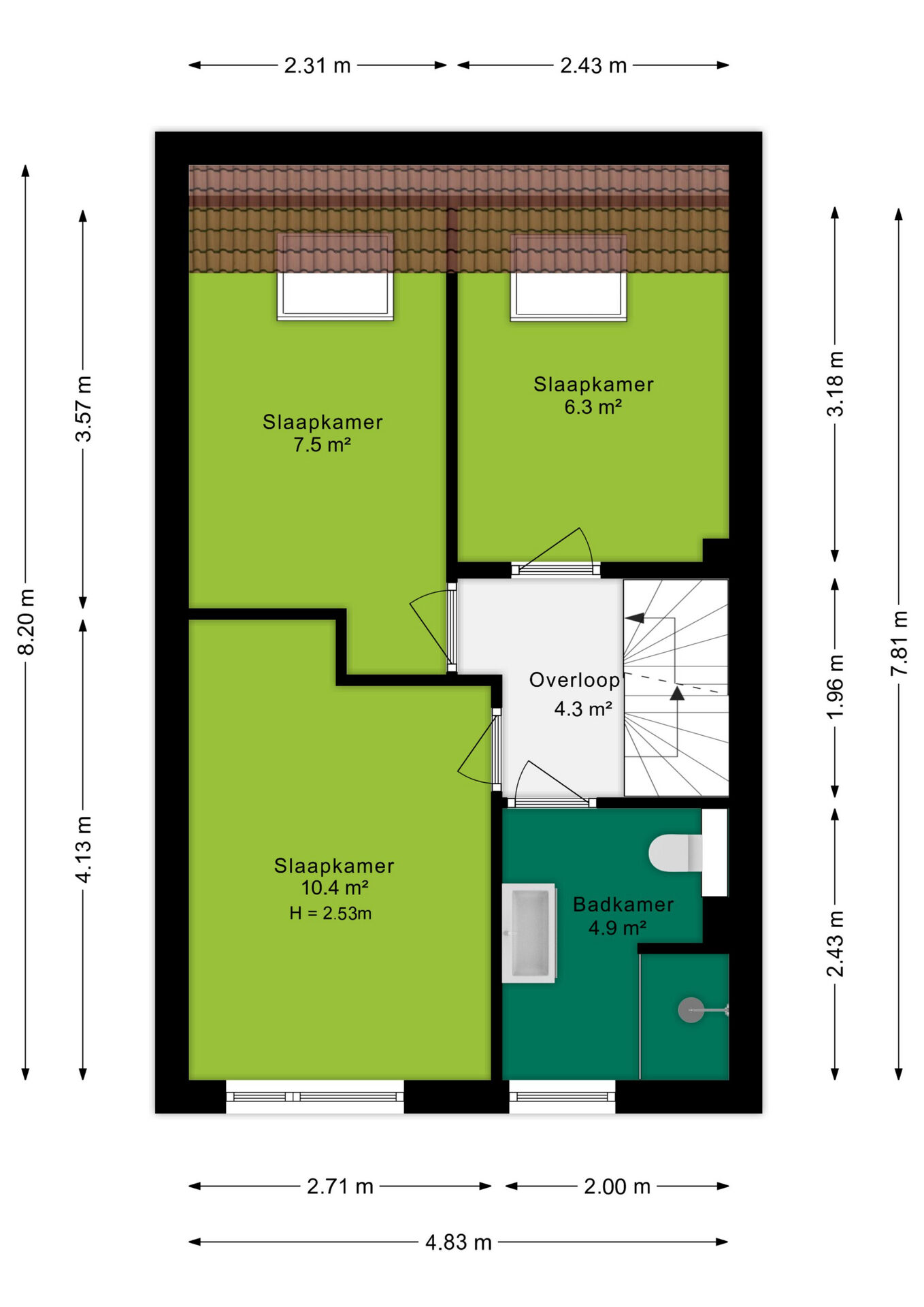 Op de eerste verdieping bevinden zich drie slaapkamers. De grootste slaapkamer is gelegen aan de voorzijde van de woning en heeft een oppervlakte van ruim 10 m². Aan de achterzijde bevinden zich nog twee slaapkamers van circa 7,5 m² en 6 m². Dankzij de grote raampartijen geniet elke kamer van veel natuurlijke lichtinval, wat zorgt voor een prettige en lichte sfeer.