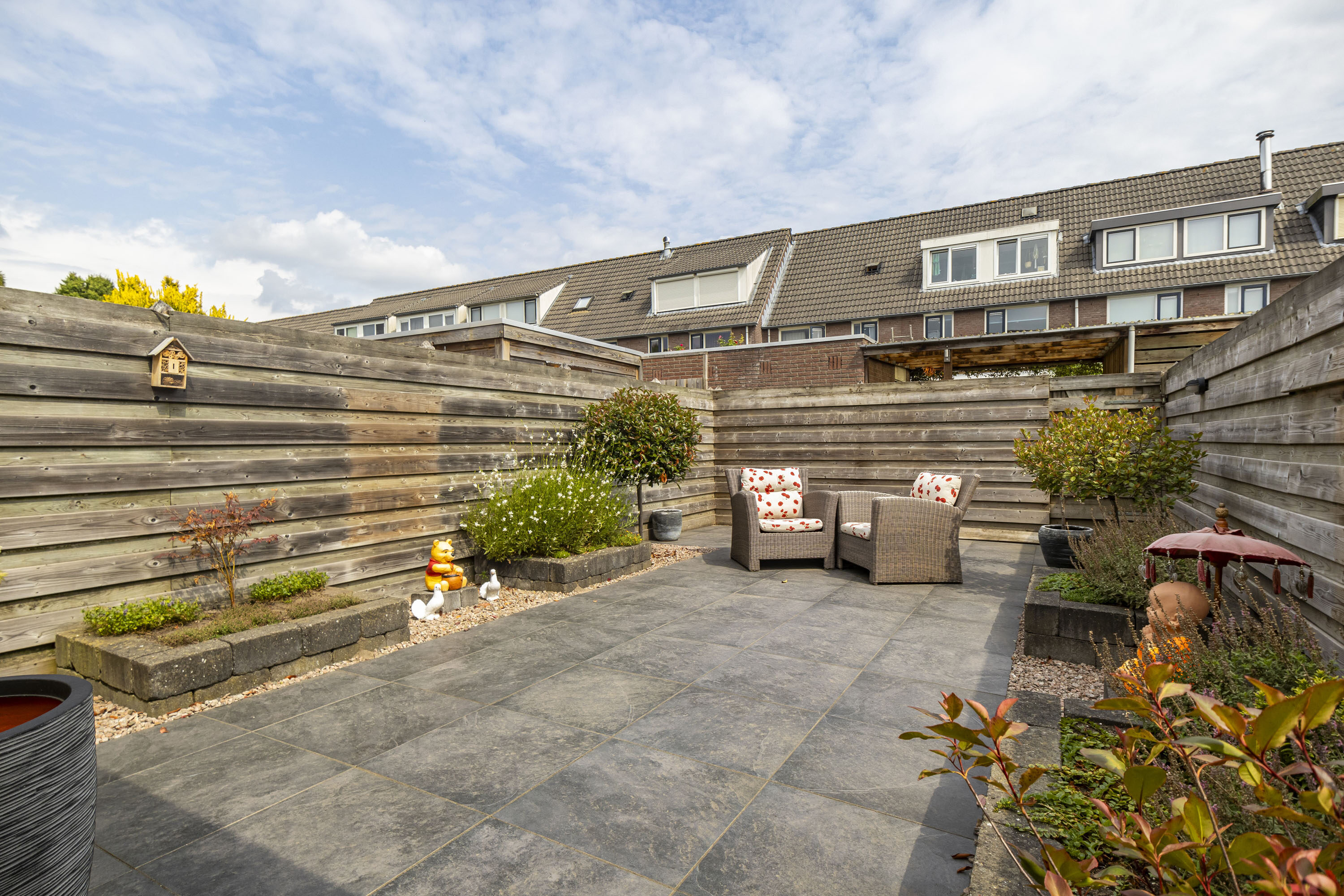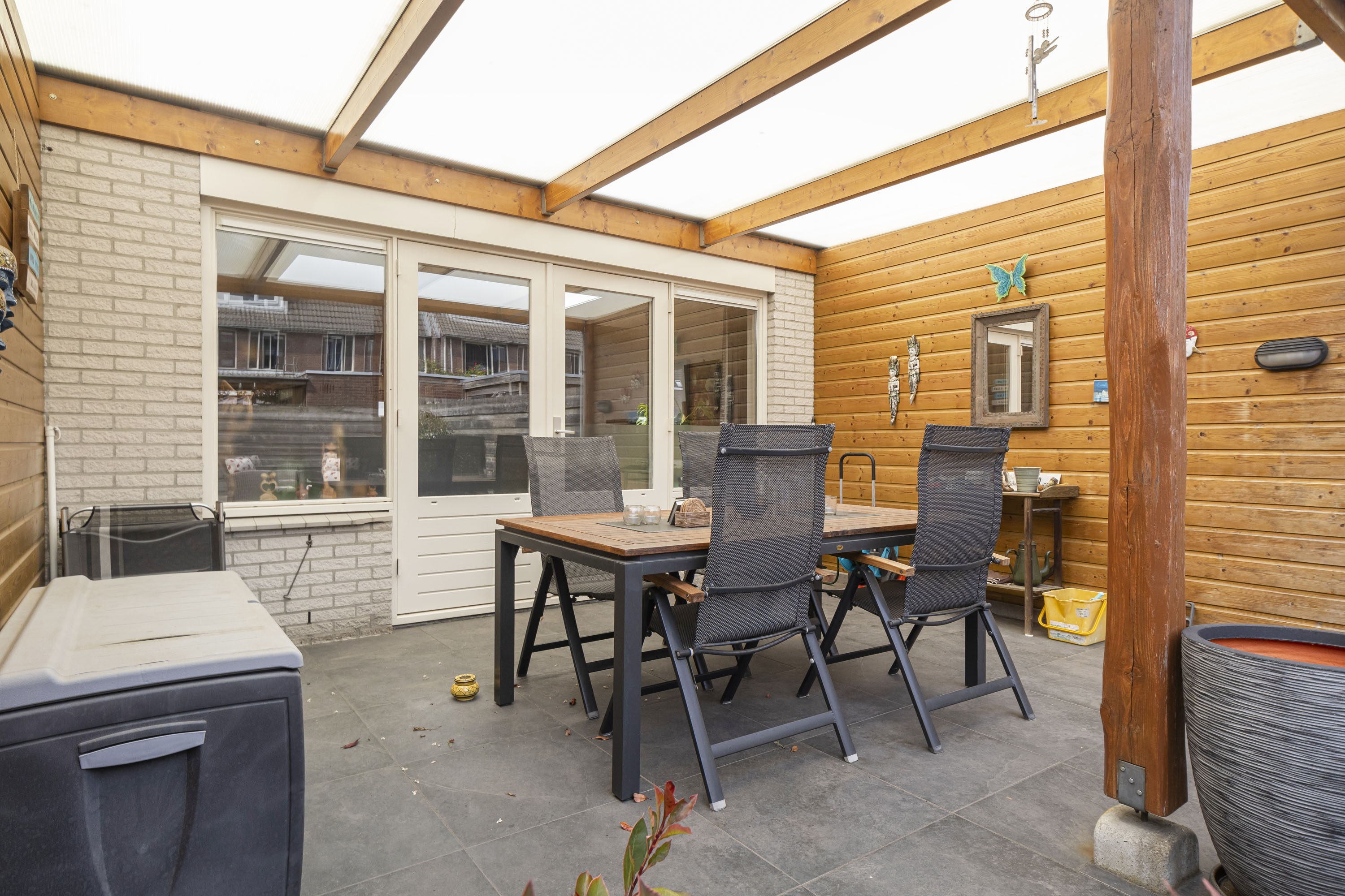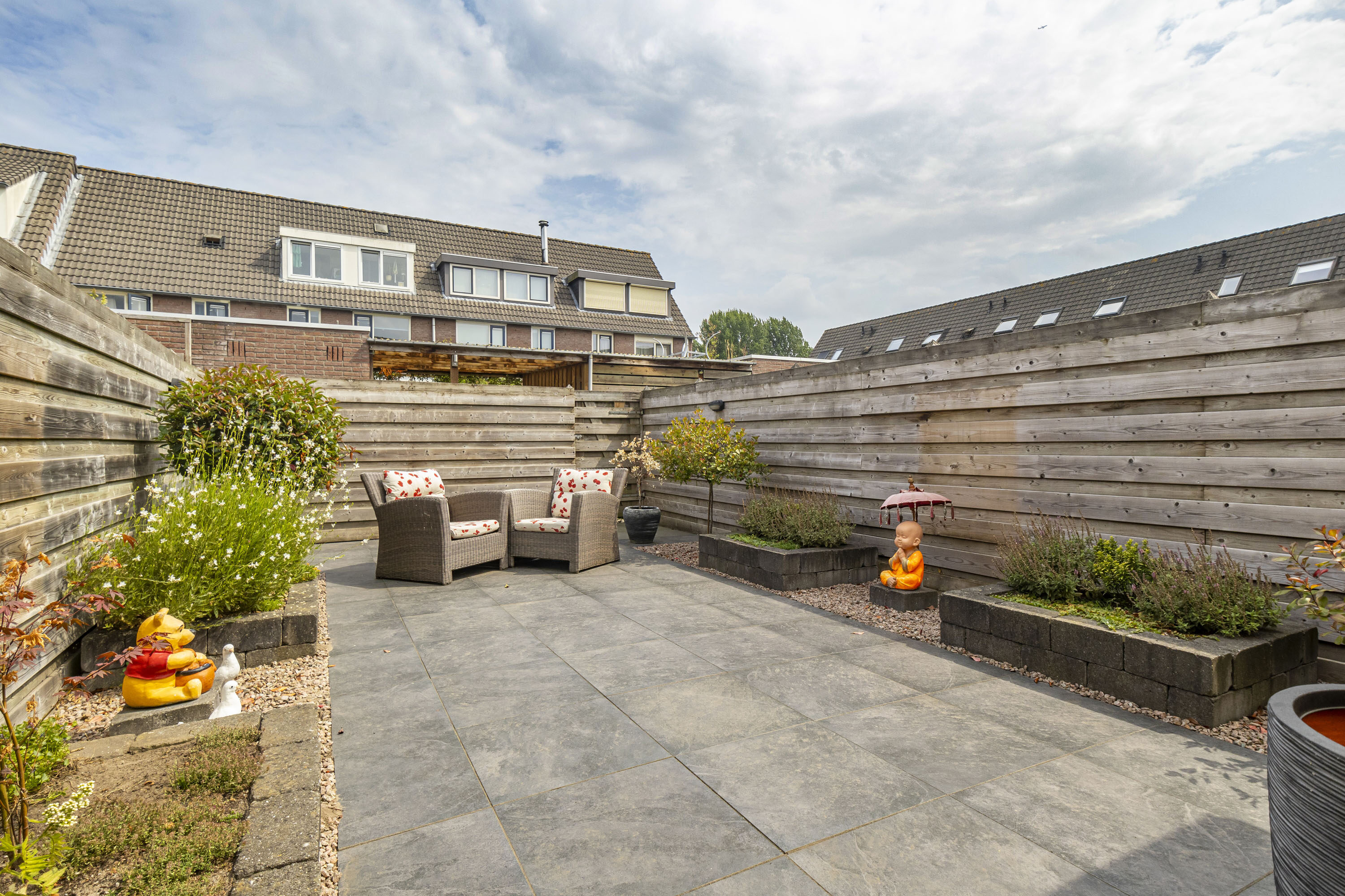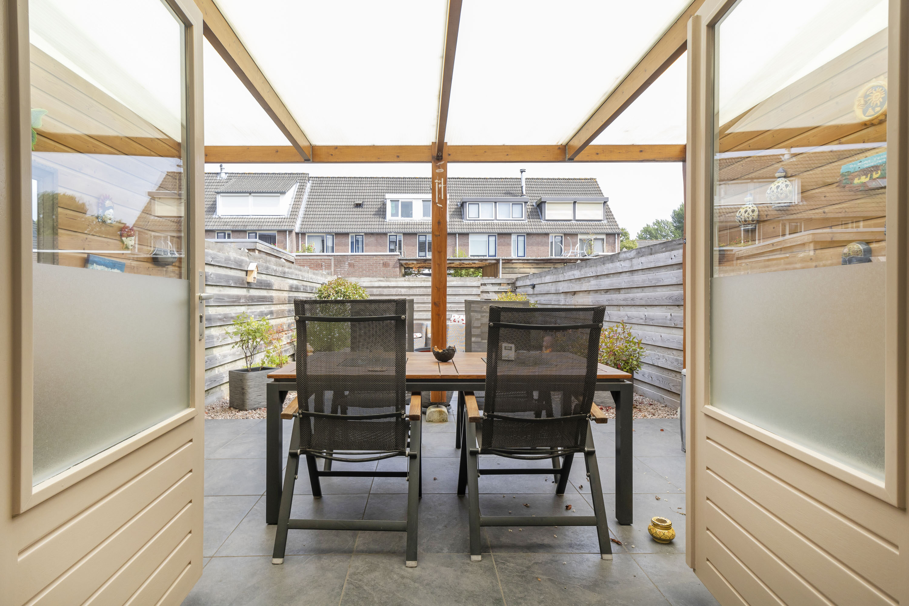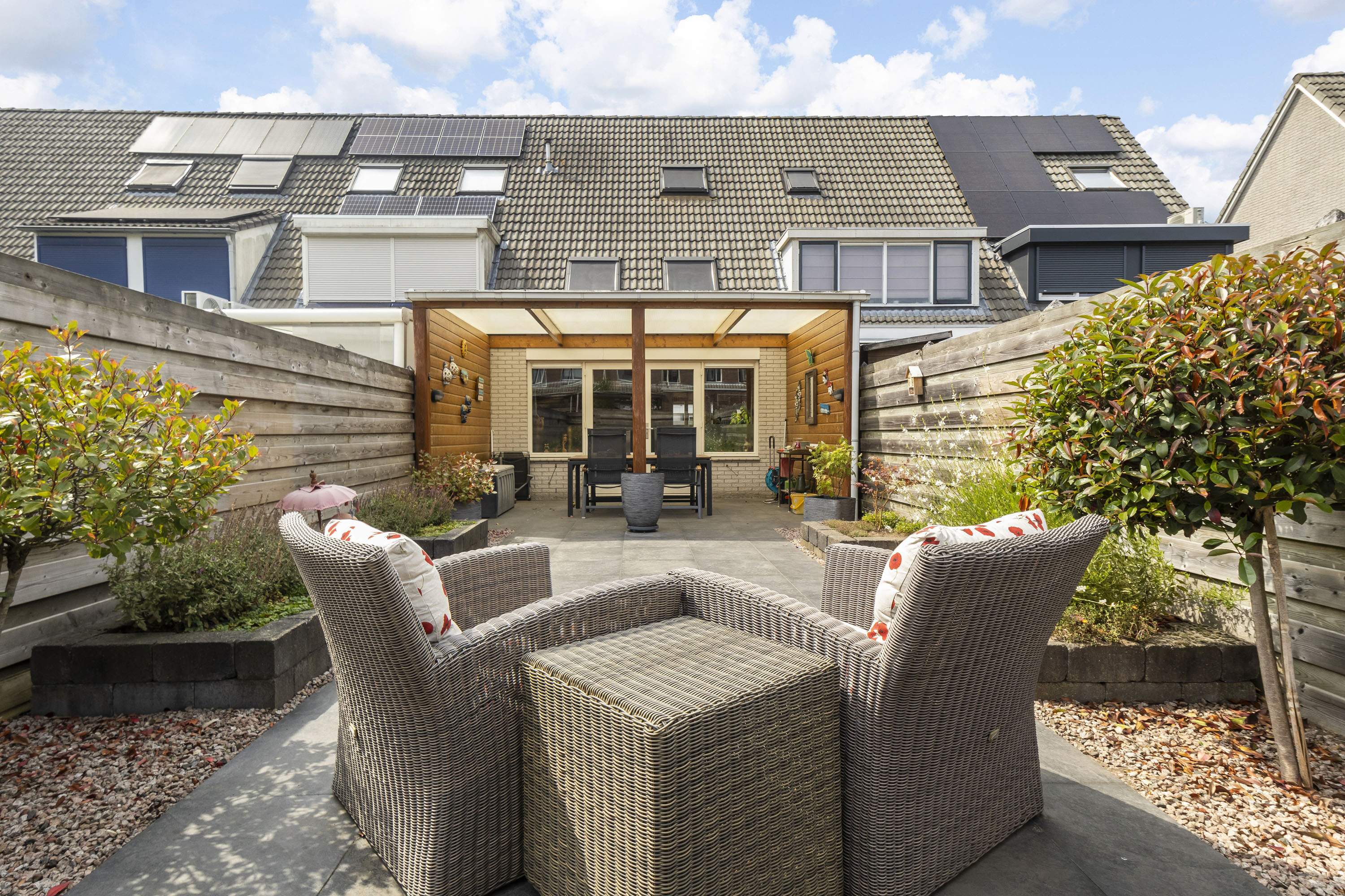 De diepe achtertuin op het zuidoosten beschikt over een ruime overkapping, waardoor je bijna het hele jaar buiten kunt zitten. De tuin is verzorgd aangelegd en biedt privacy en een achterom.