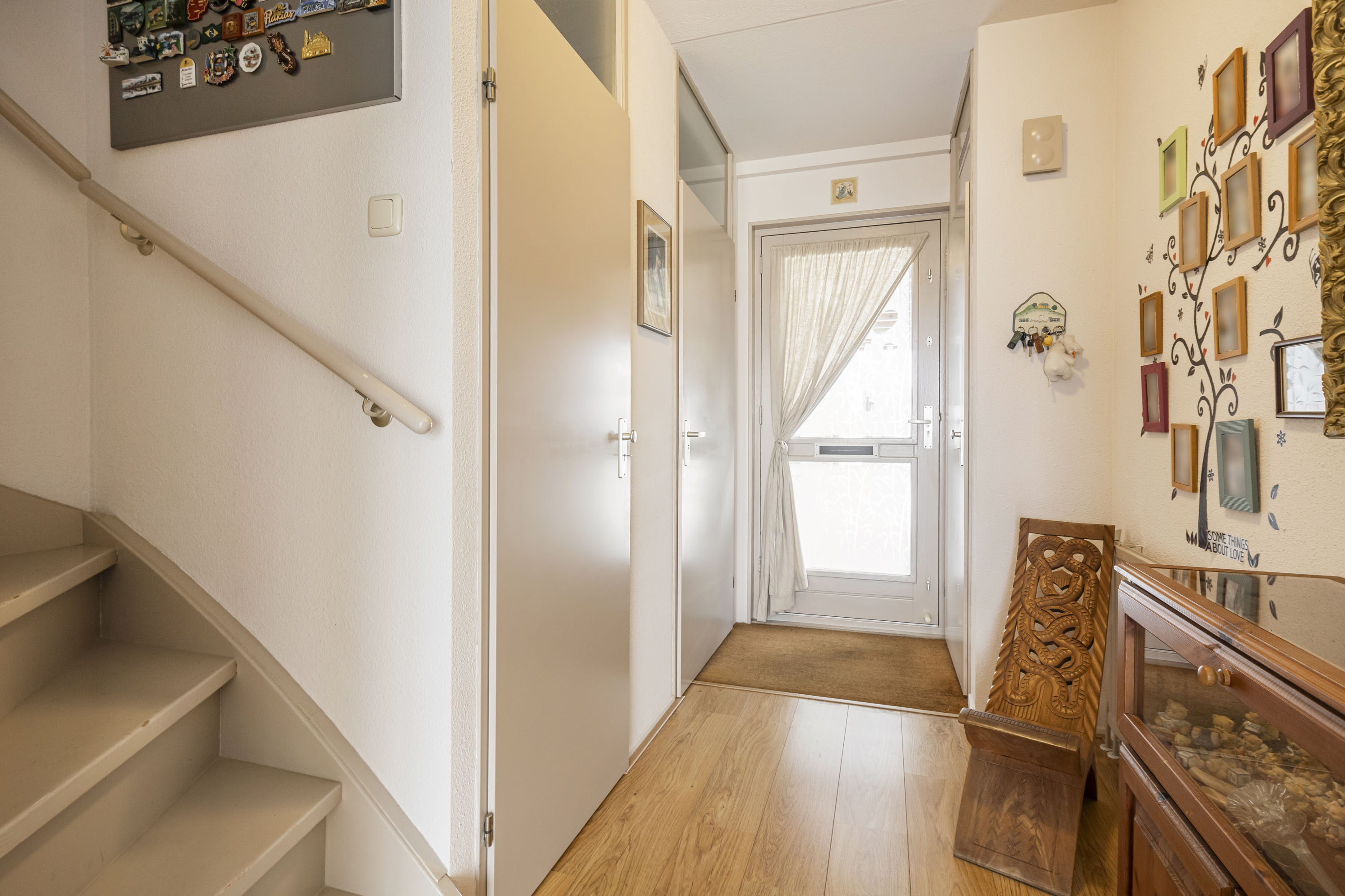 Via de carport aan de voorzijde kom je binnen in de hal met meterkast, modern toilet met fonteintje en trapopgang. De ruime woonkamer van ca. 35 m² is voorzien van een lichte laminaat vloer en openslaande deuren naar de zonnige tuin. De keuken aan de voorzijde is ingericht met inbouwapparatuur zoals een inductiekookplaat en oven.