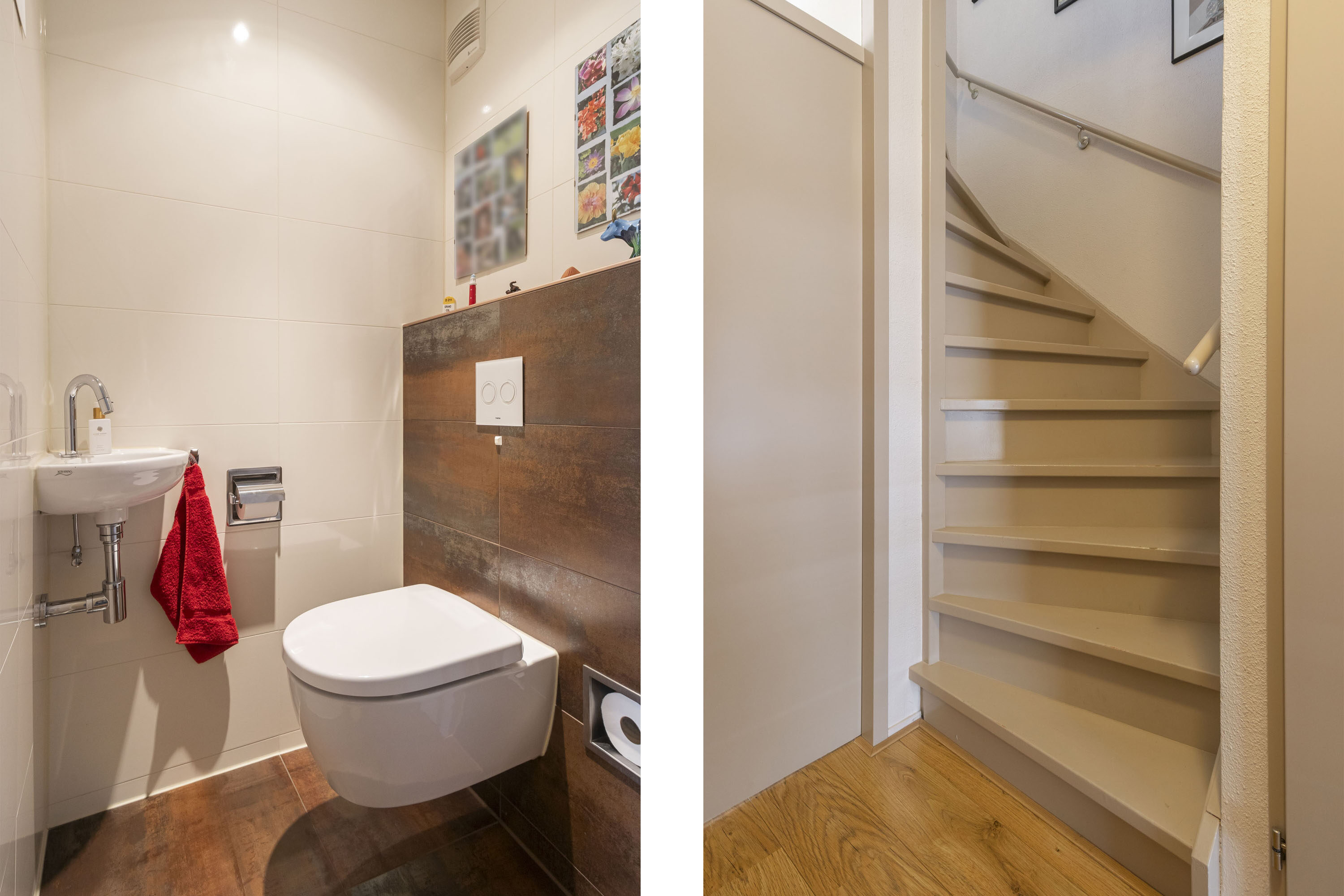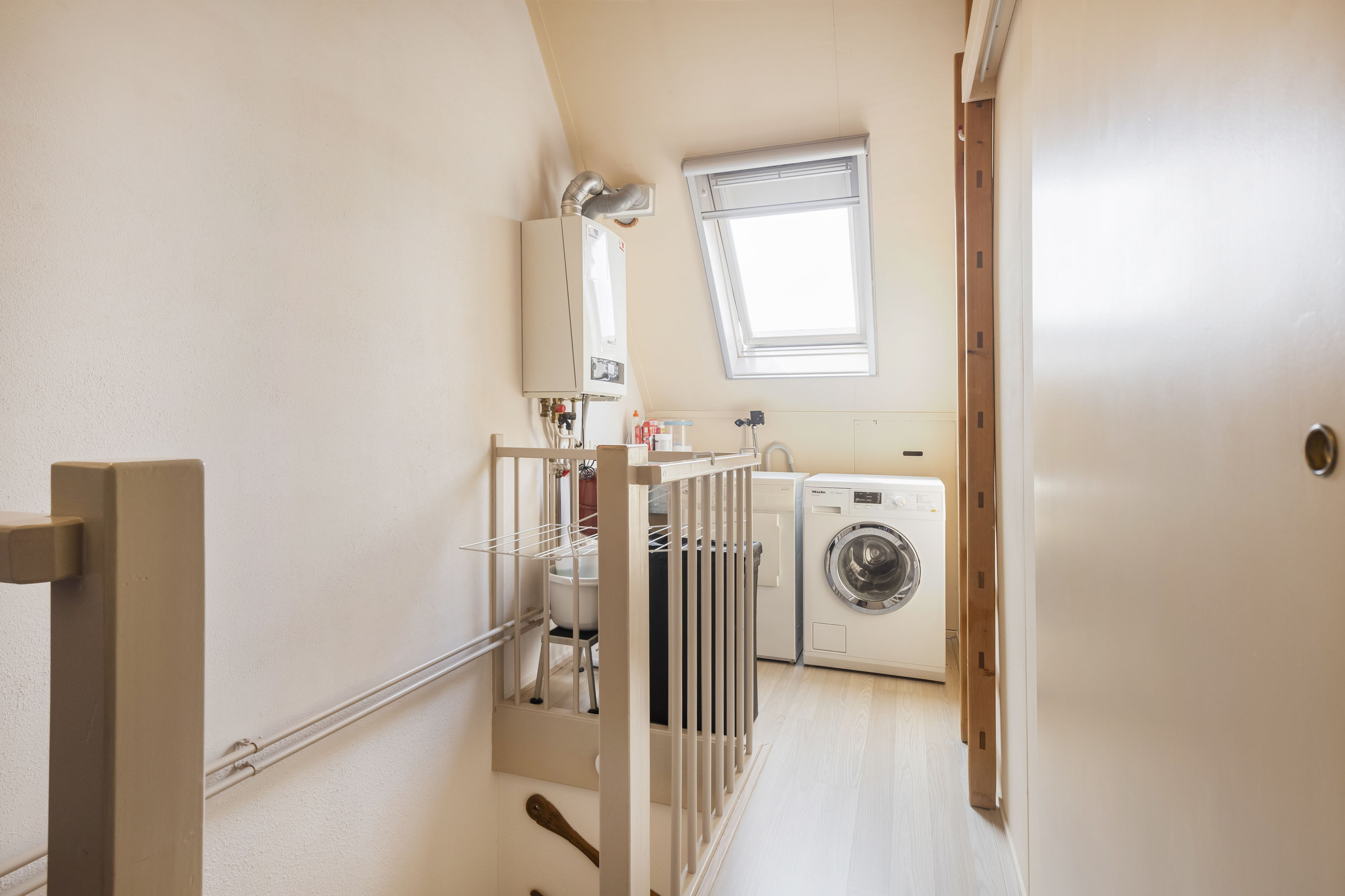 De overloop (ca. 7 m²) is ingericht als praktische wasruimte met aansluitingen voor wasmachine en droger, evenals de opstelling van de cv-installatie.