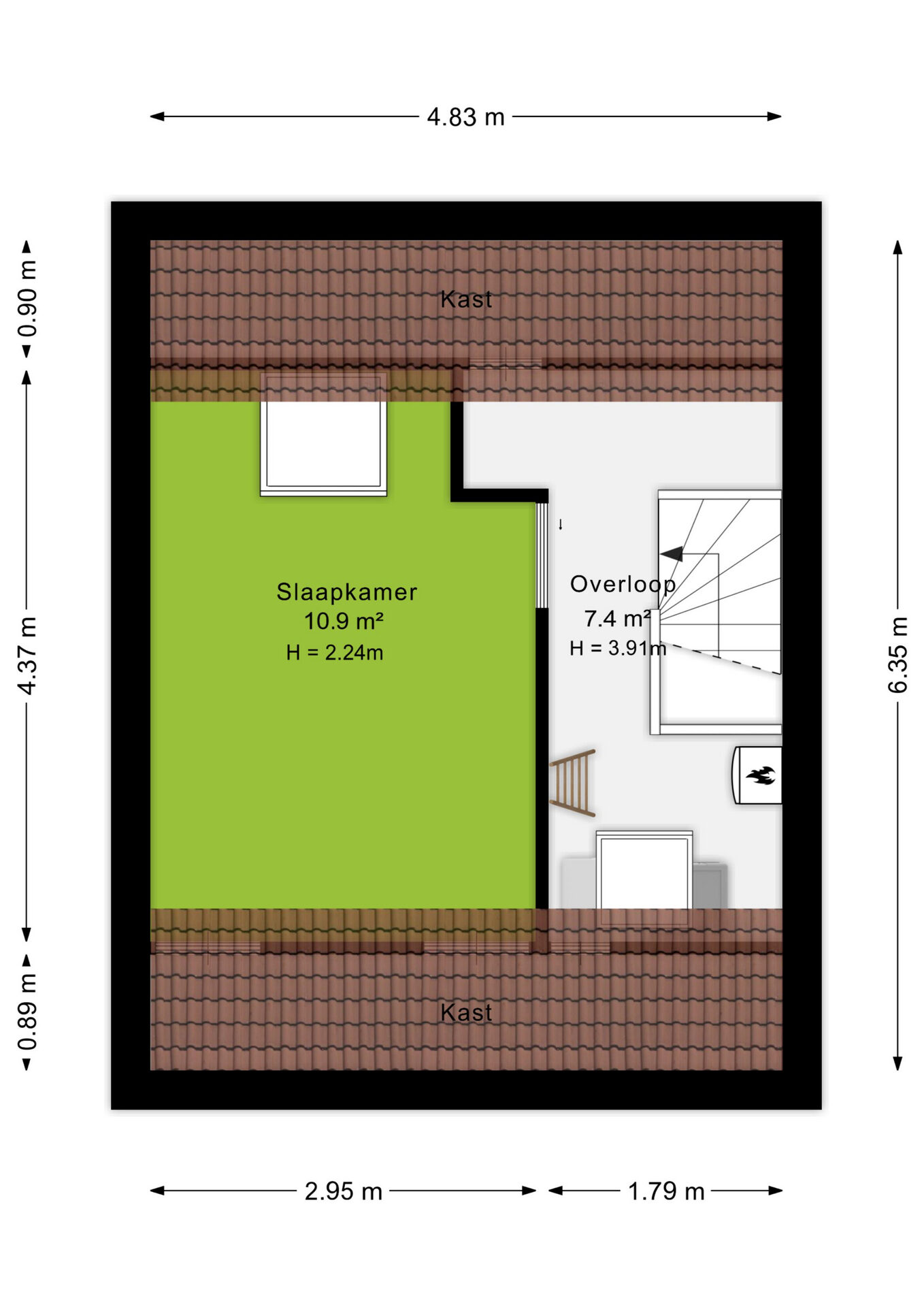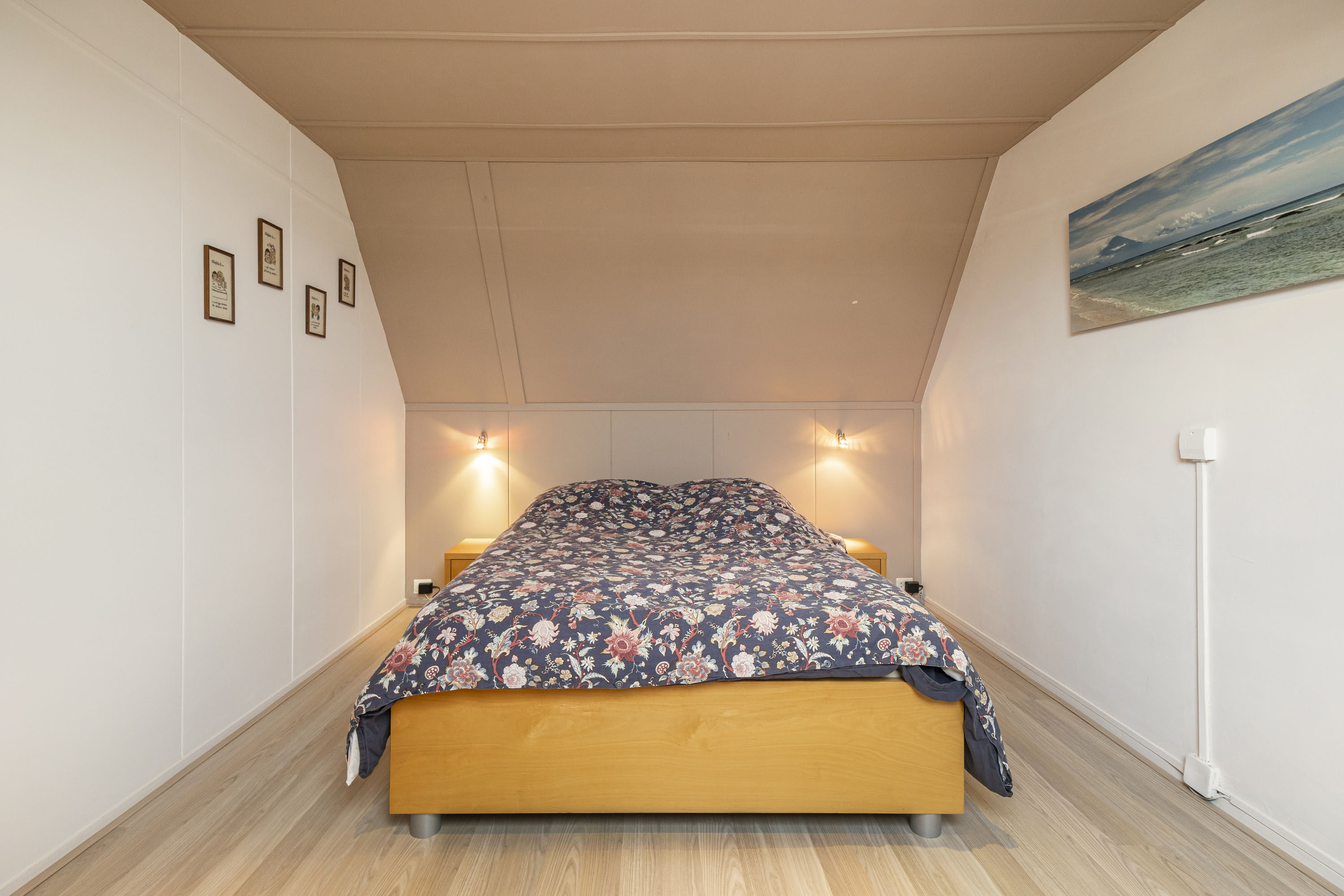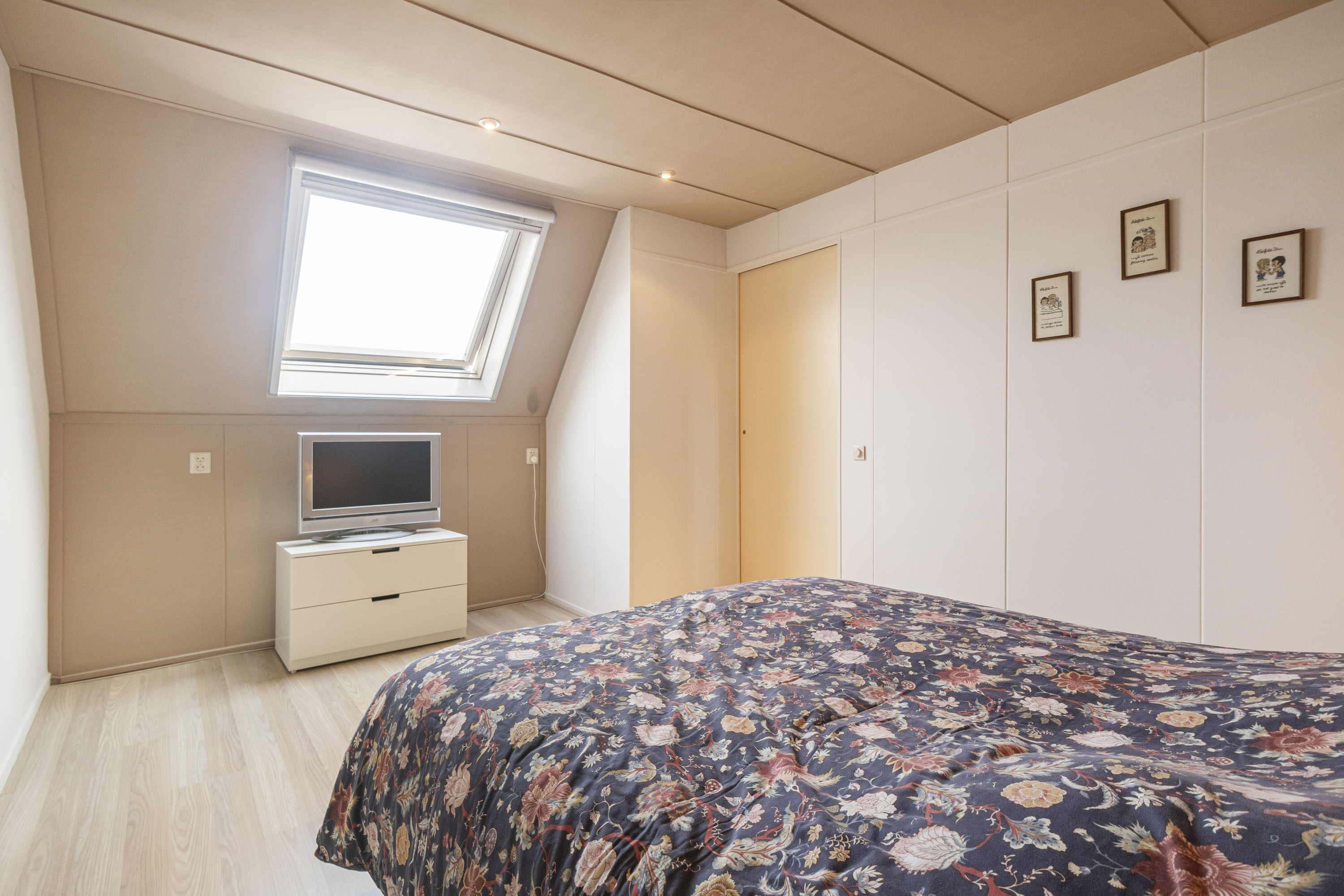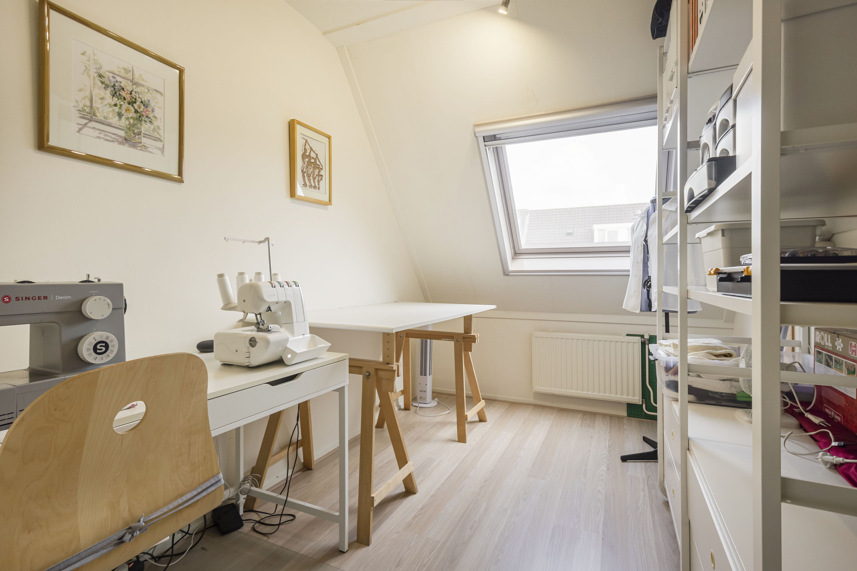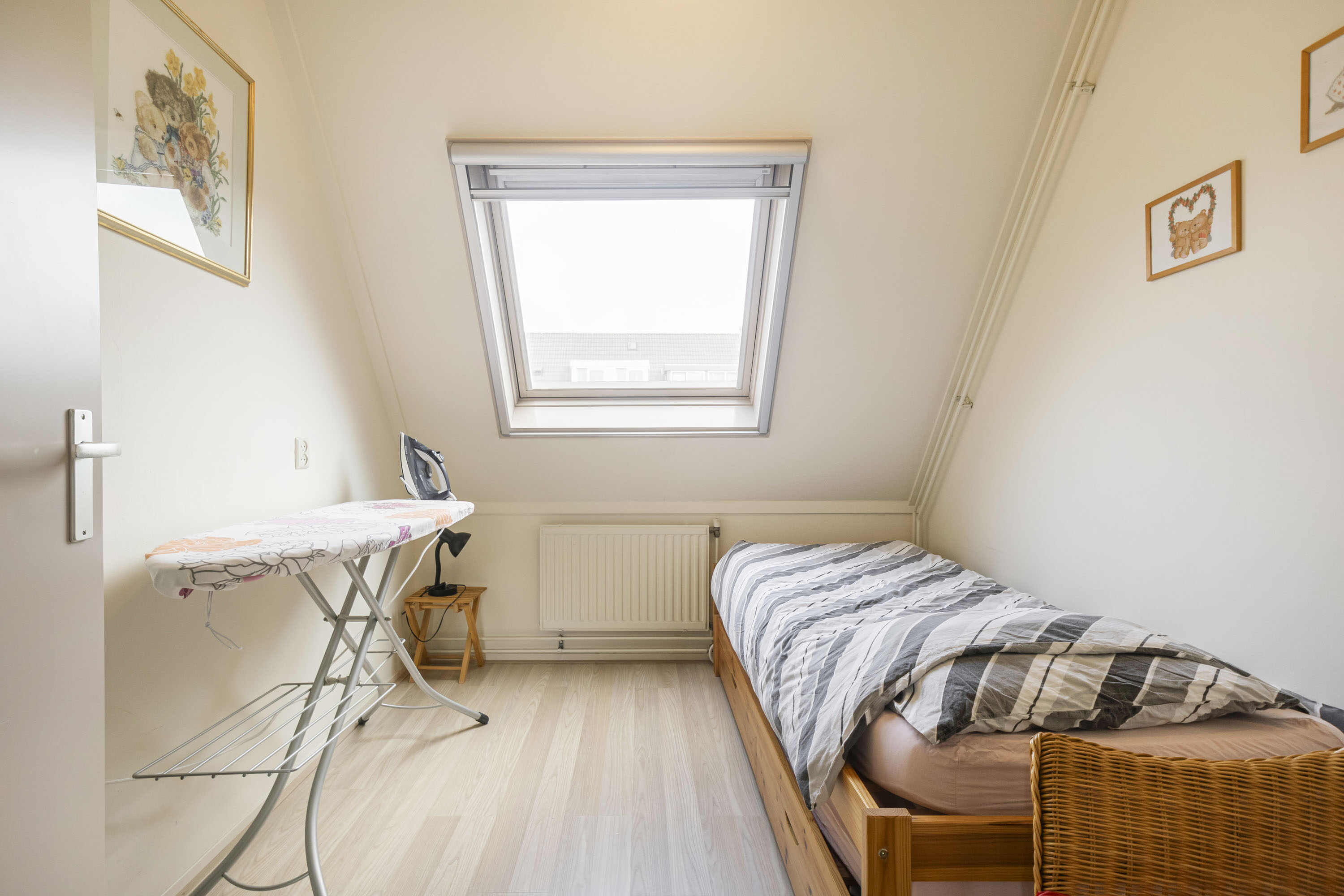 De zolderverdieping is verrassend ruim en biedt plaats aan een royale vierde slaapkamer van ca. 11 m², momenteel in gebruik als masterbedroom. Dankzij het dakraam profiteert deze kamer van prettig natuurlijk licht.