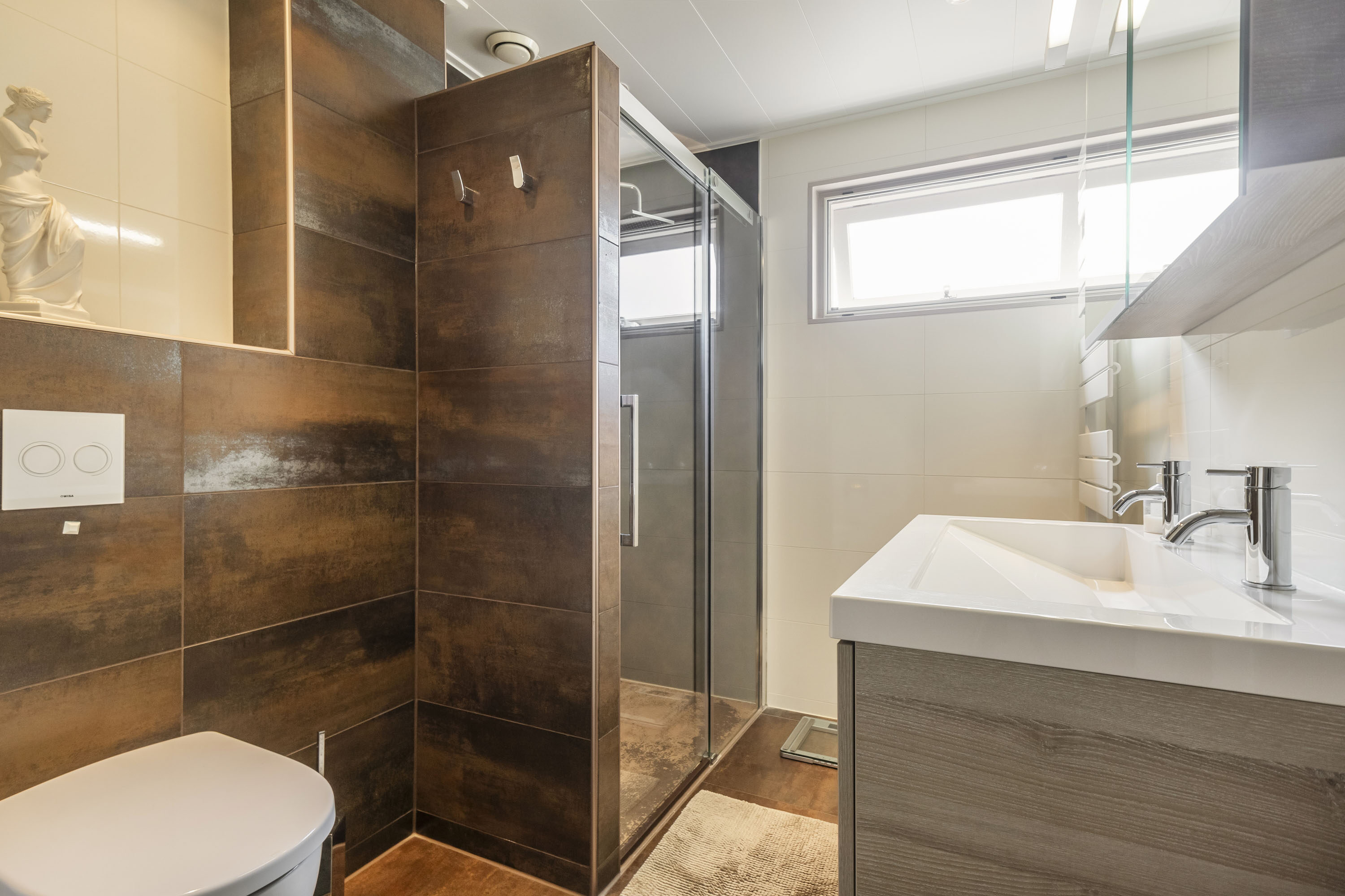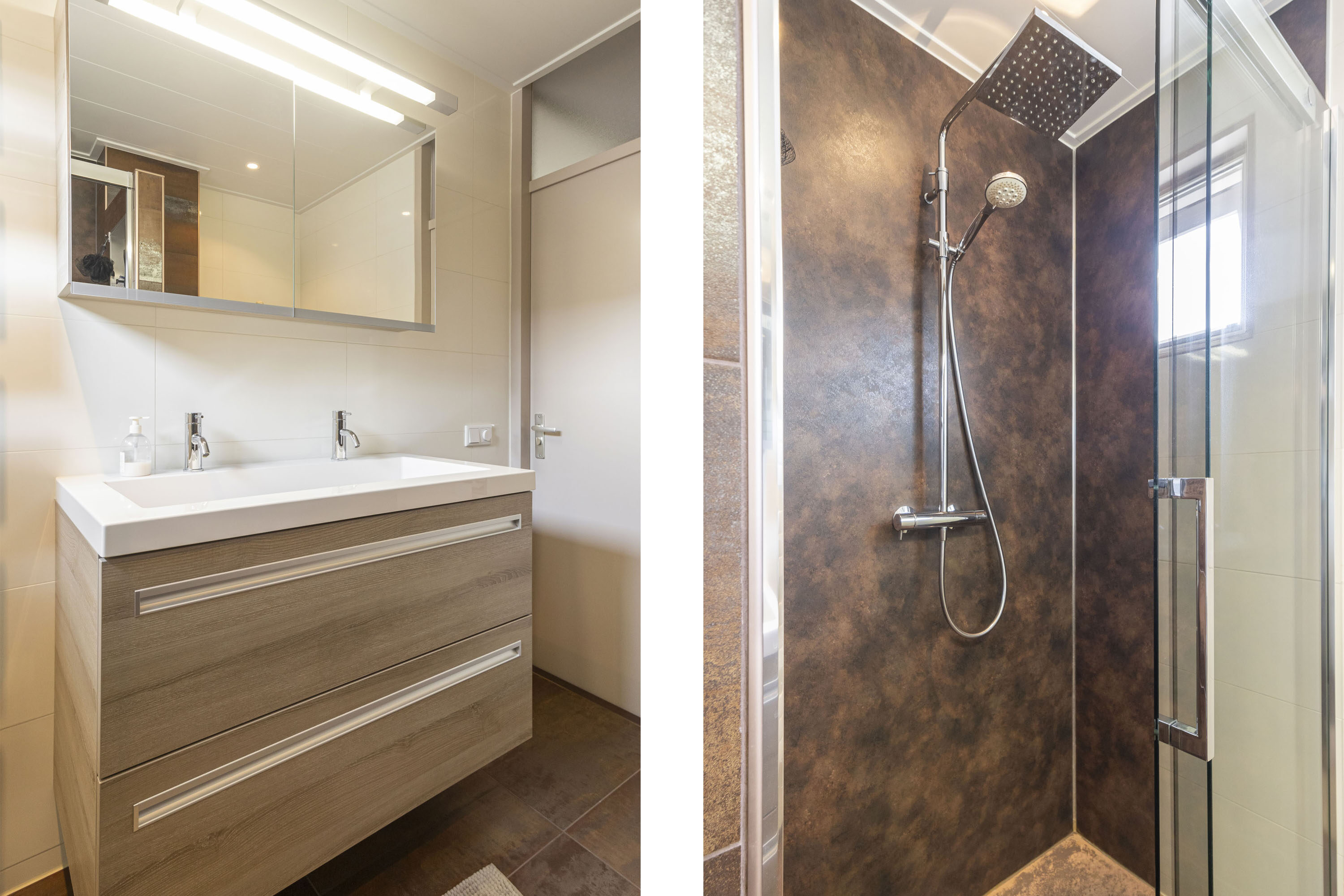 De badkamer (ca. 5 m²) is voorzien van een inloopdouche, tweede toilet en dubbele wastafelmeubel.