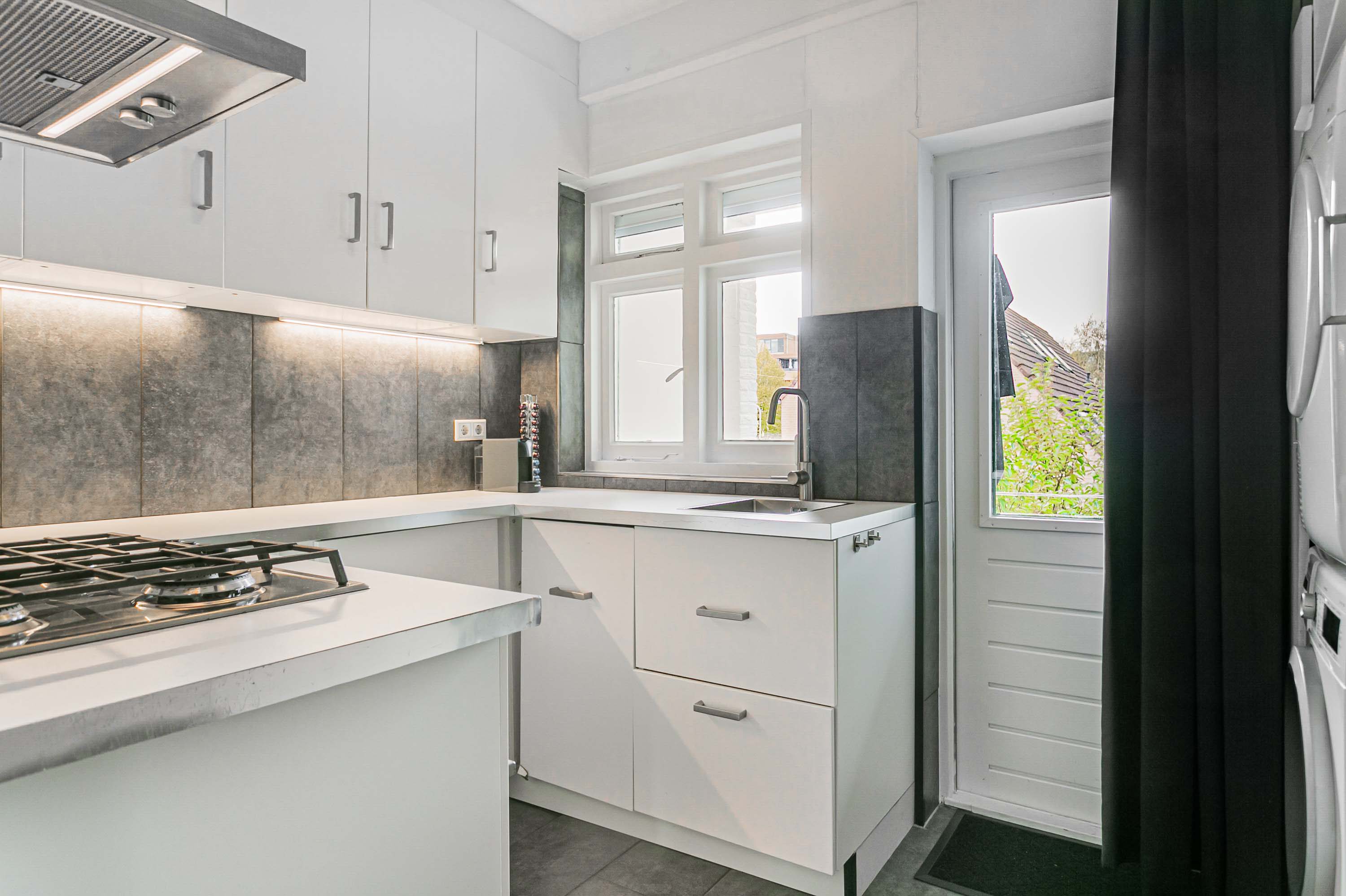De keuken is opgesteld in een praktische U-vorm en voorzien van een gasfornuis, afzuigkap, oven, magnetron, koel-vriescombinatie en vaatwasser. Hier bevindt zich ook de aansluiting voor de wasmachine en droger..