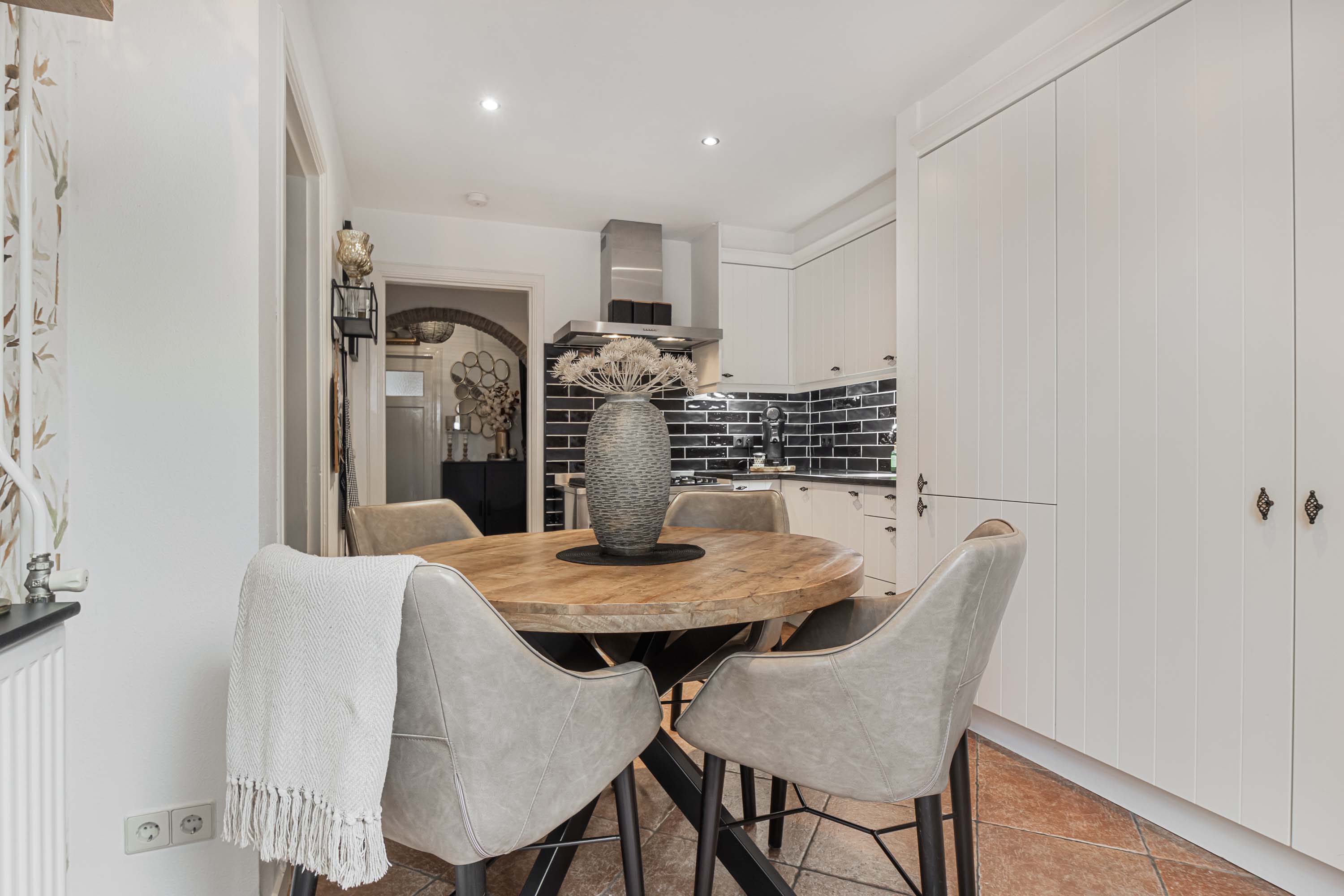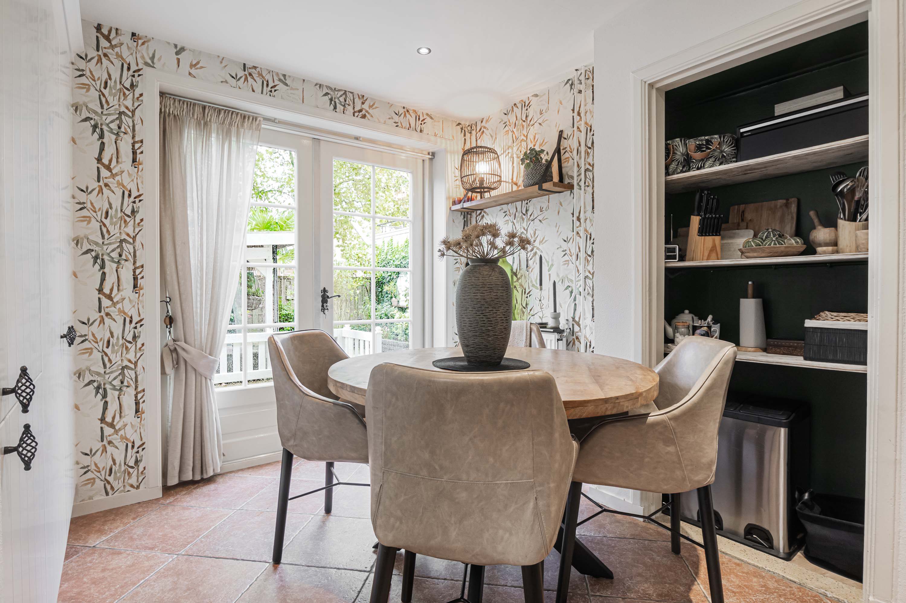 De hal biedt toegang tot alle vertrekken en is voorzien van een meterkast, een praktische bergkast en een toilet met fontein. De woonkamer aan de voorzijde is heerlijk licht en kijkt uit op de voortuin. Authentieke details zoals paneeldeuren en een vaste servieskast geven het geheel extra sfeer.