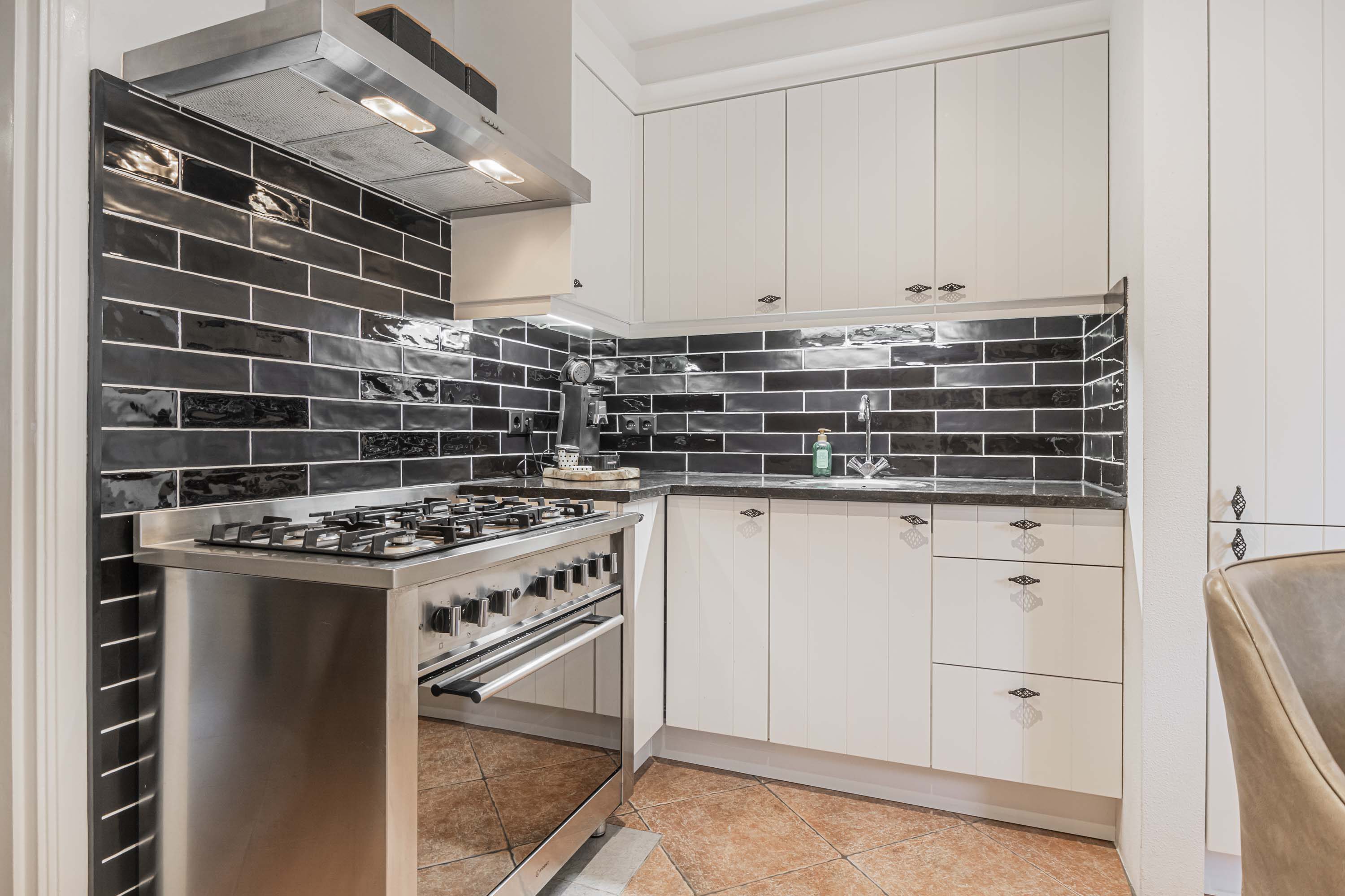 De eetkeuken aan de achterzijde is uitgevoerd in een lichte kleurstelling en uitgerust met een 5-pits gasfornuis met oven, afzuigkap, vaatwasser, magnetron, koelkast en veel kastruimte. Hier bevindt zich ook de CV-combiketel (Remeha, 2019) in een aparte kast.
