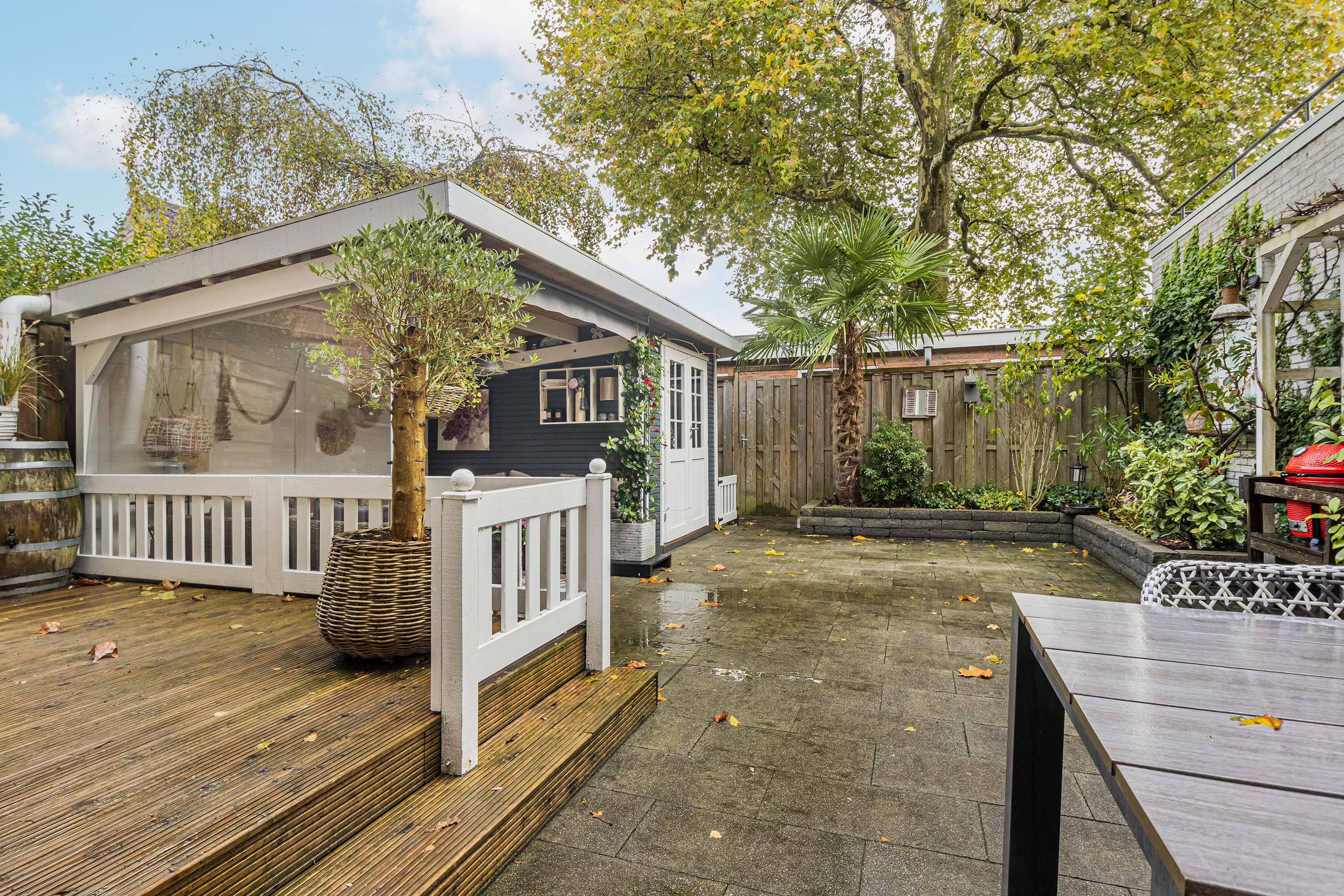 De voortuin is groen aangelegd en biedt ruimte voor een auto. De achtertuin is royaal, zonnig gelegen op het zuidwesten en beschikt over een achterom en een heerlijke veranda met aangebouwde berging/tuinhuis. Daarnaast is een extra berging aanwezig achter het complex.