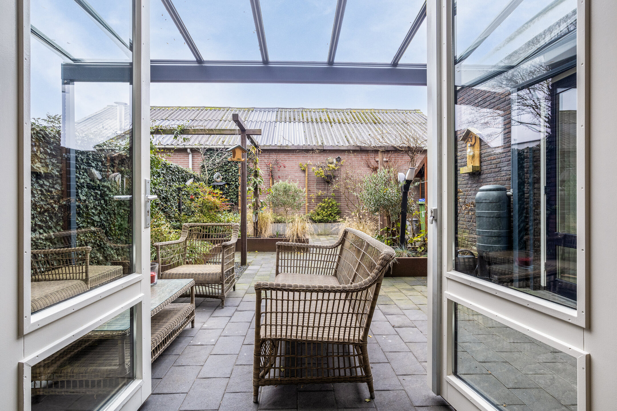 Heerlijke overkapping om zo nog meer te genieten van de onderhoudsarme tuin en het buitenleven.