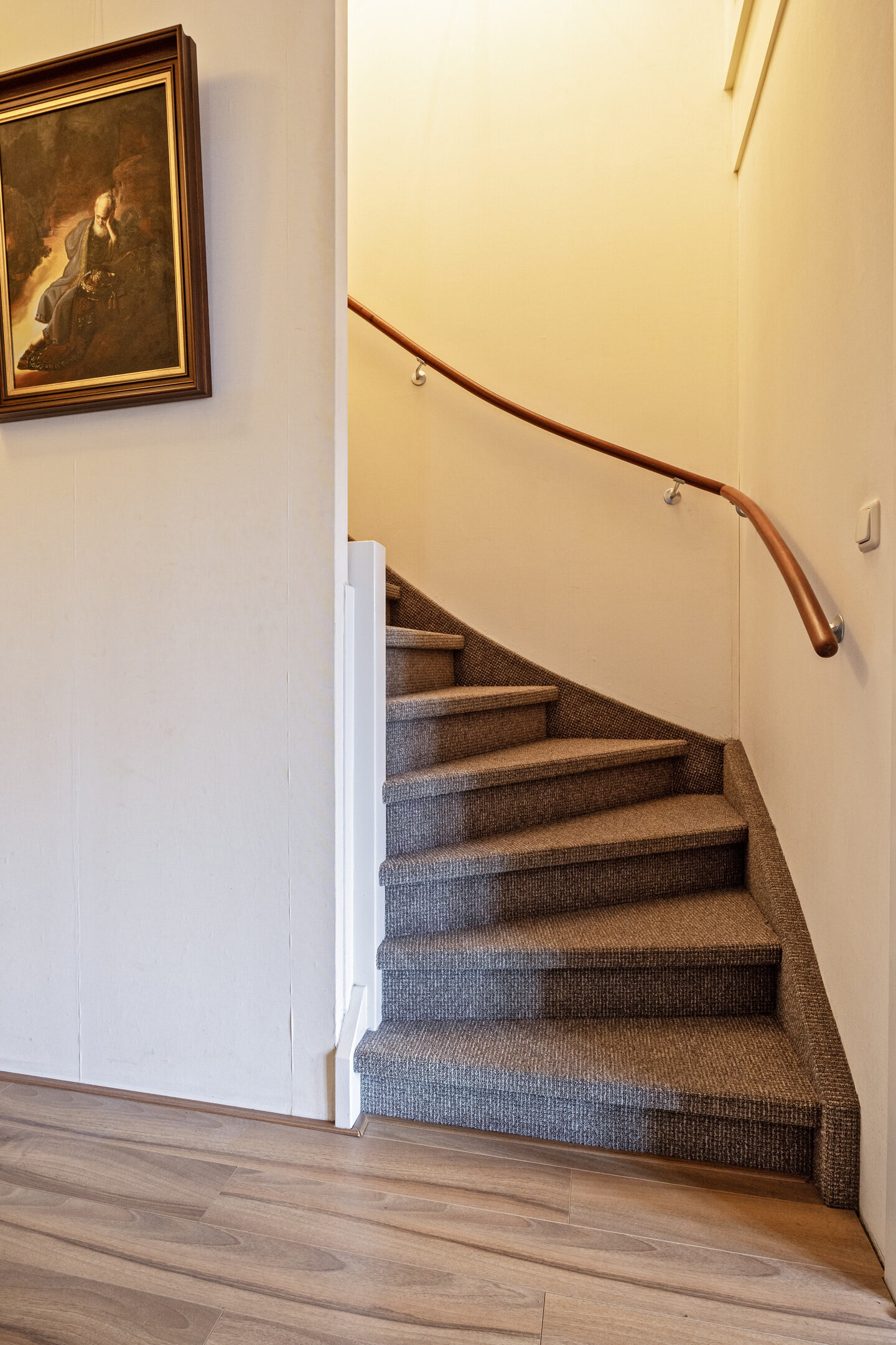 Ruime entree/hal, meterkast, garderobe, toiletruimte met zwevend toilet, fonteintje en licht tegelwerk, trapopgang naar de 1e verdieping. Vanuit de hal komt men in de L-vormige woonkamer met sfeervolle gashaard, veel lichtinval en gezellige living. Grenzend aan de woonkamer de ruime moderne woonkeuken, diverse inbouwapparatuur en veel natuurlijk lichtinval door de openslaande tuindeuren en de raampartij. De gehele benedenverdieping is voorzien van vloerverwarming met uitzondering van het toilet en berging.