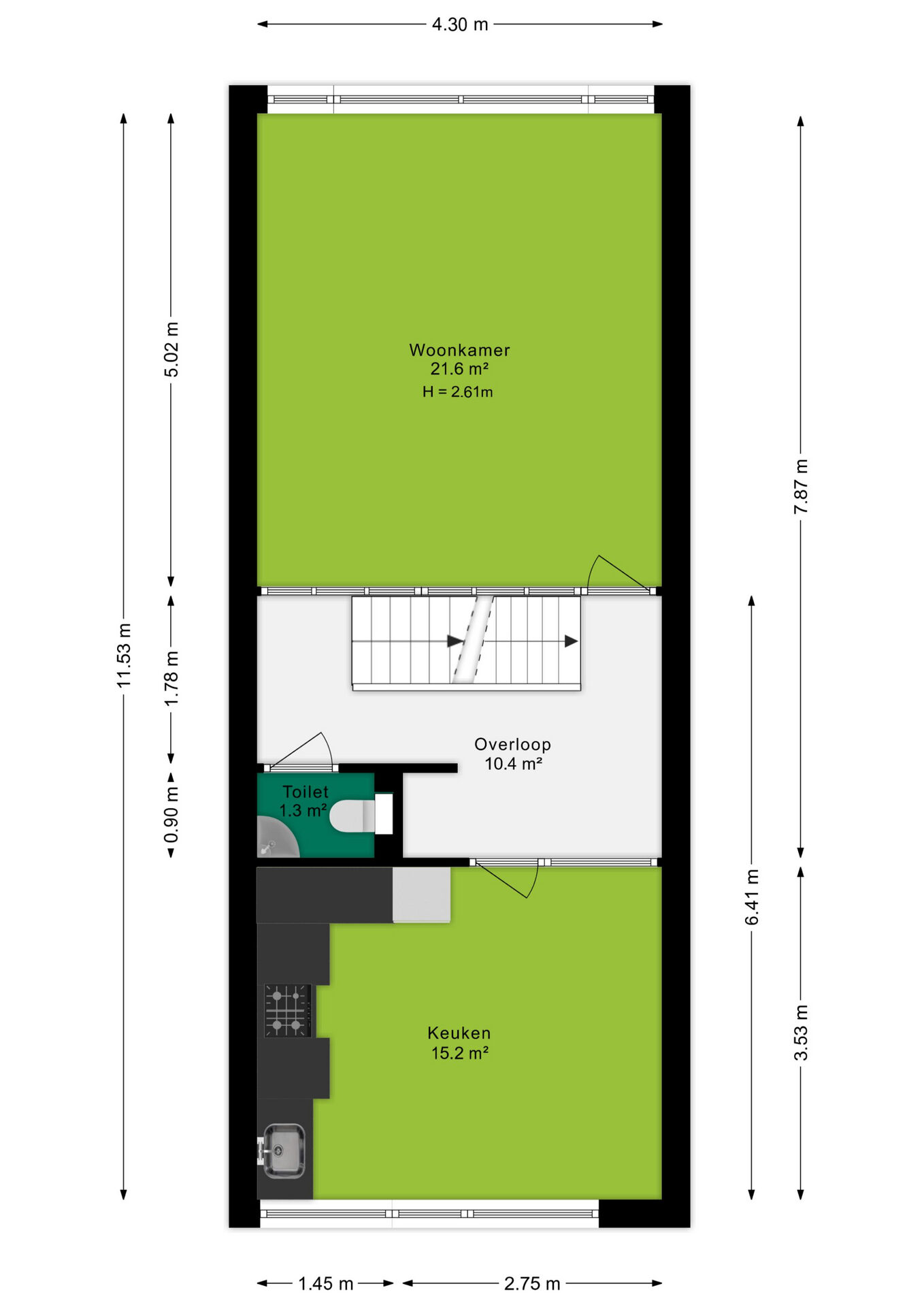 Op de eerste verdieping bevindt zich de leefruimte. De woonkamer van ca. 22 m² ligt aan de achterzijde en biedt een prettig uitzicht. De keuken aan de voorzijde is ingericht met een gasfornuis, oven, afzuigkap en koelkast. De overloop biedt daarnaast toegang tot het separate toilet.