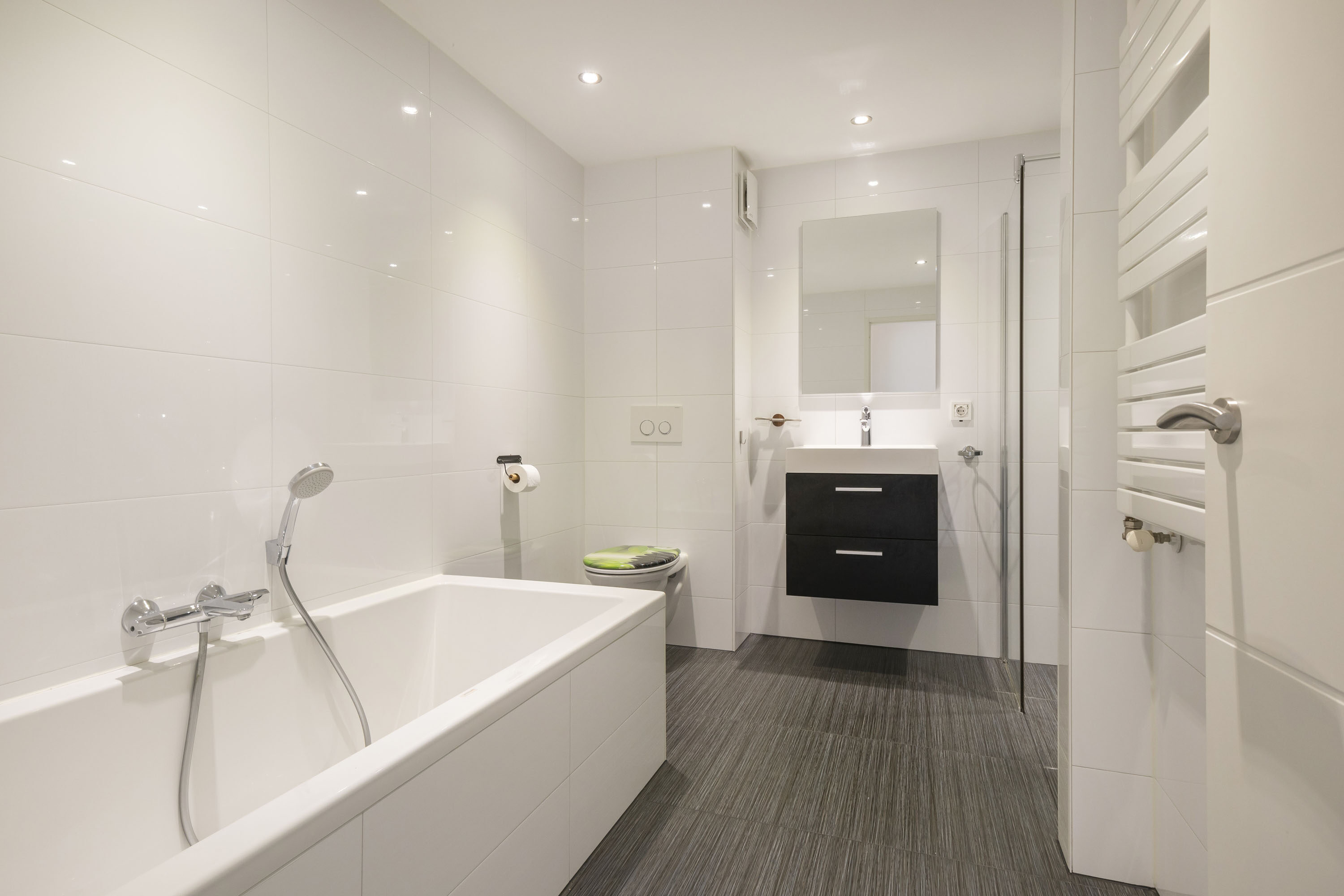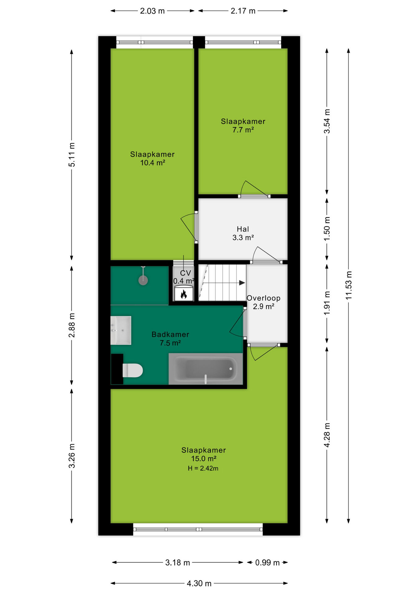 Hier bevinden zich nog drie slaapkamers van ca. 15 m², 10 m² en 8 m². In de slaapkamer van 10 m² bevindt zich een kast met de cv-ketel. De badkamer is netjes en voorzien van een ligbad, inloopdouche, toilet en wastafel met meubel.