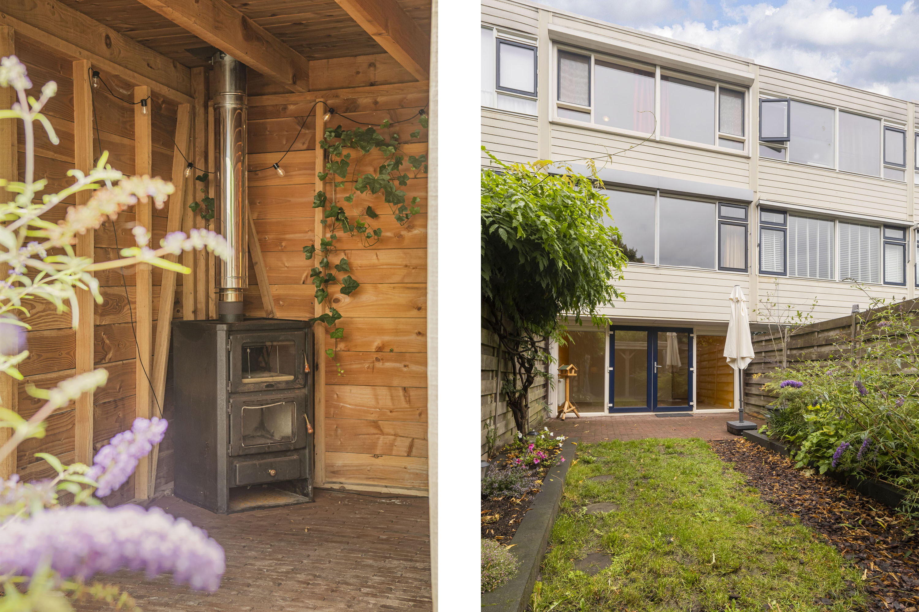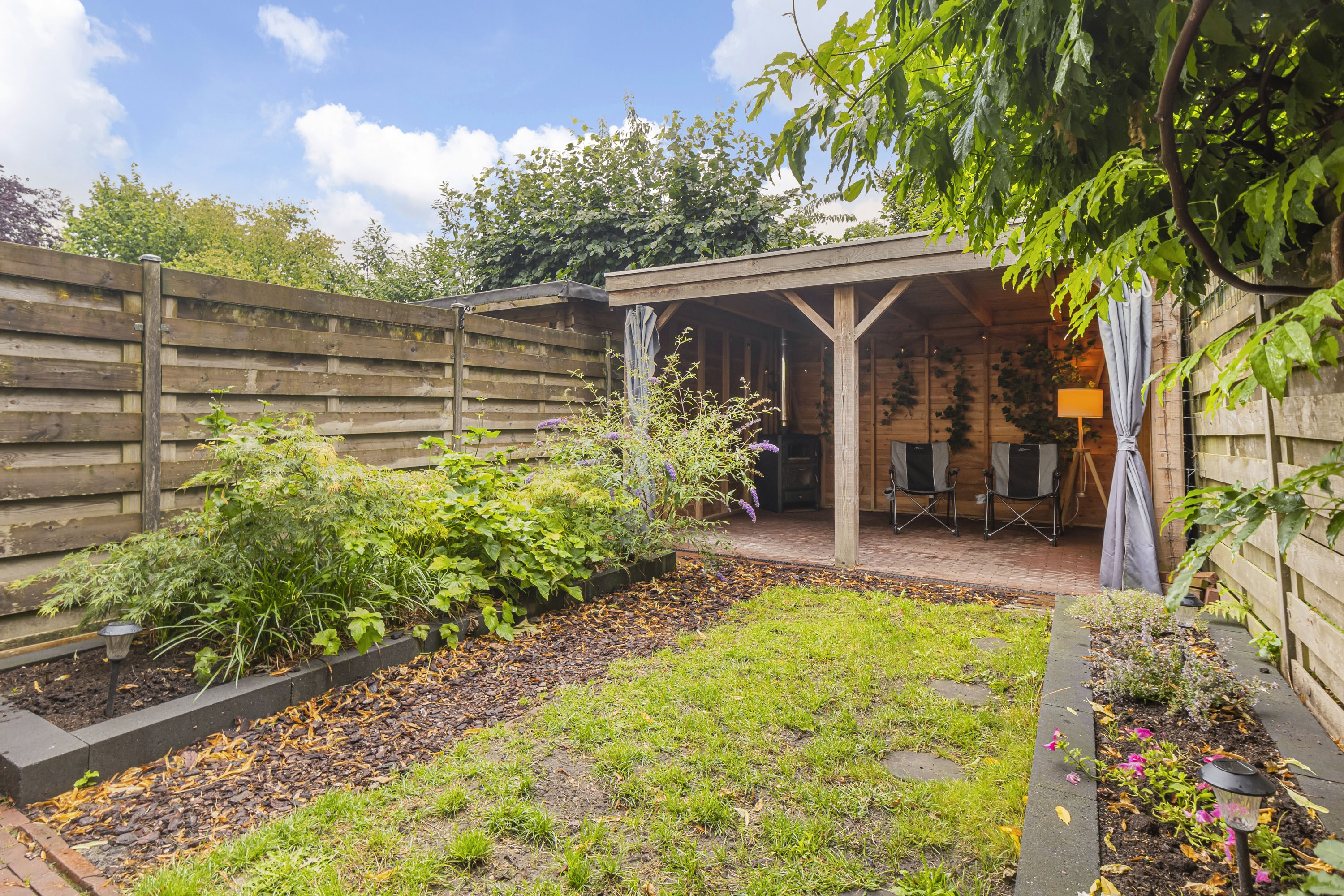 De tuin is een groot pluspunt: gelegen op het zuiden, ca. 10 meter diep en 5 meter breed, met een heerlijk zonnige ligging. Achterin de tuin is een veranda geplaatst met sfeervolle houtkachel – perfect om in elk seizoen buiten te kunnen zitten.