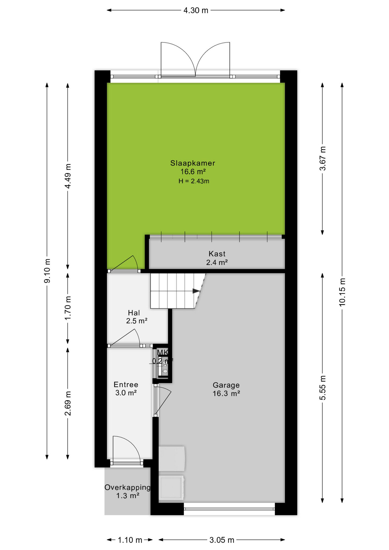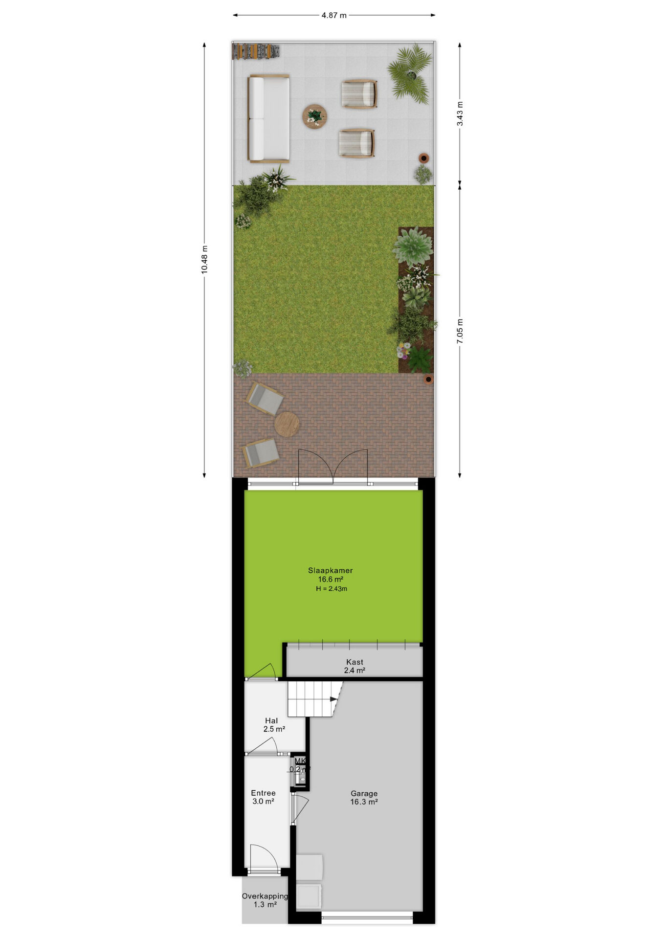 Bij binnenkomst tref je direct de inpandige garage, zowel van binnen als van buiten toegankelijk. Vanuit de hal kom je in een multifunctionele kamer: ideaal als slaapkamer, kantoor aan huis of hobbyruimte. Deze ruimte biedt directe toegang tot de tuin, gelegen op het zuiden.