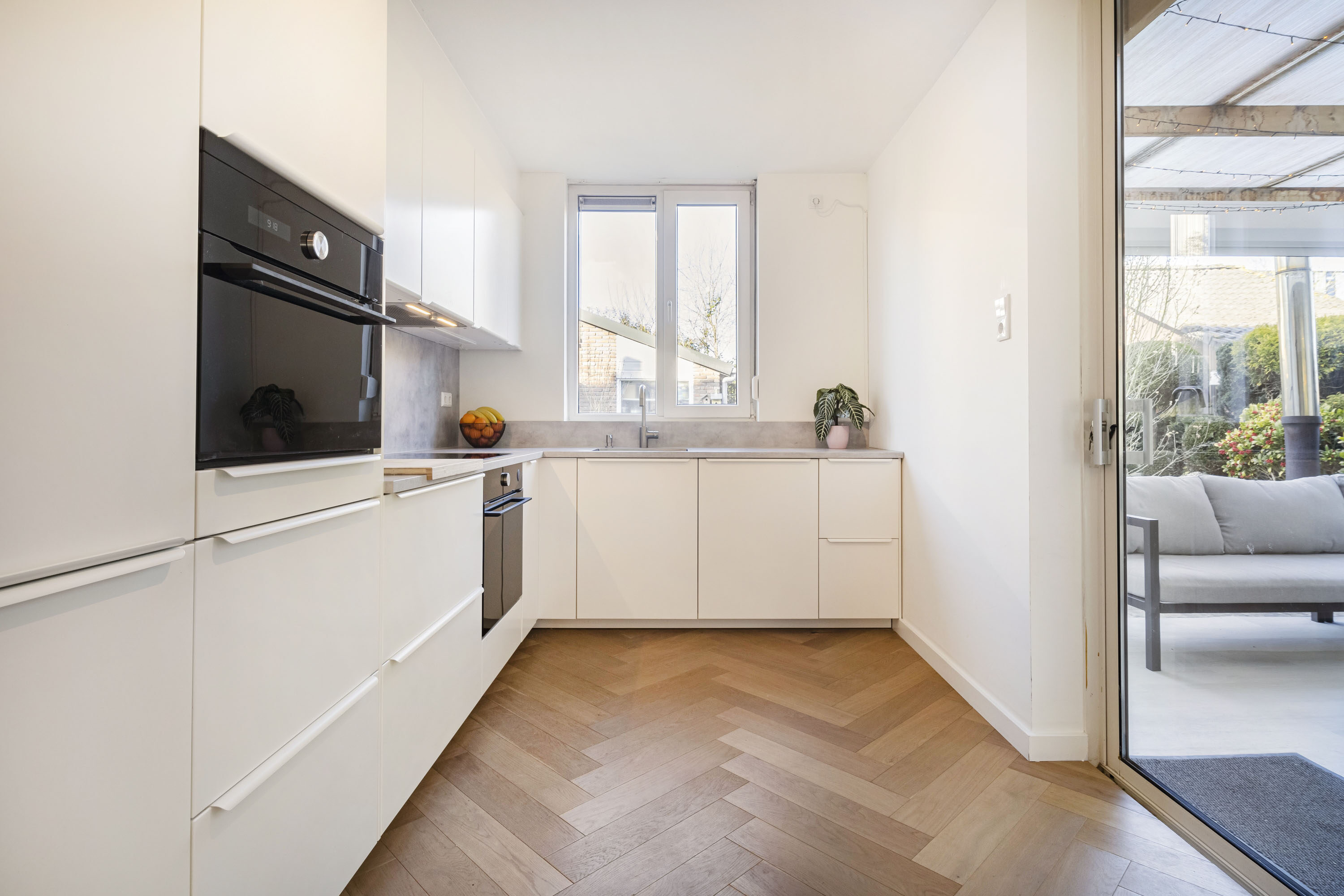 Er is een uitbouw aan de woning waarin de open keuken is gesitueerd. De luxe nieuwe inbouwkeuken is in hoekopstelling geplaatst. Het geheel heeft een neutrale lichte kleurstelling en beschikt over diverse inbouwapparatuur, te weten een vaatwasser, koelkast en vriezer, oven, combimagnetron, inductie kookplaat en een afzuigkap.