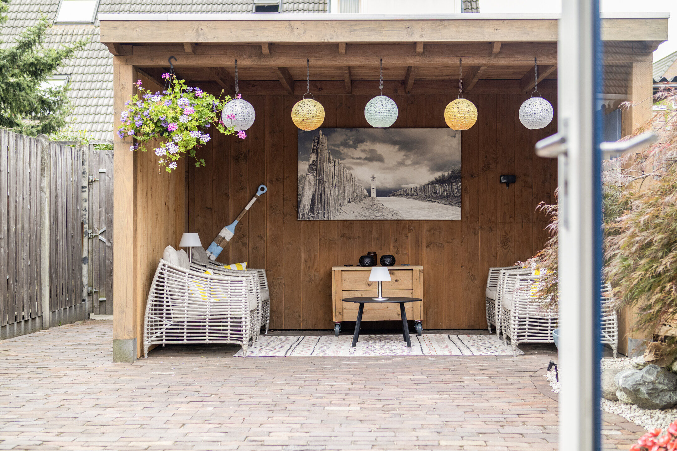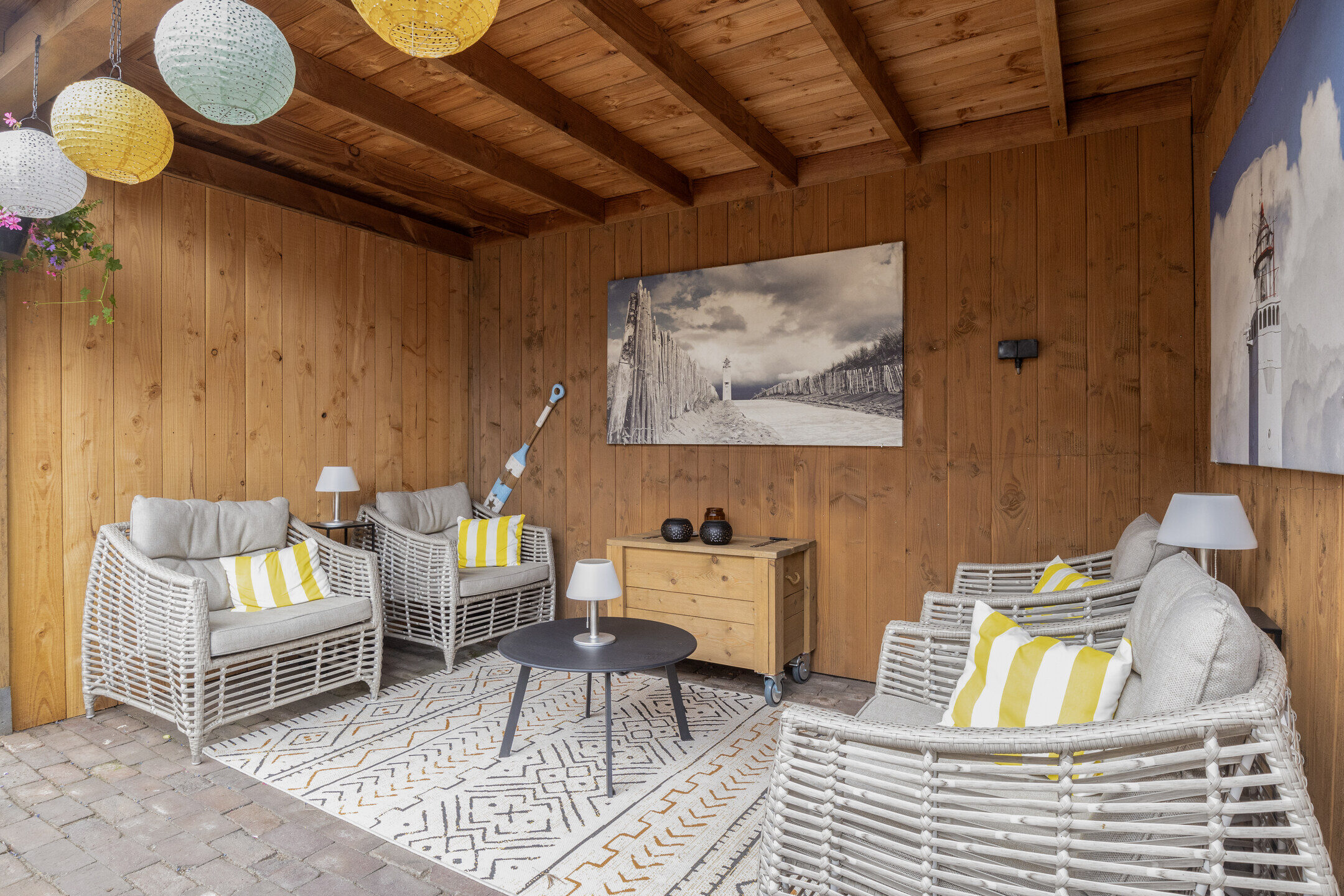 Vanuit de woonkamer stap je direct de prachtige tuin in, een oase van rust en verzorging. De tuin is grotendeels bestraat, wat zorgt voor een onderhoudsvriendelijke en nette uitstraling. Achterin de tuin bevindt zich een sfeervolle veranda, waar je heerlijk beschut kunt zitten en genieten van de buitenlucht, ongeacht het weer. Deze veranda biedt de perfecte plek voor ontspanning, of je nu met een goed boek wilt relaxen of gezellig wilt dineren met vrienden en familie.