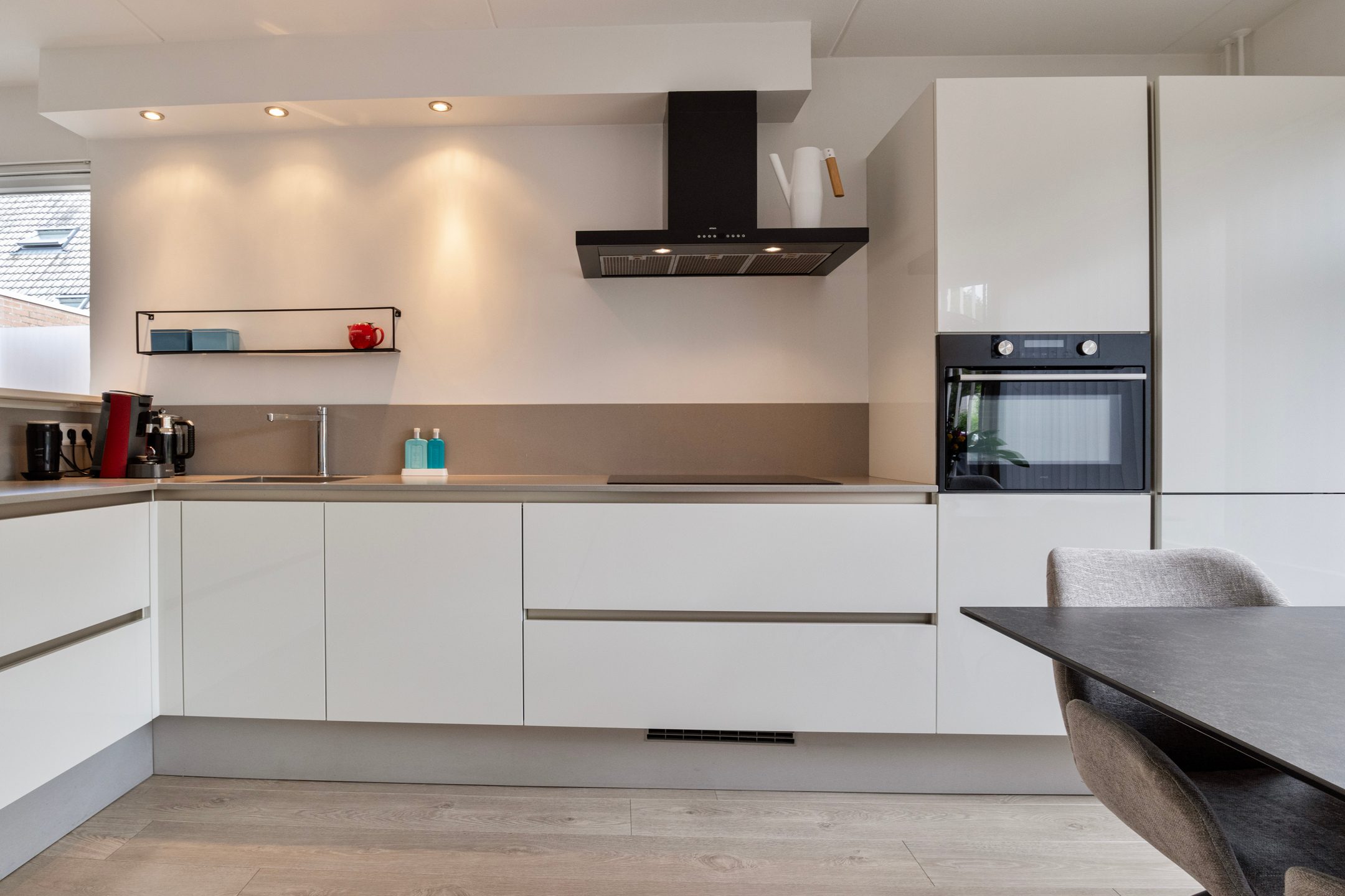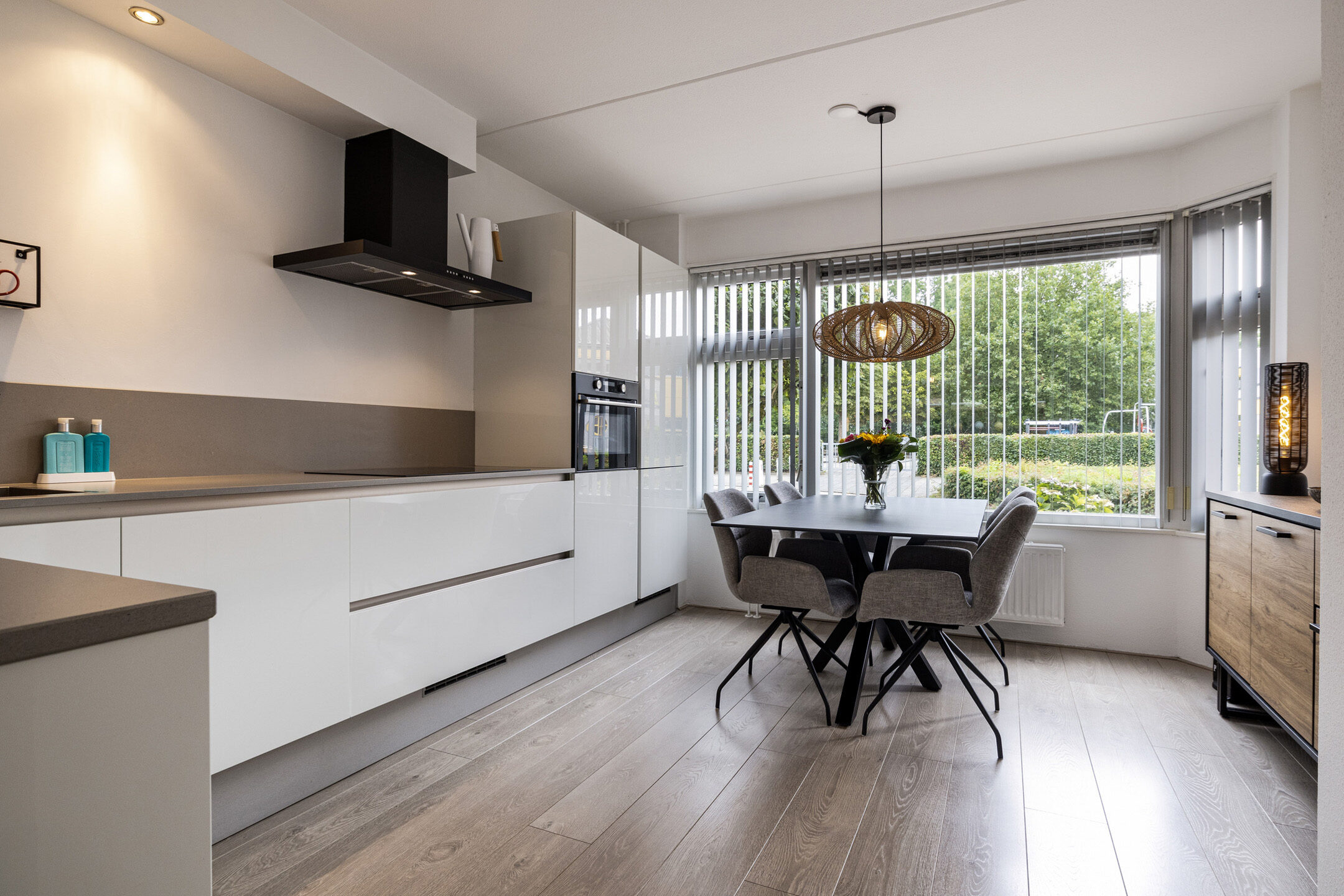Aan de zijkant van de woonkamer bevindt zich de keuken, die stijlvol is ingericht met lichte kleuren en een elegant composietenwerkblad. De keuken is van alle gemakken voorzien en biedt voldoende ruimte voor al uw culinaire activiteiten. Of u nu een snelle maaltijd wilt bereiden of een uitgebreid diner wilt samenstellen, deze keuken biedt de perfecte omgeving om uw kookkunsten tot hun recht te laten komen. De keuken beschikt over diverse inbouwapparatuur te weten: