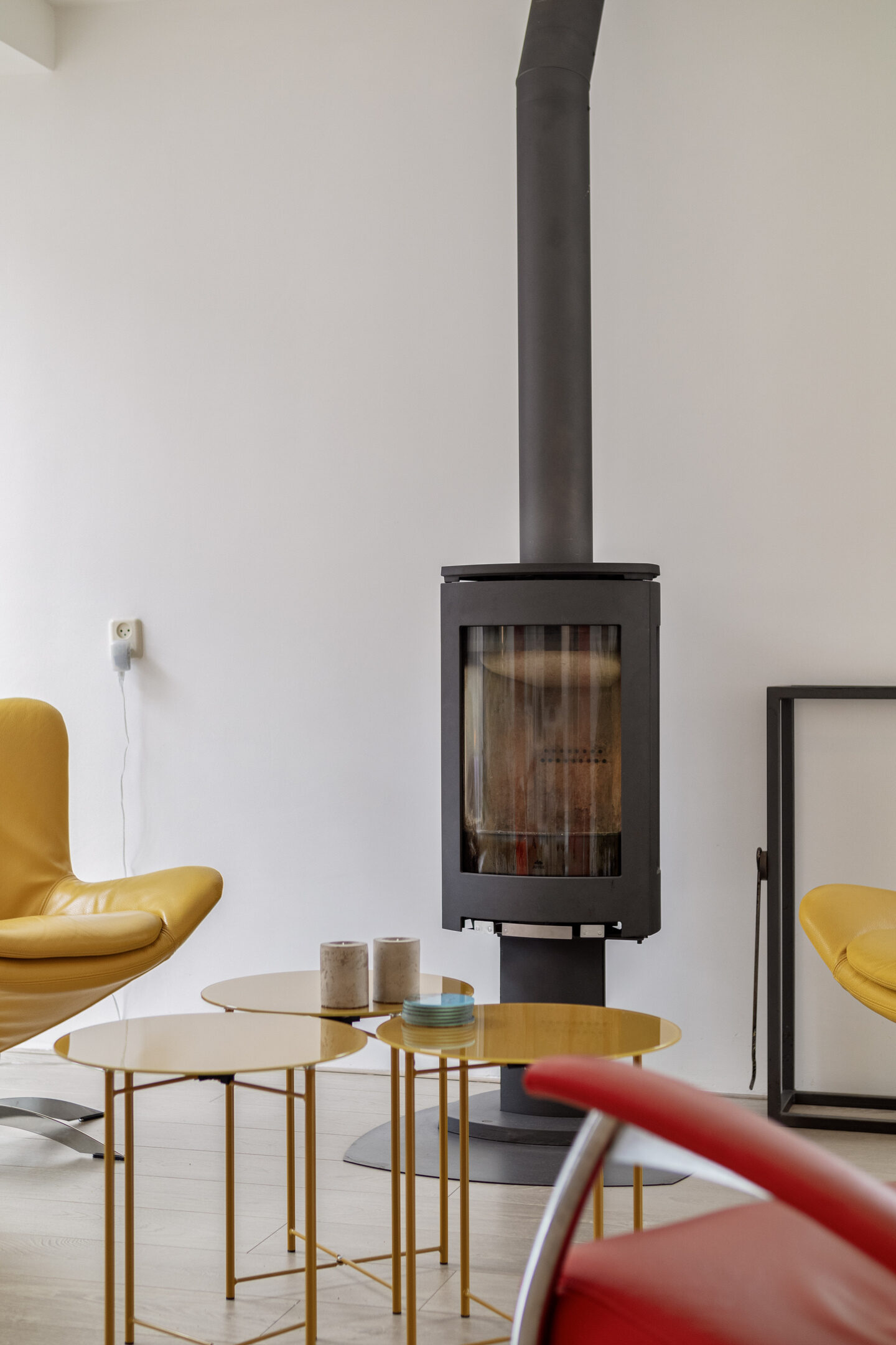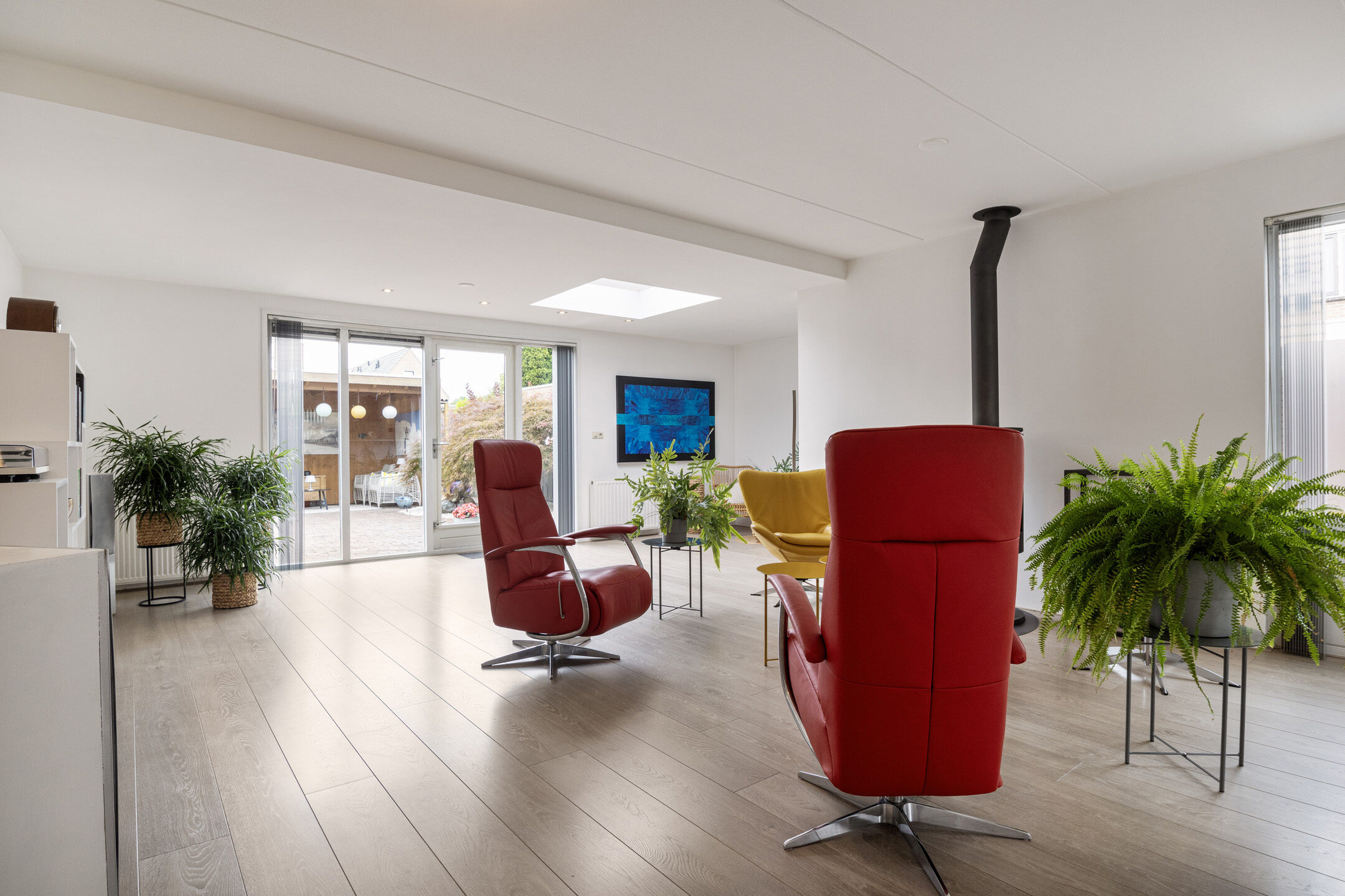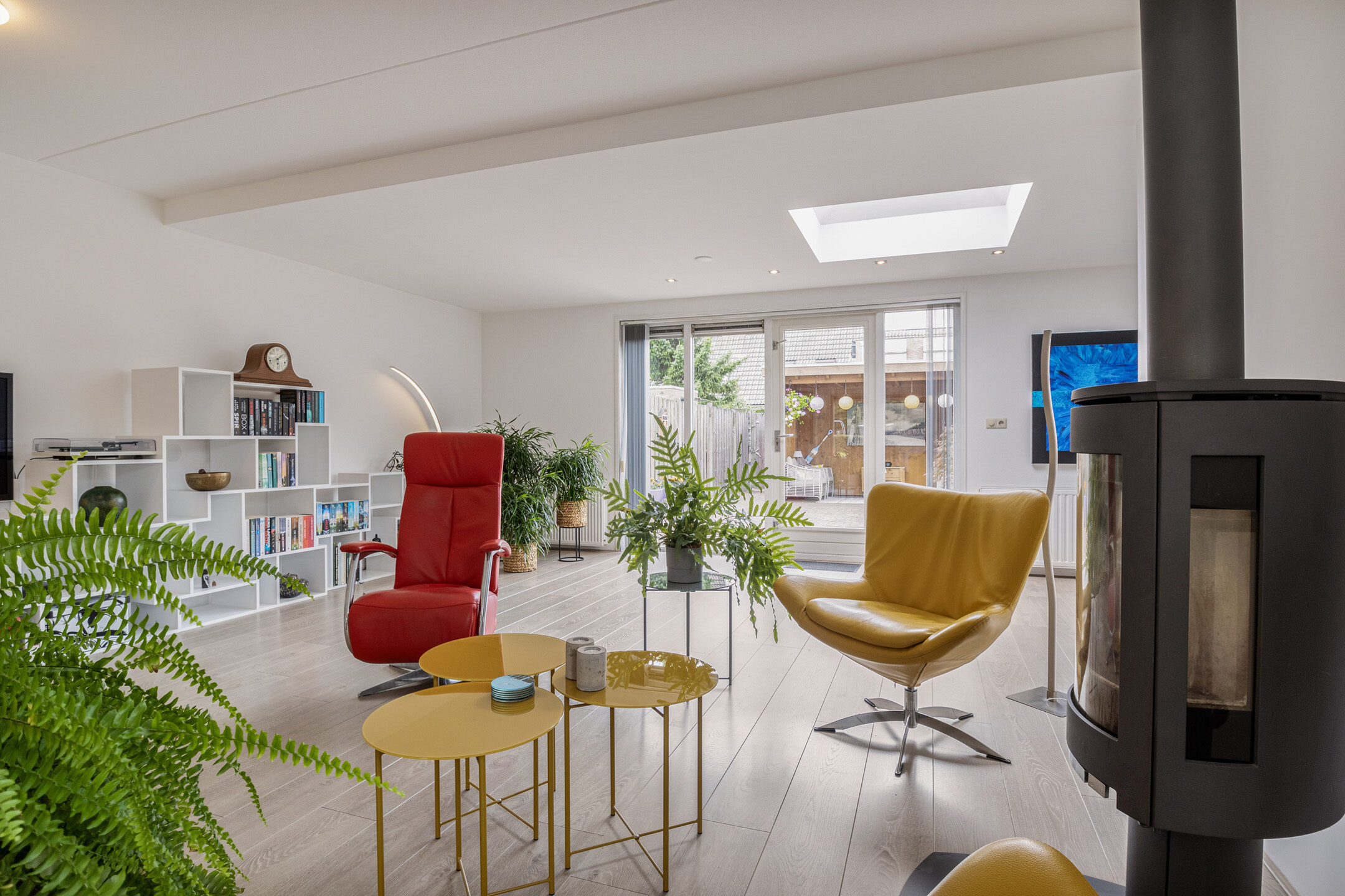 Binnenkomst via de entree, waar zich de meterkast en een modern toilet met fonteintje bevinden. Stap vervolgens binnen in de ruime en lichte woonkamer. Deze woonkamer is niet alleen royaal van opzet, maar ook bijzonder sfeervol dankzij de aanwezige houtkachel. Diverse raampartijen zorgen voor een overvloed aan natuurlijk licht, wat de ruimte een open en uitnodigende uitstraling geeft. Bovendien is in het dak een lichtkoepel aangebracht, die voor extra daglicht zorgt en de kamer nog helderder maakt.