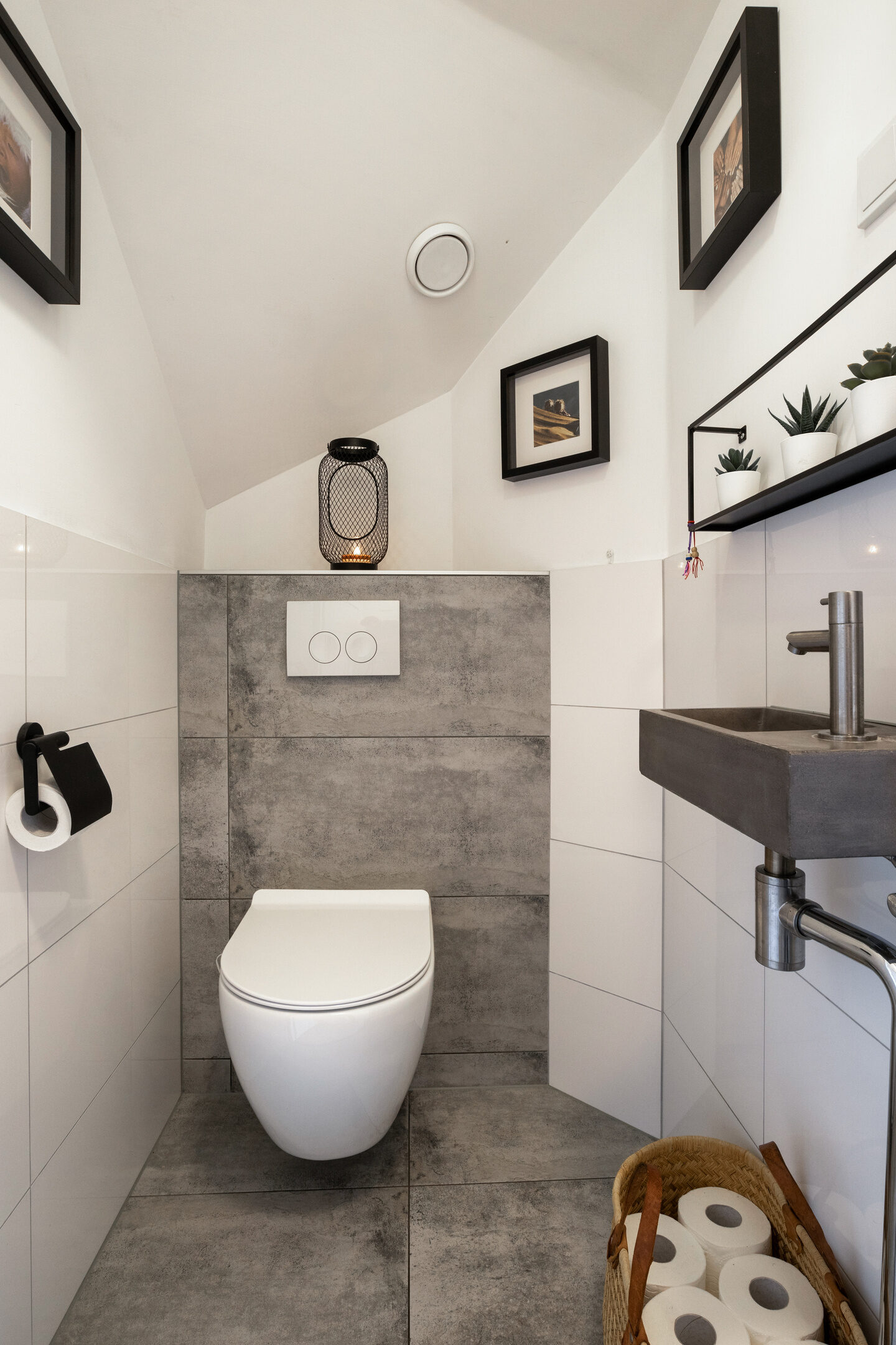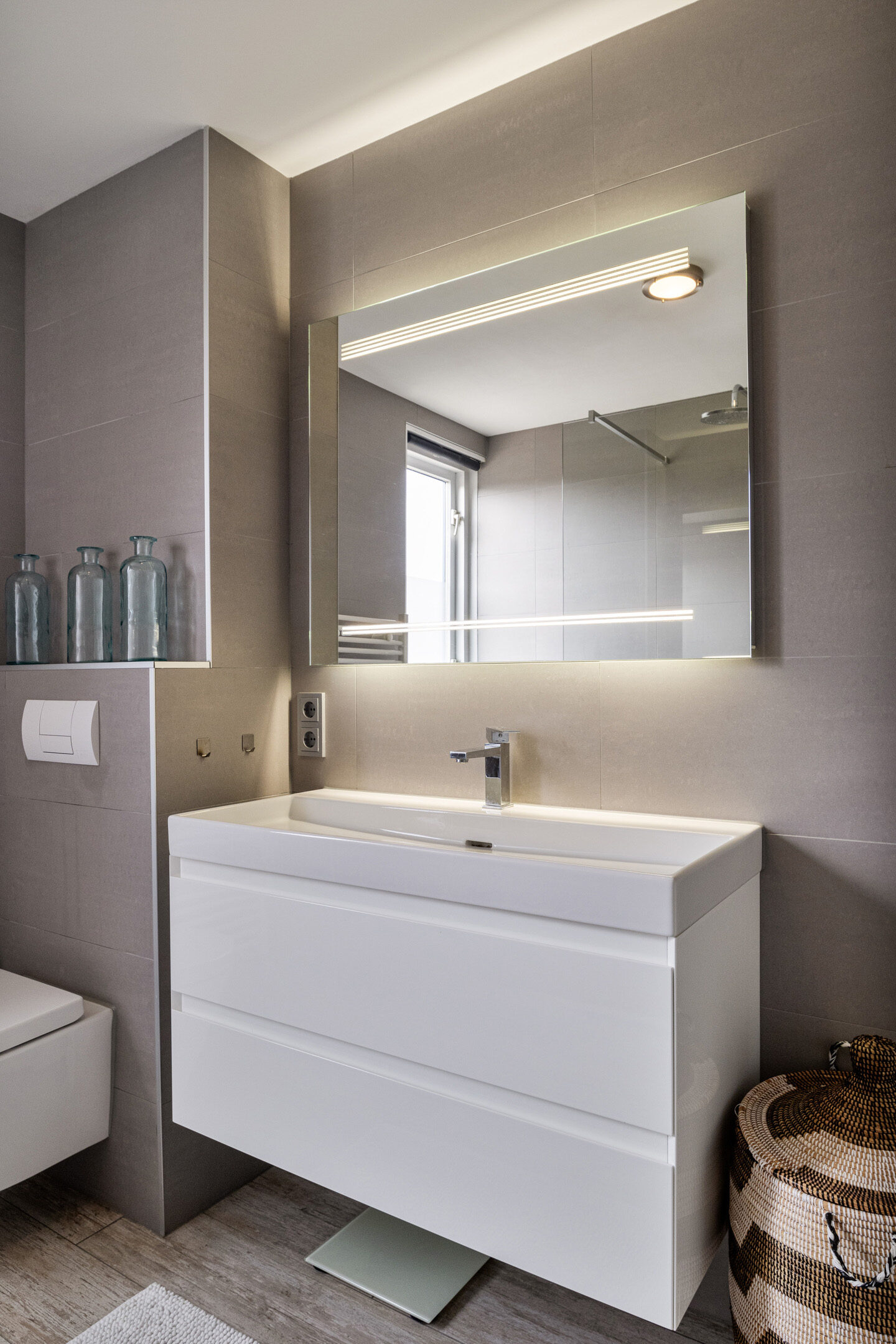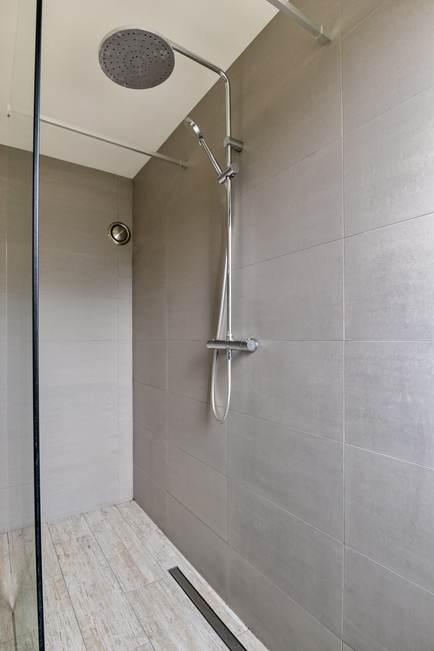 De moderne badkamer, volledig betegeld in eigentijdse stijl, is een oase van comfort en luxe. Hier vind je een ruime inloopdouche met glas wand, die een gevoel van ruimte en openheid creëert. Daarnaast beschikt de badkamer over een toilet en een wastafel met een verlichte spiegel, die zorgt voor de perfecte verlichting tijdens je dagelijkse routine. Een designradiator maakt de badkamer compleet, niet alleen door zijn strakke uitstraling, maar ook door zijn functionaliteit, zodat handdoeken altijd warm en droog zijn. Deze badkamer biedt alles wat je nodig hebt voor een verfrissende start van de dag of een ontspannen avondritueel.
