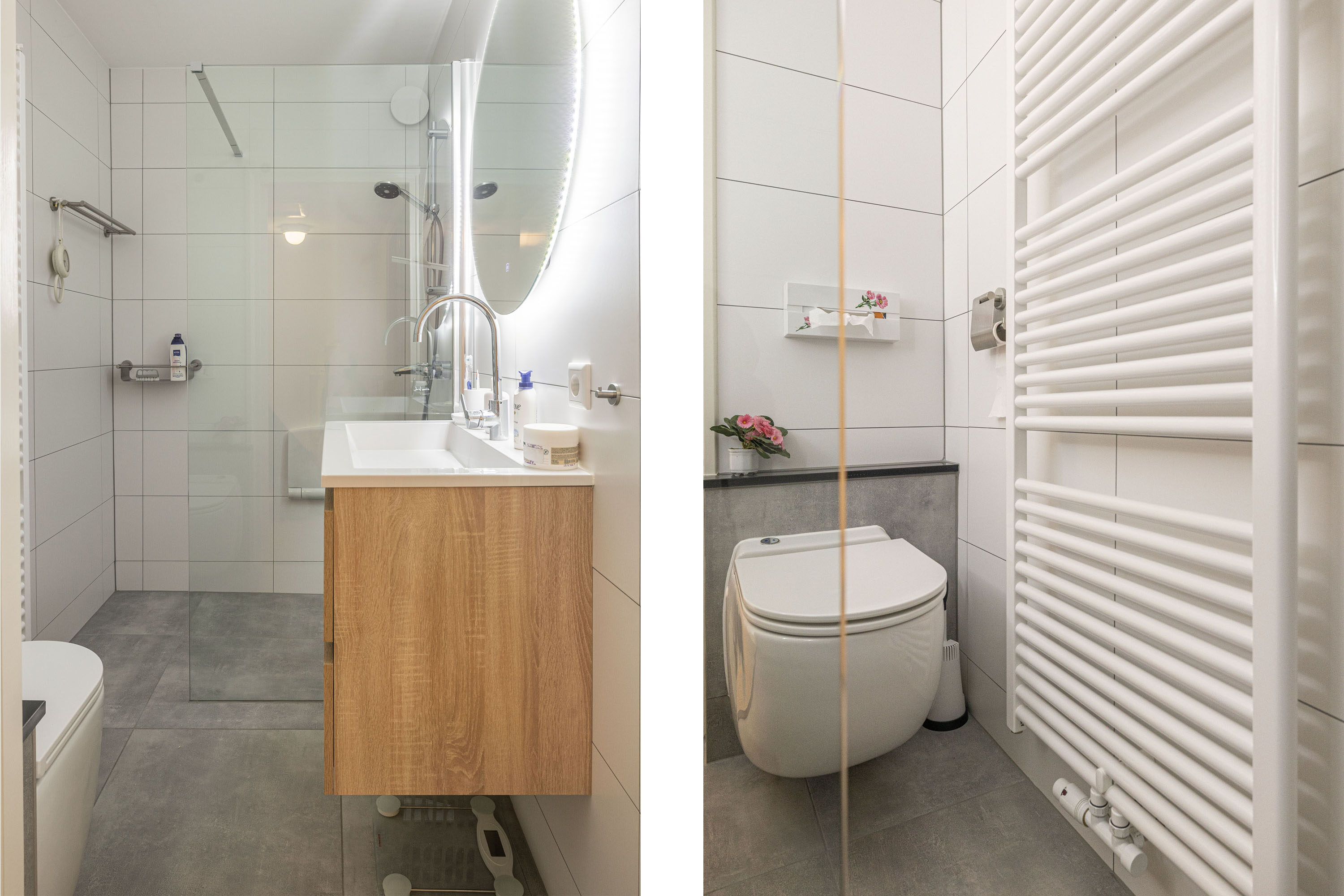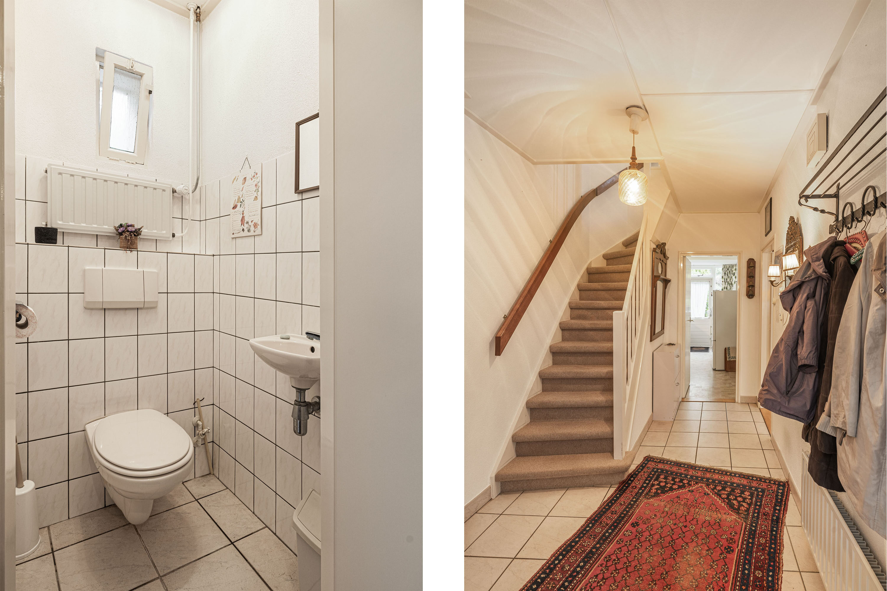 De keuken is praktisch ingedeeld met veel opbergruimte dankzij bovenkastjes en een voorraadkast. Een leuk detail is de ingebouwde kast, die zowel vanuit de keuken als vanuit de woonkamer geopend kan worden – ideaal om je servies in te bewaren en zo het dekken van de tafel te vereenvoudigen. Daarnaast is er een wasmachineaansluiting in de keuken aanwezig. Vanuit de keuken loop je direct de achtertuin in.