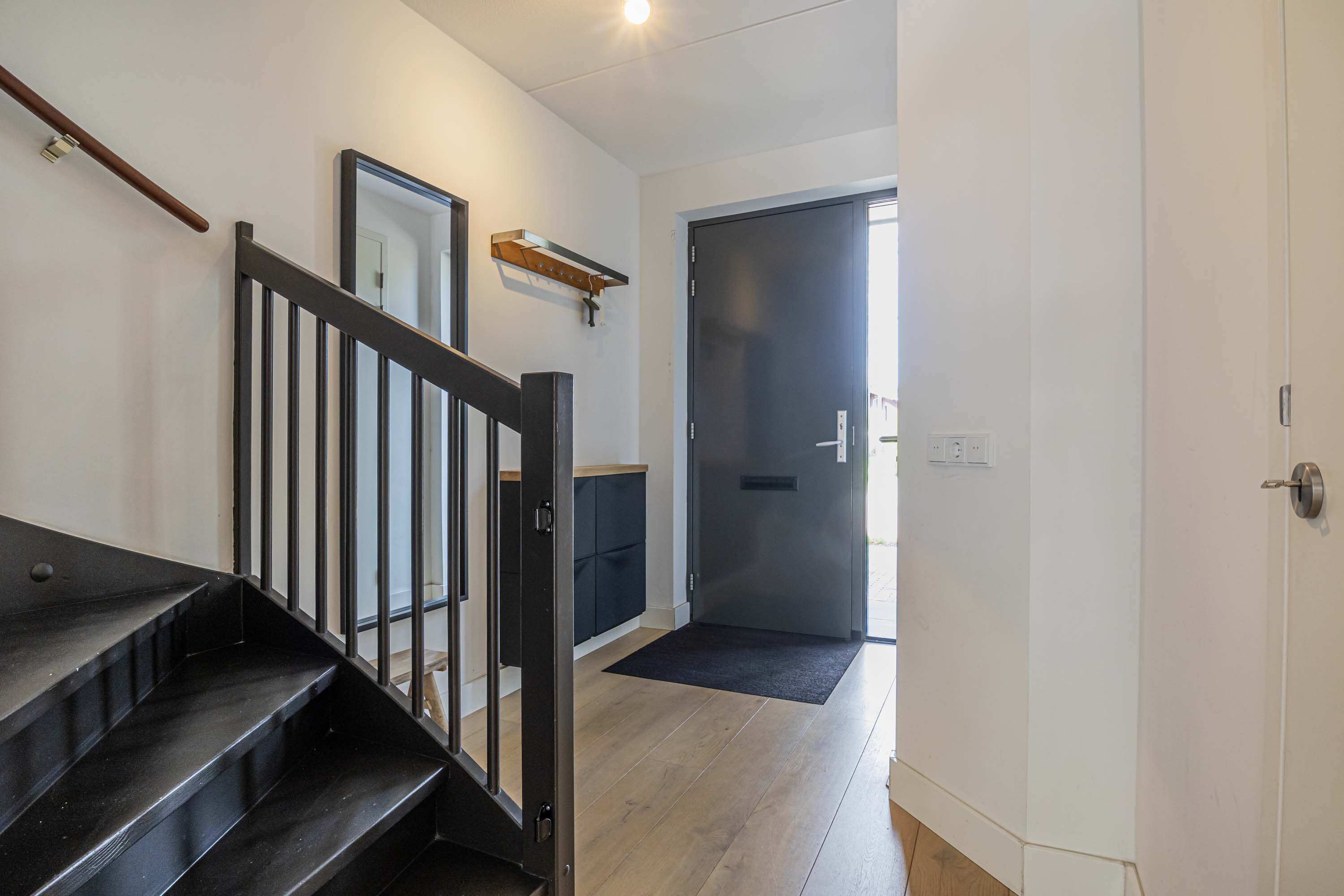 Bij binnenkomst tref je de entree met een luxe toilet voorzien van een fonteintje, een meterkast en de trapopgang naar de eerste verdieping. Via een moderne stalen deur kom je in de riante en lichte woonkamer met een oppervlakte van circa 41 m². Aan de achterzijde bij het zitgedeelte van de woning zijn er openslaande deuren naar de ruime tuin. In de woonkamer bevindt zich een handige trapkast, perfect te gebruiken als voorraadruimte.