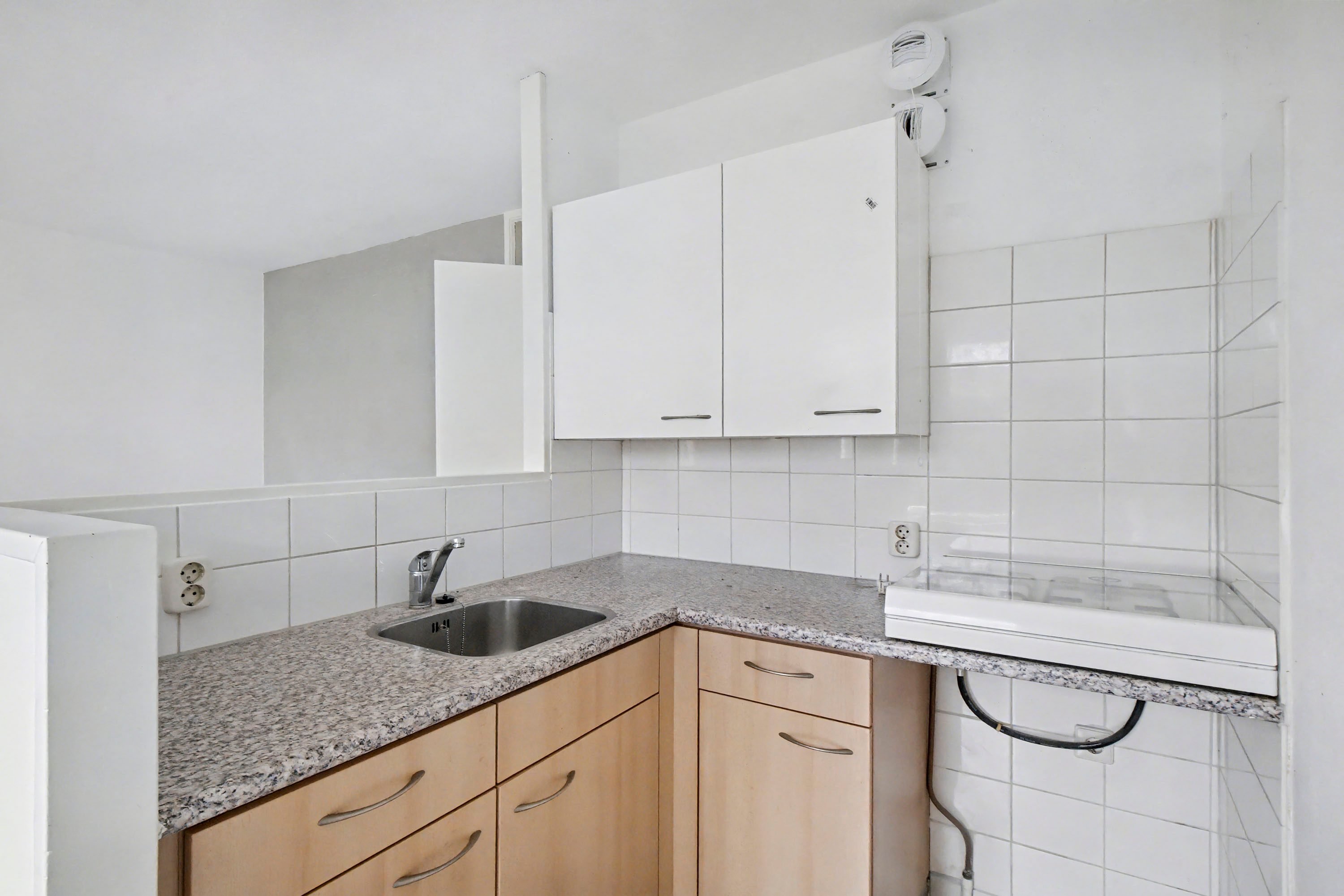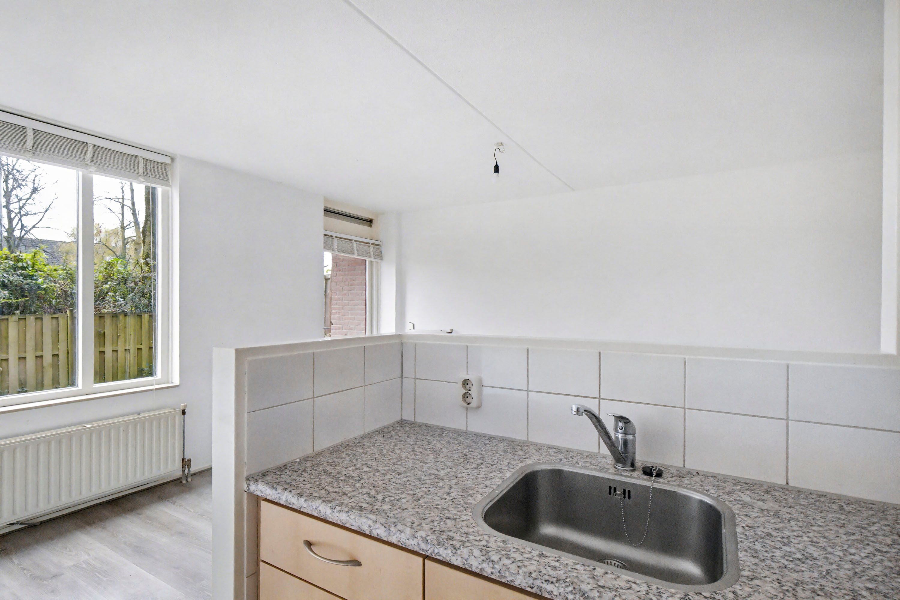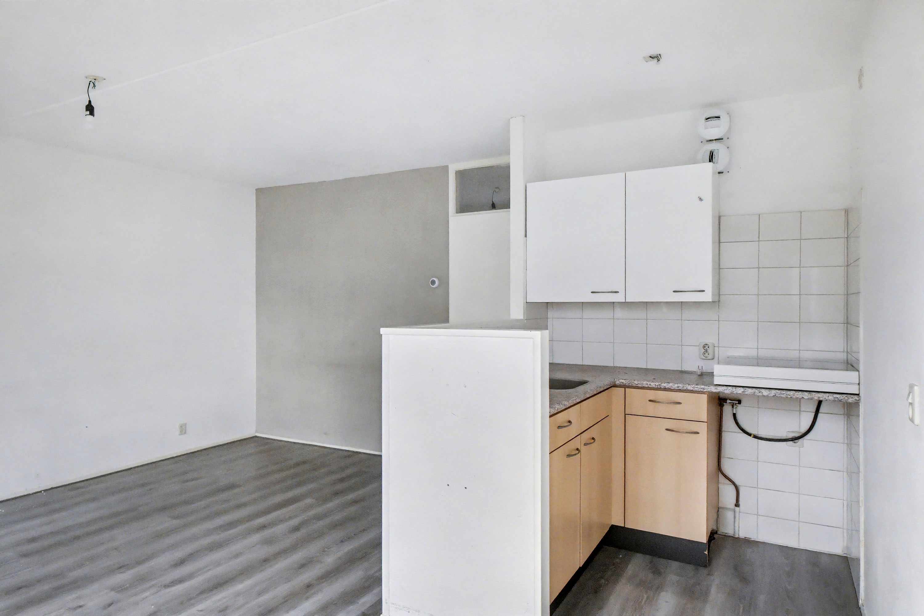 Je komt binnen in een ruime hal (ca. 3,8 m²) met toegang tot alle vertrekken. Aan de achterzijde ligt de lichte woonkamer met laminaatvloer en een eenvoudige open keuken.