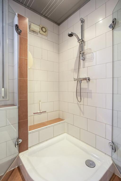 Wanneer je de trap opgaat naar de eerste verdieping, kom je uit op een ruime en lichte overloop. Vanaf hier heb je toegang tot de volledig betegelde badkamer, die van alle gemakken is voorzien. De badkamer beschikt over een dubbele wastafel, een moderne douche en een toilet.