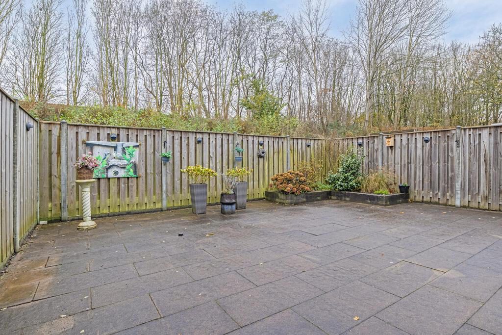 Via de schuifdeuren in de woonkamer stap je direct de tuin in, die volledig is betegeld voor een onderhoudsvriendelijke buitenruimte. Deze tuin biedt een ideale plek om te ontspannen en te genieten van de buitenlucht. Achter de woning kun je heerlijk beschut zitten onder het recent geplaatste zonnescherm, waardoor je op zonnige dagen altijd een aangenaam plekje in de schaduw hebt. Het is een perfecte plek voor een gezellige zithoek waar je kunt ontspannen met een goed boek of kunt genieten van een maaltijd in de buitenlucht.
