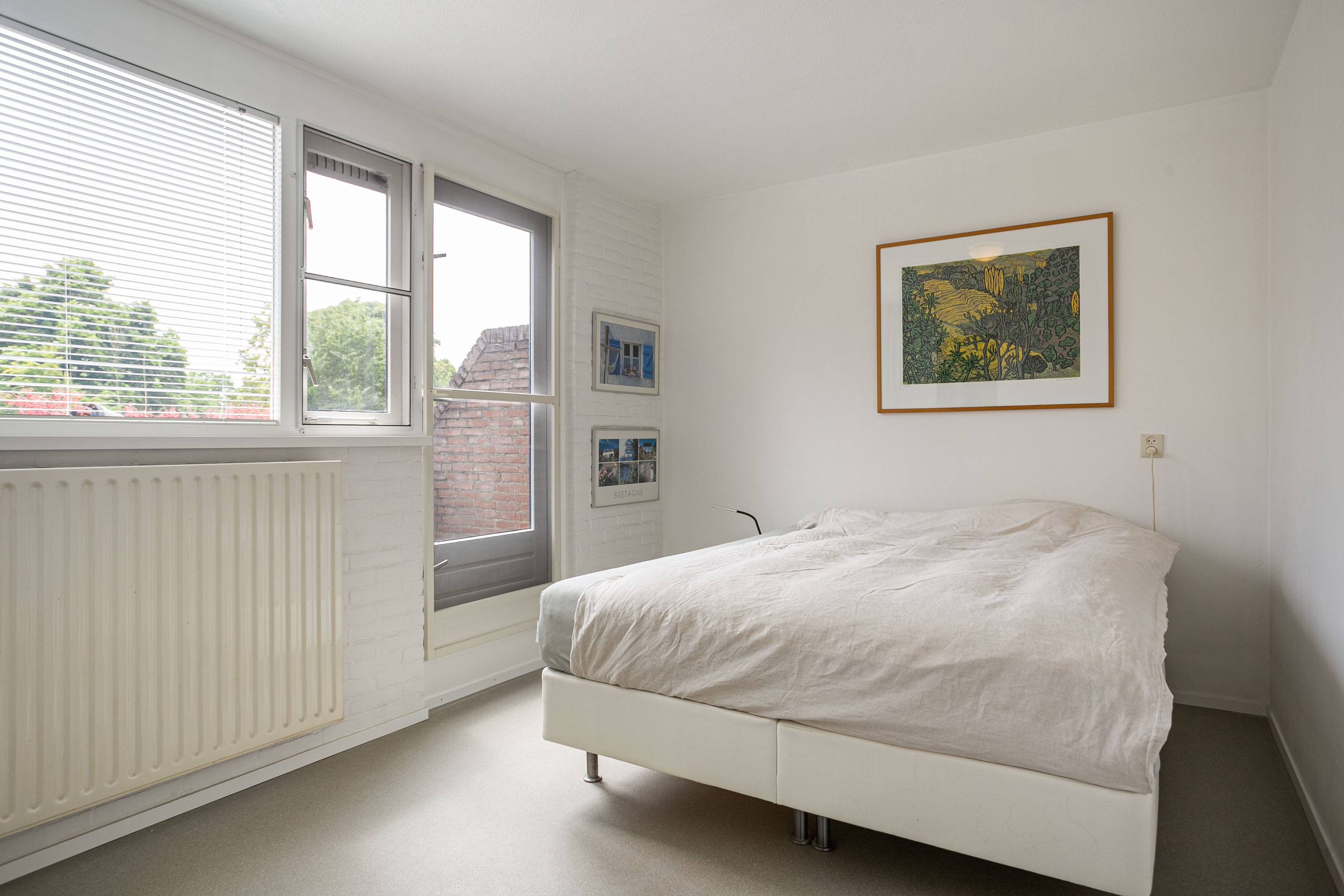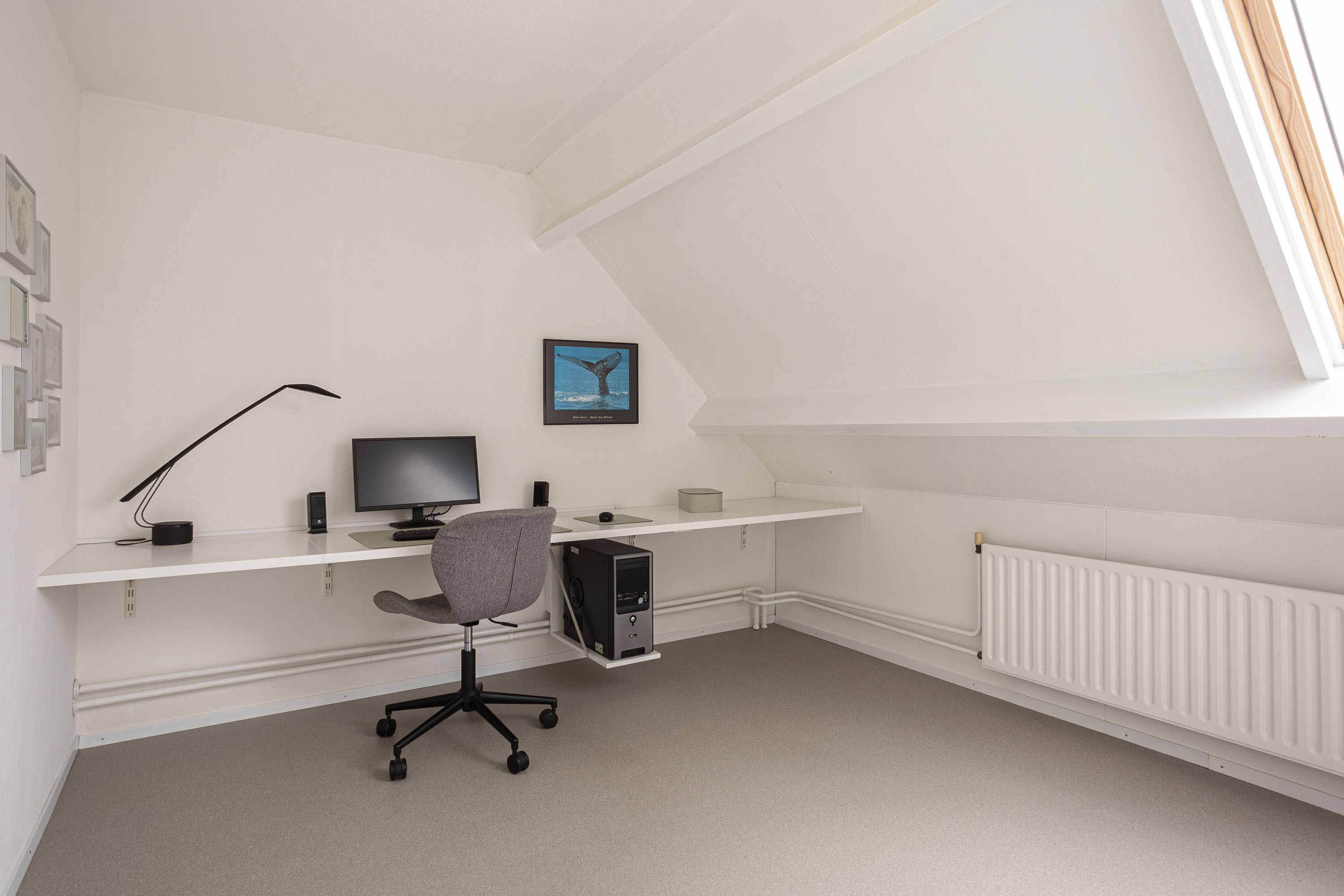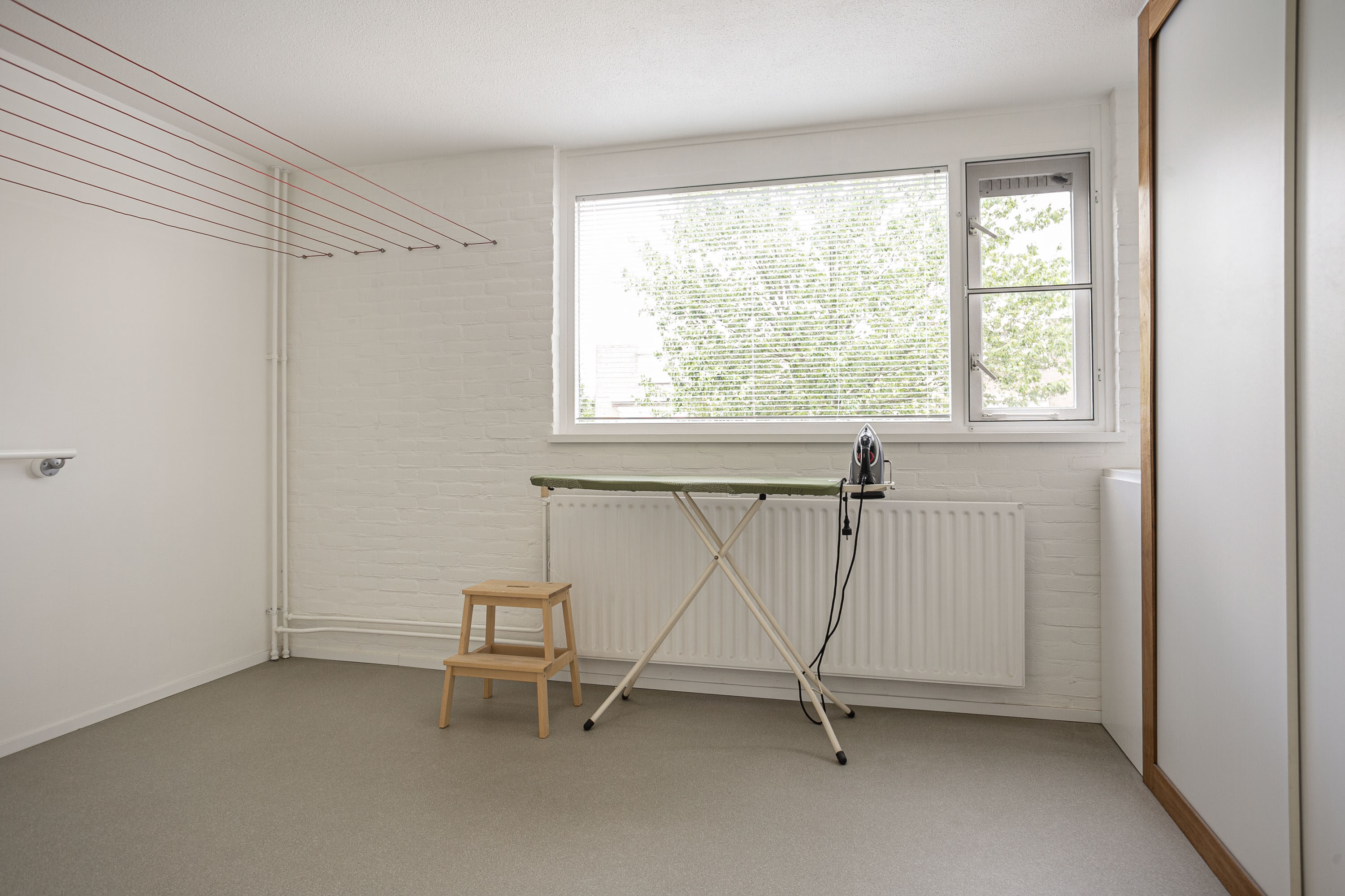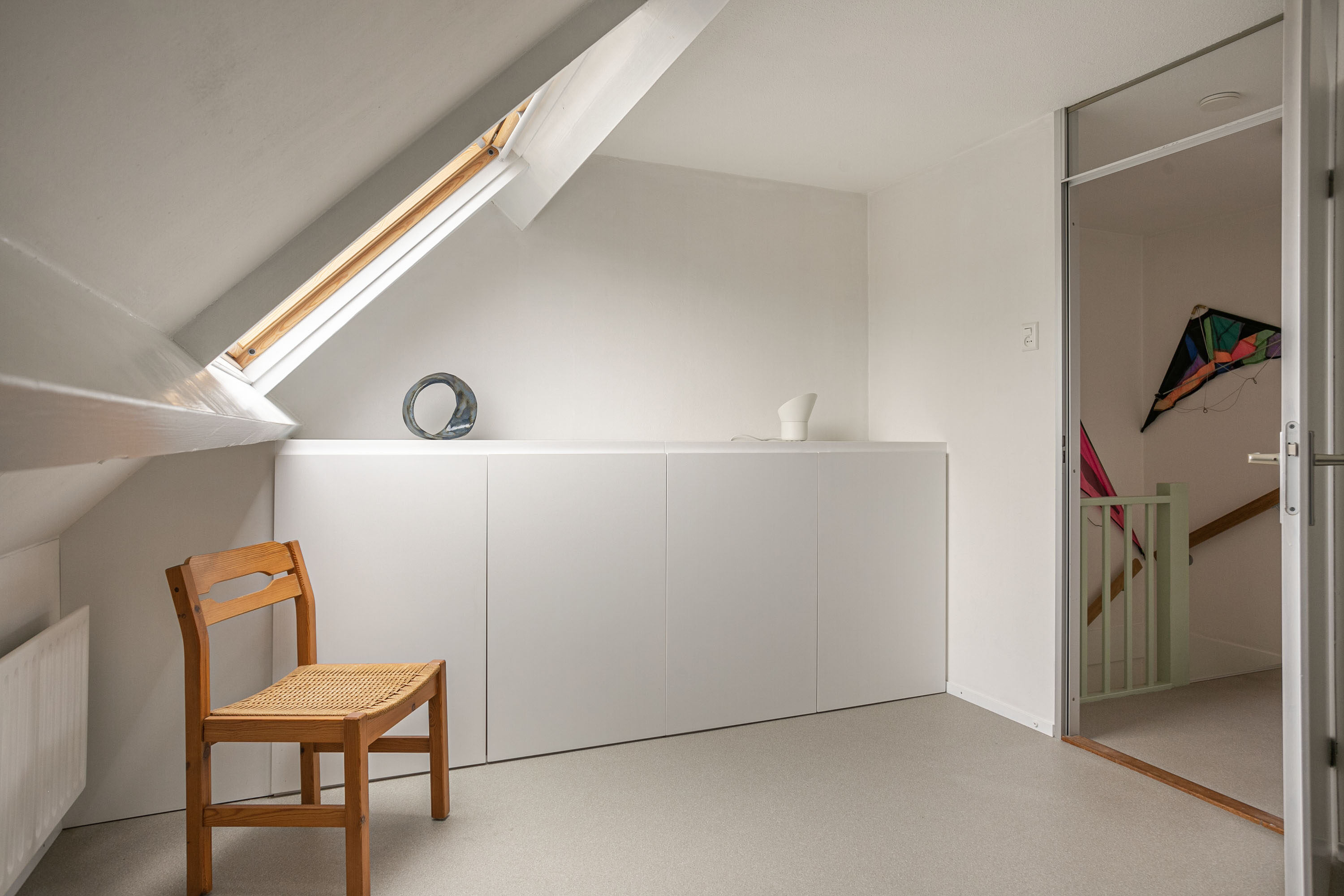 Via een vaste trap bereik je de tweede verdieping. Hier bevinden zich twee slaapkamers van ongeveer 12 m² en 11 m². De slaapkamer aan de achterzijde is voorzien van een dakraam. Daarnaast is er een praktische berging/wasruimte, ideaal voor het opbergen van spullen. Deze ruimte is uitgerust met aansluitingen voor witgoed en biedt plaats aan de C.V.-ketel.