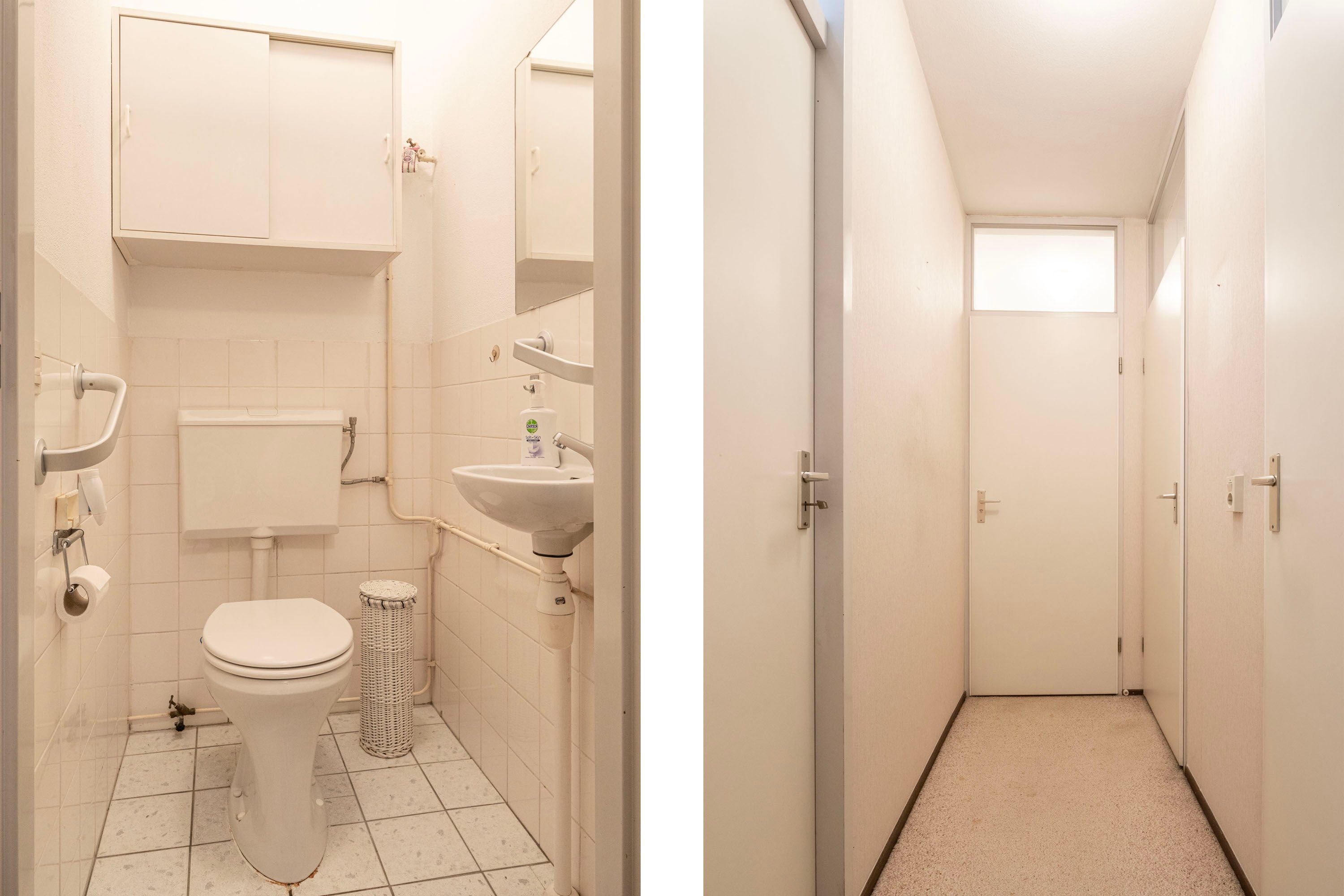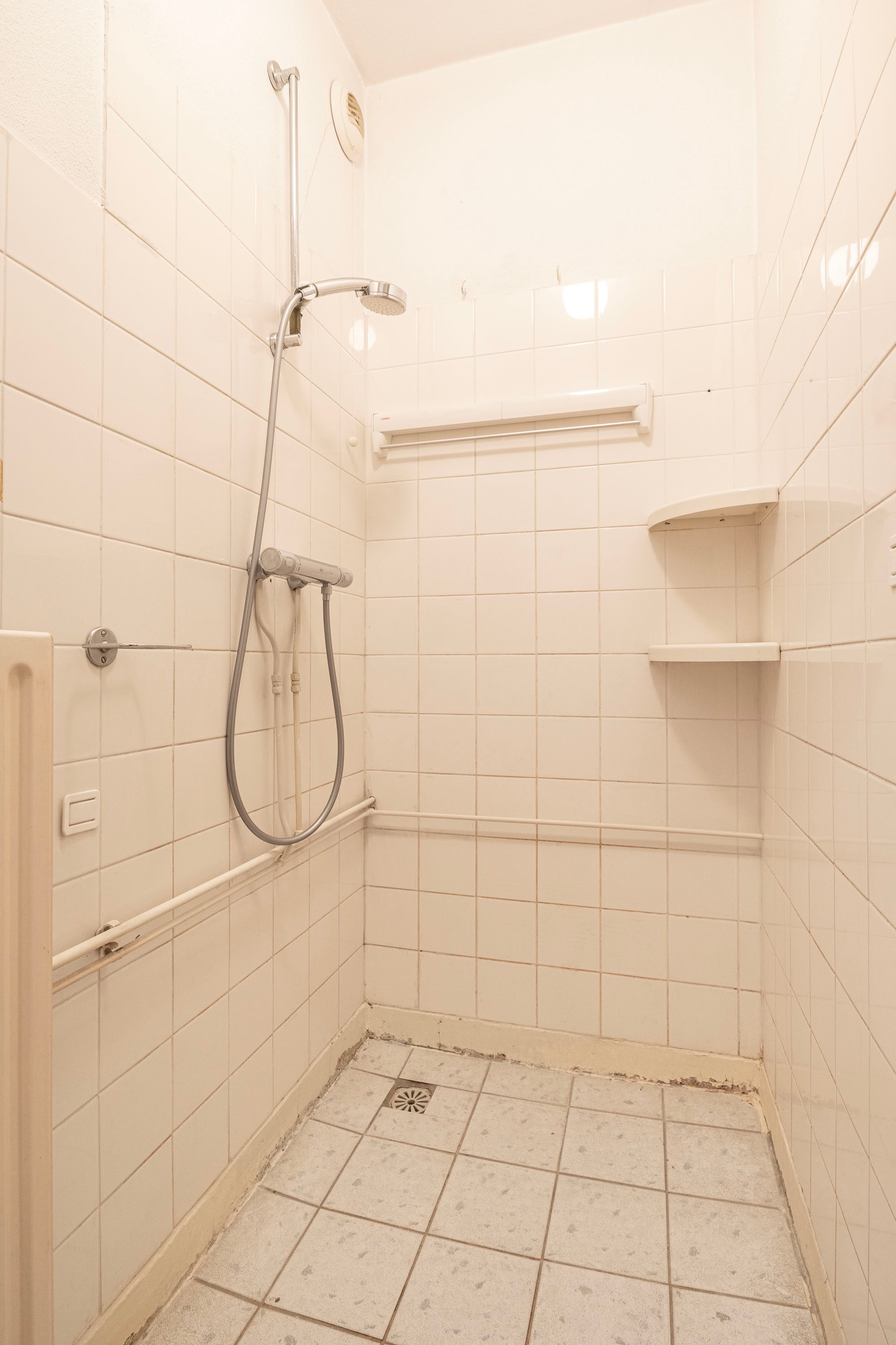 Je komt binnen in de entree, waar zich de meterkast bevindt, en van waaruit je de woonkamer binnenstapt. De woonkamer, met zijn royale omvang van circa 31 m², is aangenaam verlicht door een raam aan de westzijde. Vanuit hier zijn de keuken, hal en een van de slaapkamers bereikbaar. De keuken is uitgerust met een vier-pits gasfornuis, een afzuigkap, koelkast en oven. Via de hal bereik je de badkamer met douche en wastafel, waar ook de elektrische boiler opgesteld staat, en het aparte toilet met fonteintje.