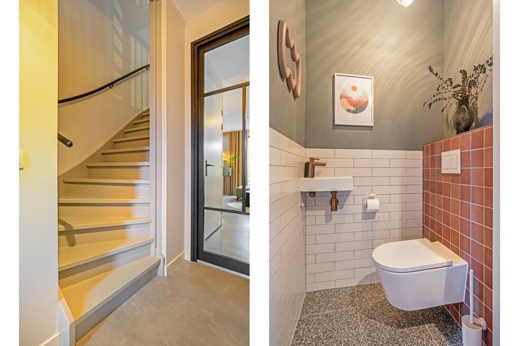 De ruime entree met meterkast, garderoberuimte, trapopgang naar de 1e verdieping en de toiletruimte met zwevend toilet en fonteintje brengt je via een glazen deur naar de living. Wat gelijk al opvalt in de hal is het zeer hoge afwerkingsniveau! De prachtige betonlook PVC/tegelvloer met vloerverwarming en de gladde wanden geven je alvast een voorproefje van wat de woning je nog meer te bieden heeft.