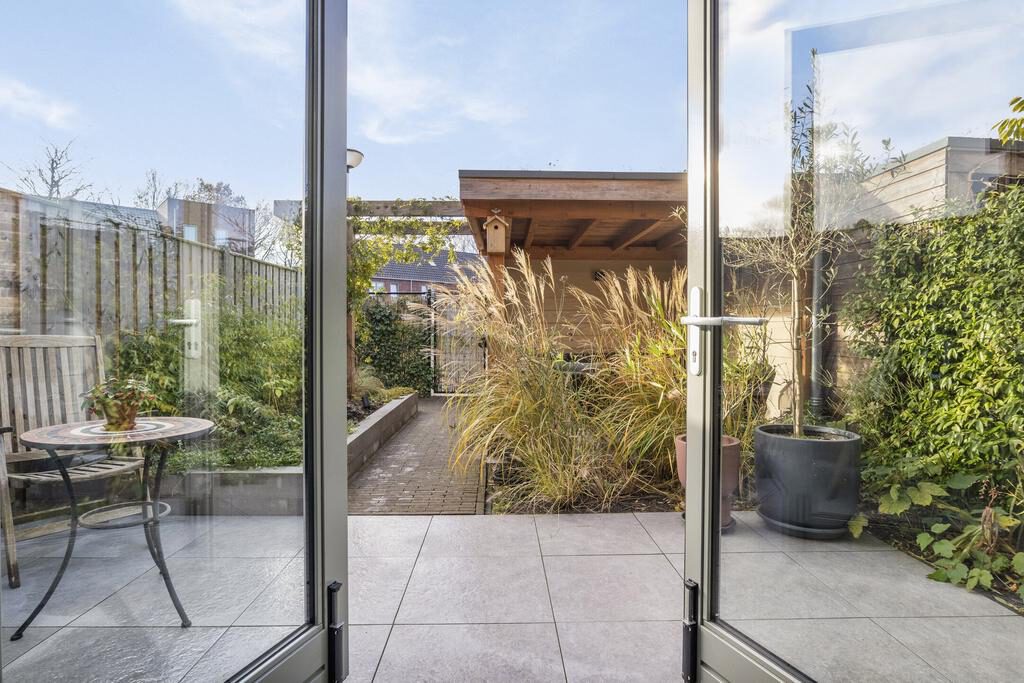 Via de dubbele openslaande tuindeuren vanuit de keuken is de achtertuin te bereiken. Een verzorgde tuin die is voorzien van sierbestrating, plantenbakken met grassen en planten en een leuke veranda om gezellig overdekt te kunnen zitten. De achtertuin is gelegen op het zuidwesten en kan dus met zekerheid worden bestempeld als een zeer zonnige achtertuin. Achterin de tuin staat nog een houten berging en er is een achterom aanwezig naar het achtergelegen parkeerterrein.