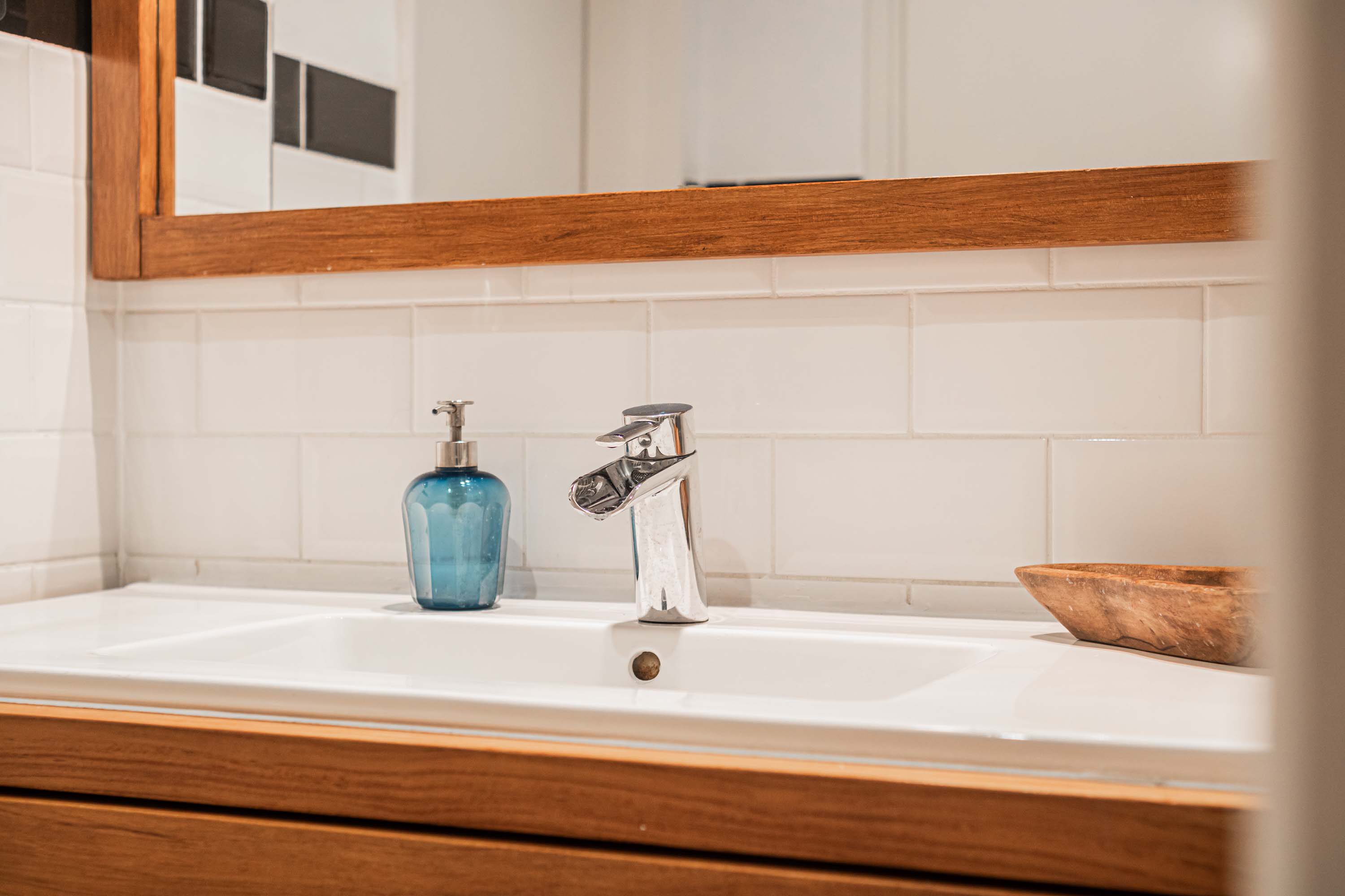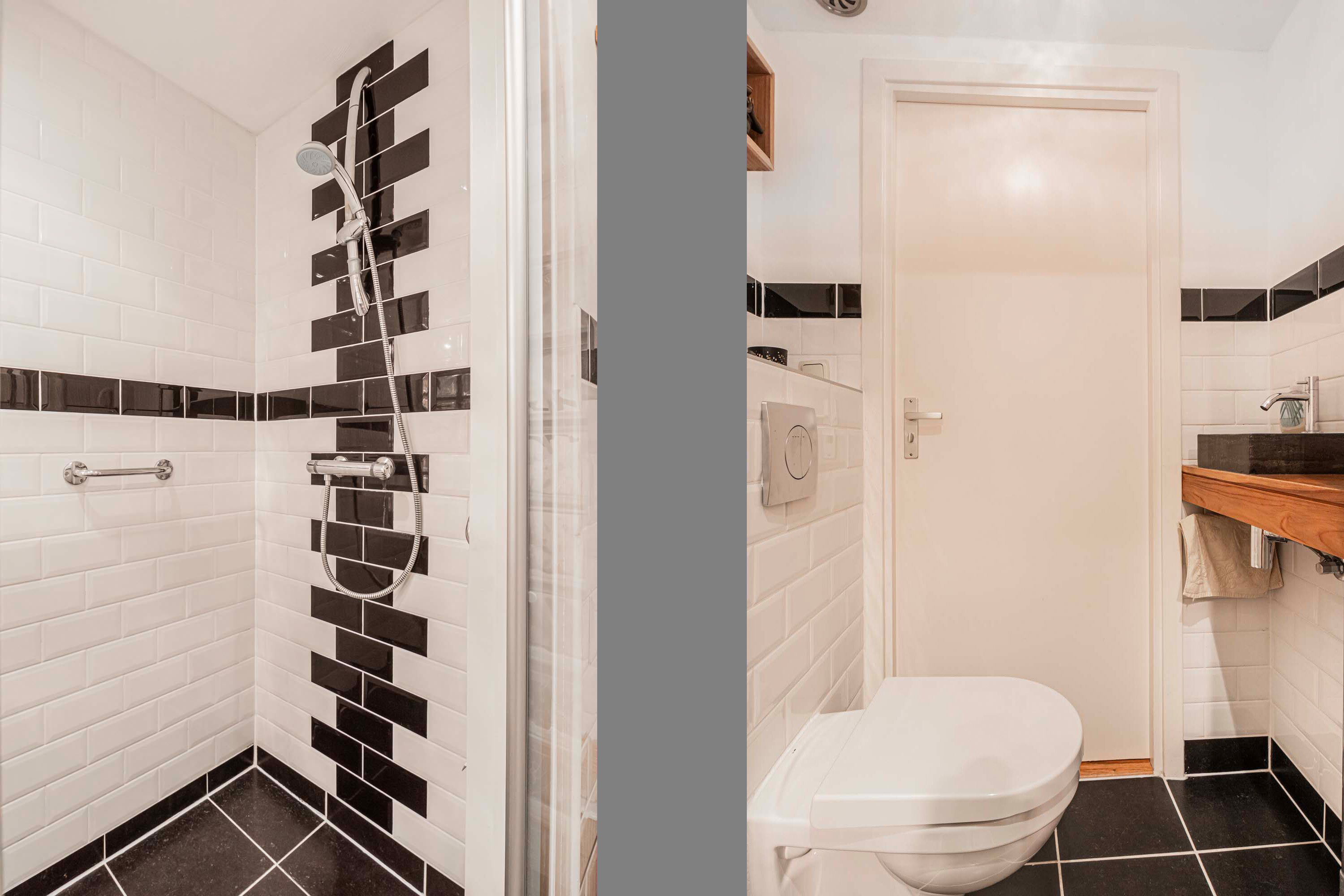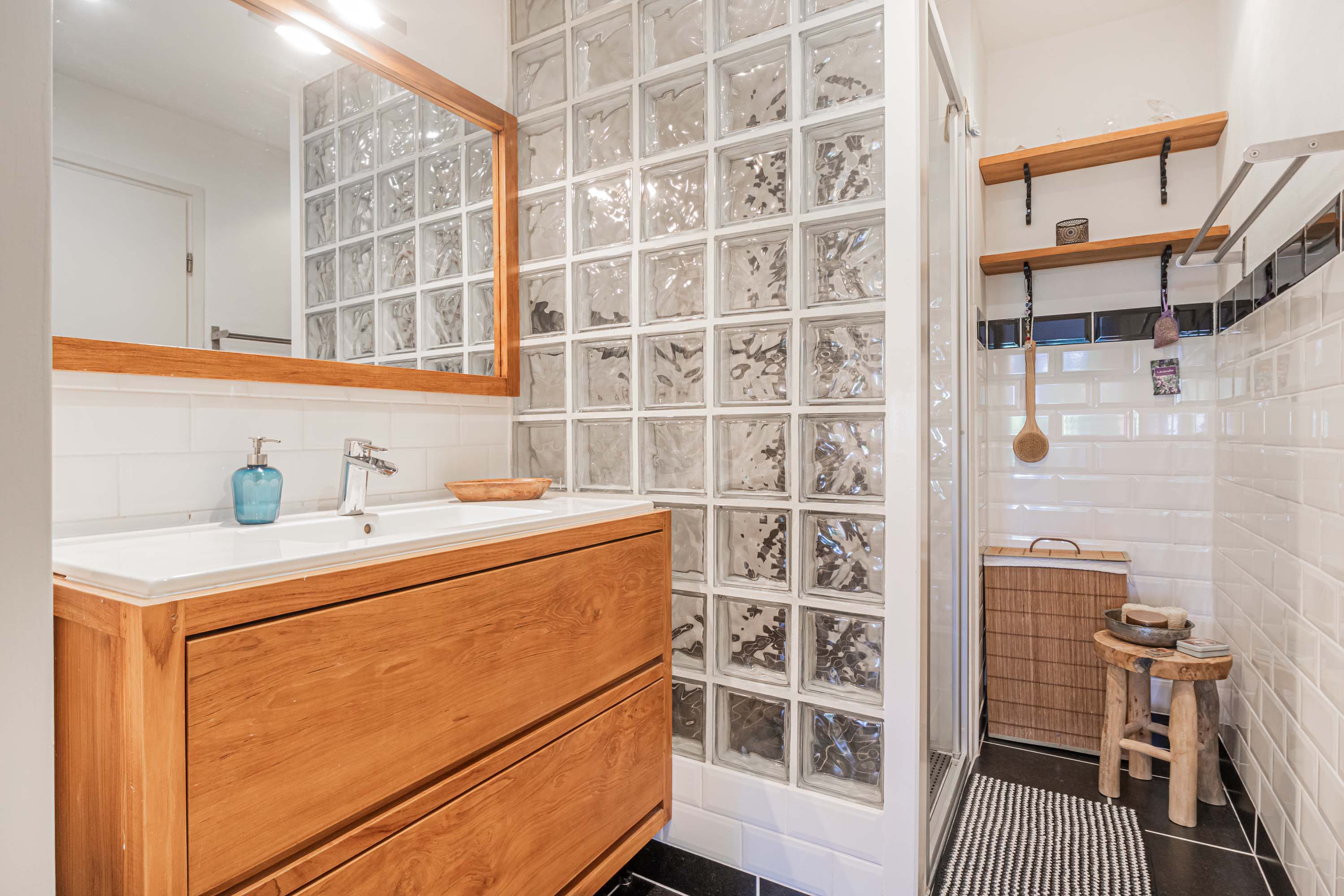 De badkamer is voorzien van een inloopdouche en een wastafelmeubel van massief teakhout welke op maat is gemaakt. De badkamer is bereikbaar via zowel de hal als één van de slaapkamers.
