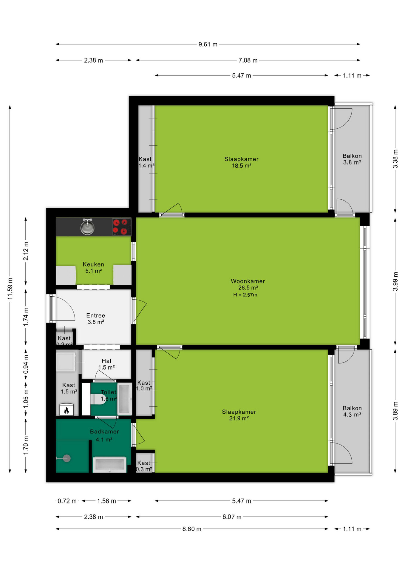 Met een woonoppervlakte van ca. 95 m², een ruime woonkamer, twee royale slaapkamers en meerdere opbergmogelijkheden, is dit appartement een uitstekende keuze voor wie comfortabel en centraal wil wonen.