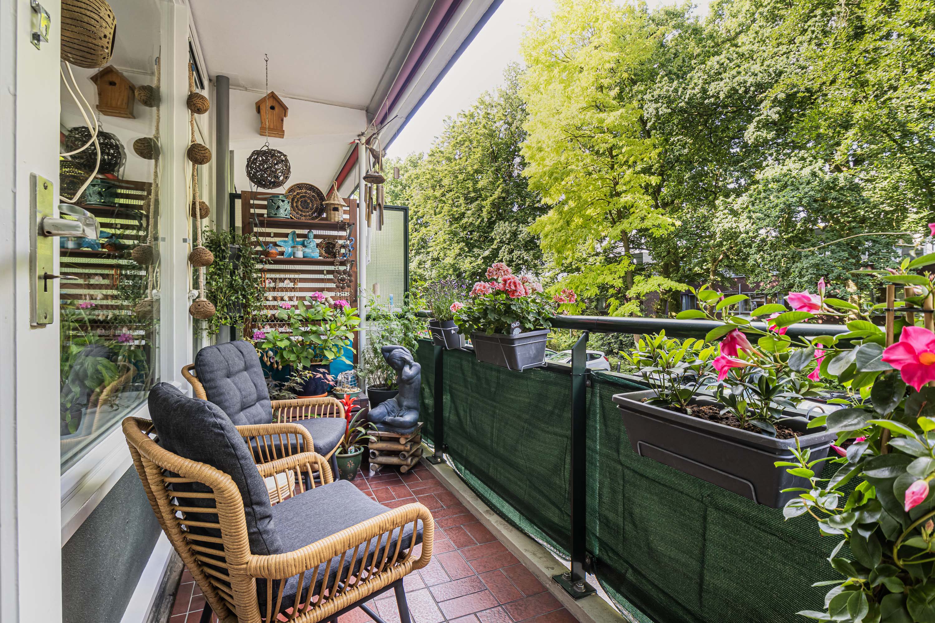Het appartement heeft twee zonnige balkons, beide gelegen op het westen. Hierdoor kun je de hele middag en avond genieten van de zon. Beide balkons zijn bereikbaar via de woonkamer en slaapkamers en voorzien van een zonnescherm.