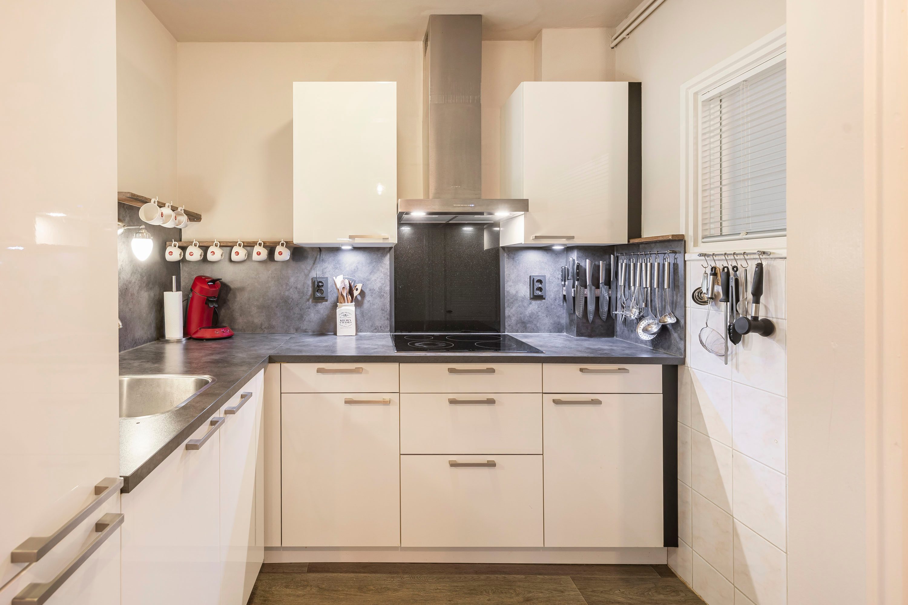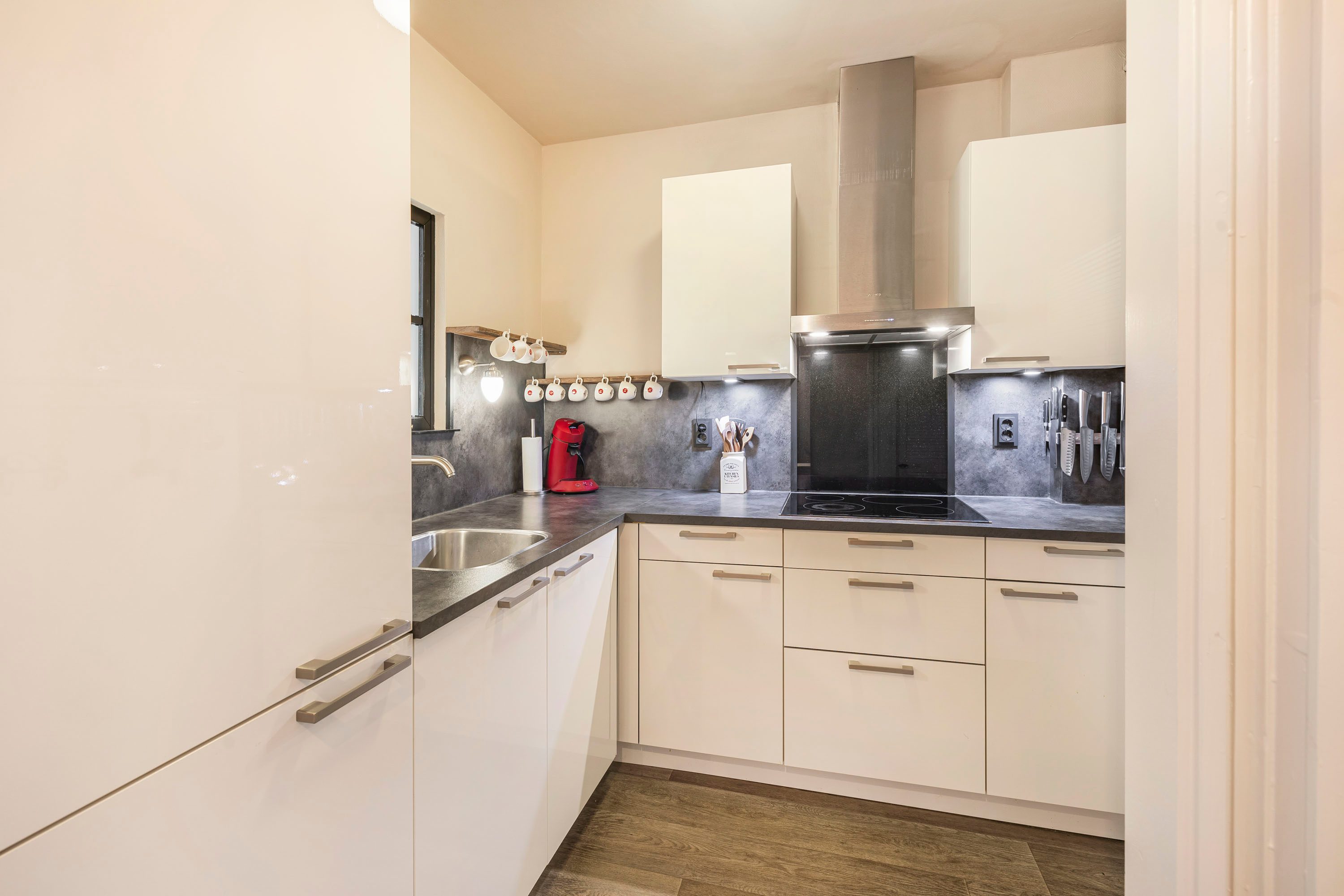 De keuken in hoekopstelling is uitgerust met onder andere een inductiekookplaat, afzuigkap en koel-vriescombinatie.