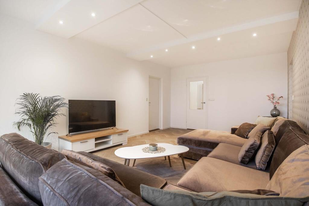 Vanuit de hal loop je de grote woonkamer van ruim 27 m² binnen, met kunststof kozijnen en een elektrisch zonnescherm. Door de grote raampartij wordt deze ruimte overdag overspoeld met natuurlijk licht, en 's avonds zorgt de strakke inbouwverlichting in het plafond voor een sfeervolle ambiance. Via de woonkamer kun je zowel links als rechts de balkons betreden.
