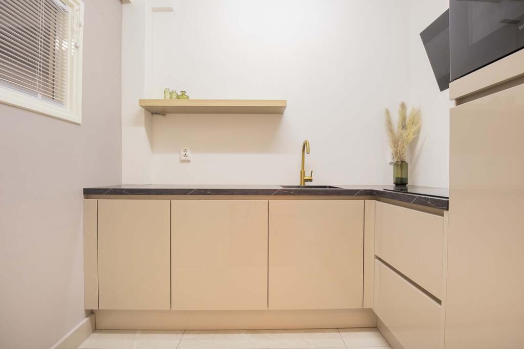 Links van de hal is de nieuwe keuken met diverse inbouwapparatuur, zoals een inductiekookplaat, afzuigkap, koelkast met vriesvak, vaatwasser, combi-oven en een authentieke inbouwkast met veel opbergruimte.