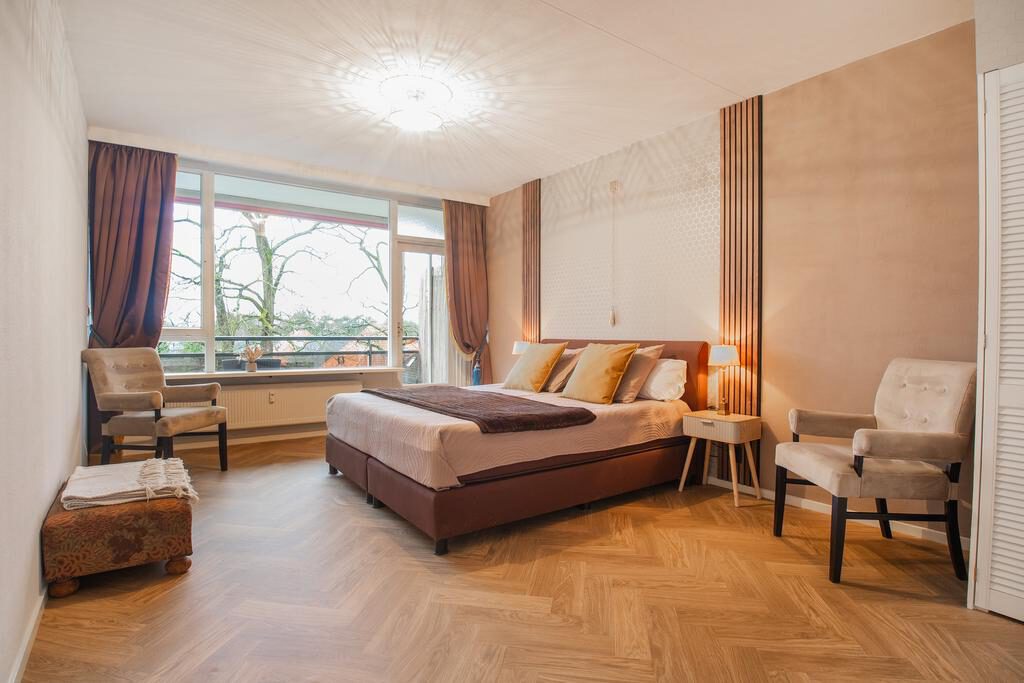 Links grenzend aan de woonkamer vind je één van de zeer ruime slaapkamers van circa 21 m², vanuit waar je ook het linker balkon kunt betreden.