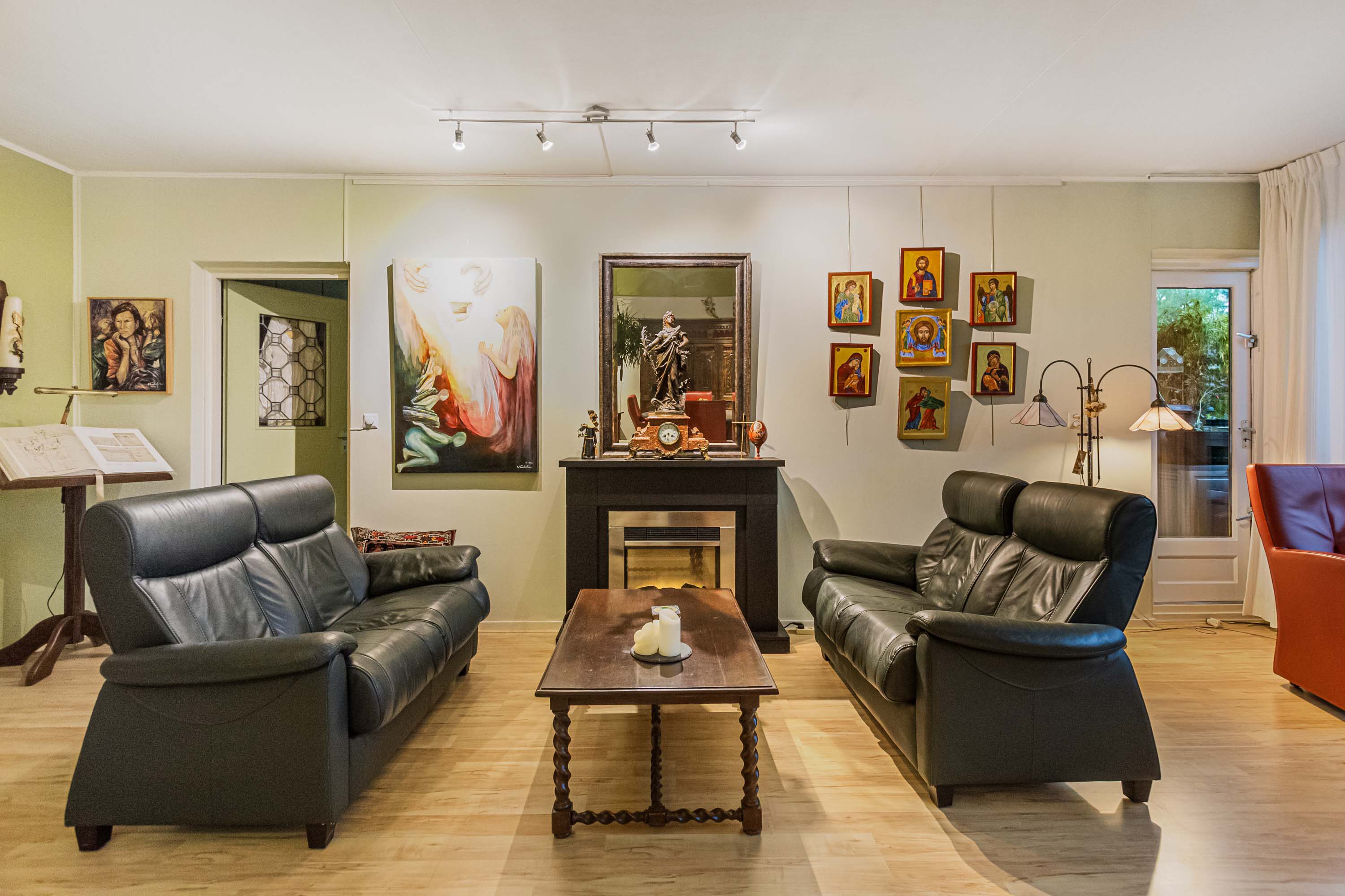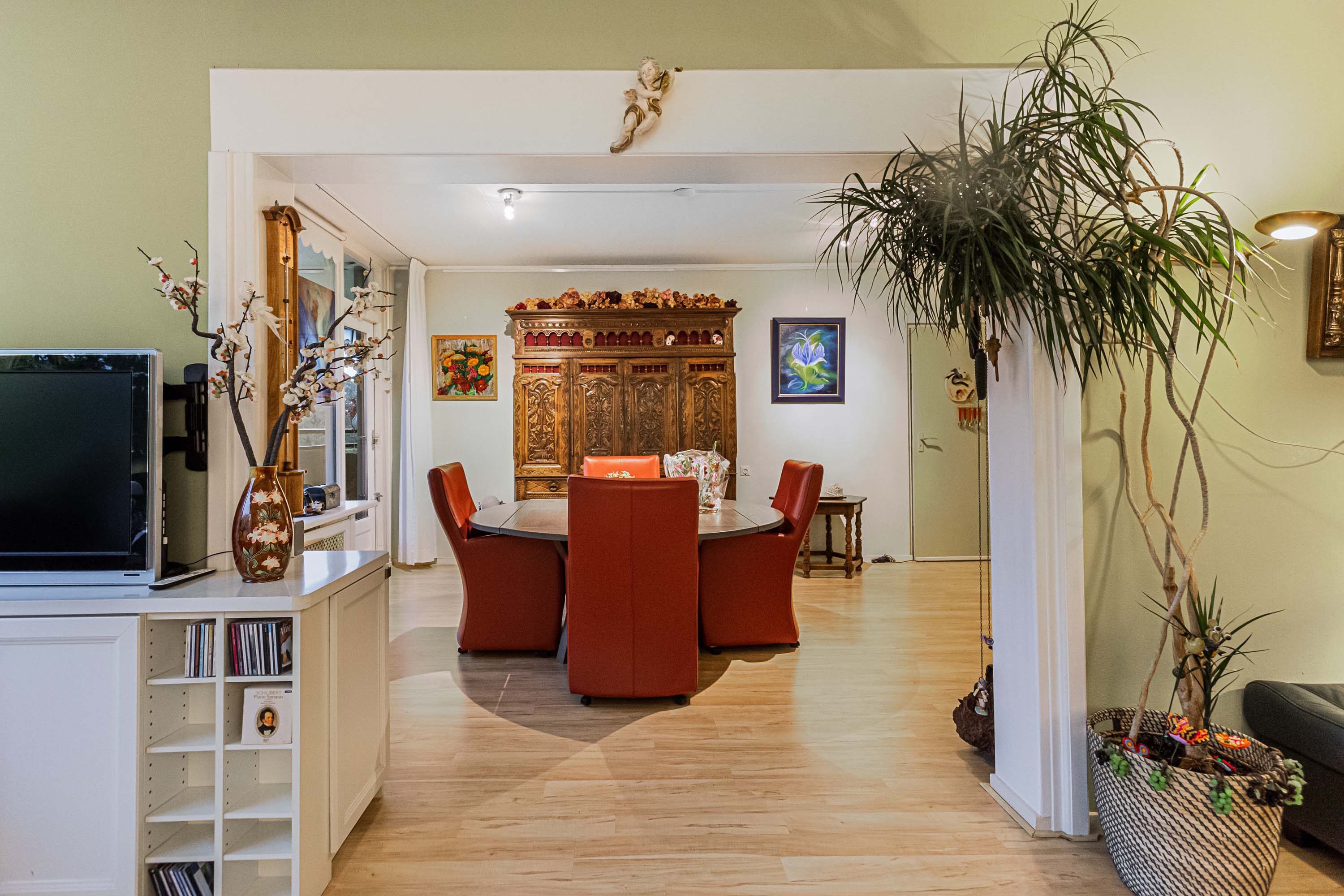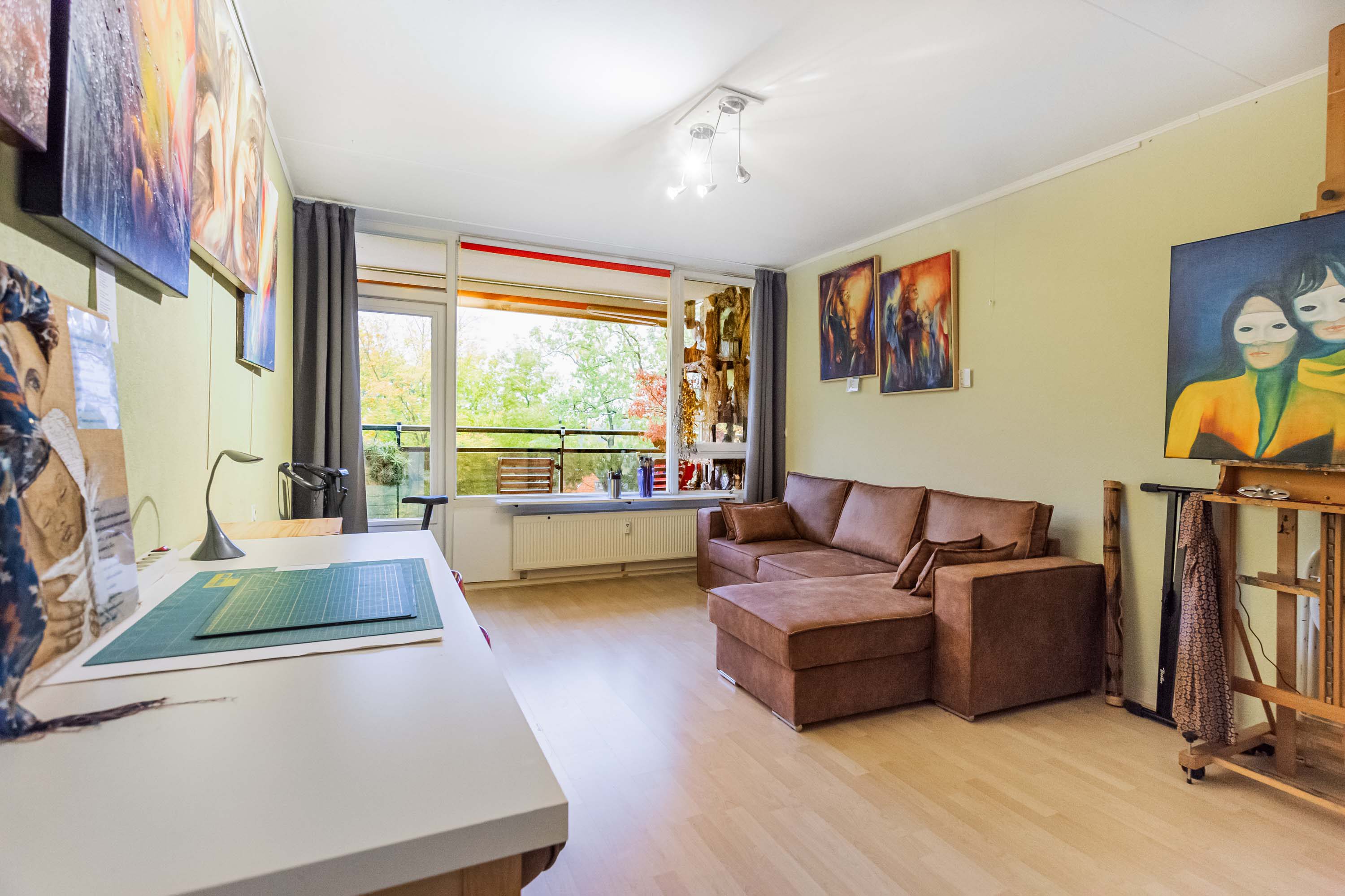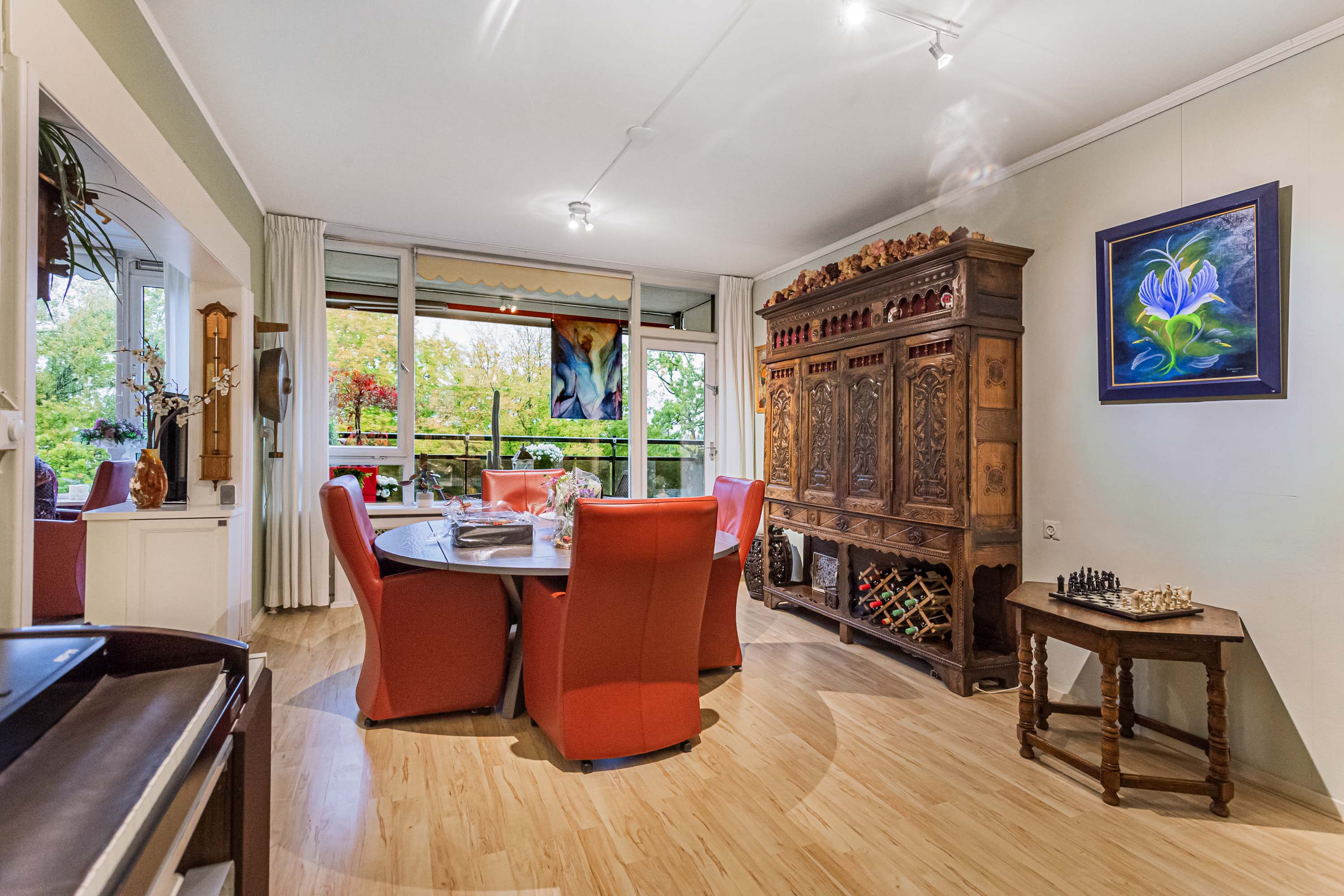 De ruime woonkamer is verdeeld in een zitgedeelte en een apart eetgedeelte, verbonden door een brede doorgang. Hierdoor voelt de ruimte open en gezinsvriendelijk aan. Vanuit de woonkamer zijn zowel het kleine als het grote balkon bereikbaar.