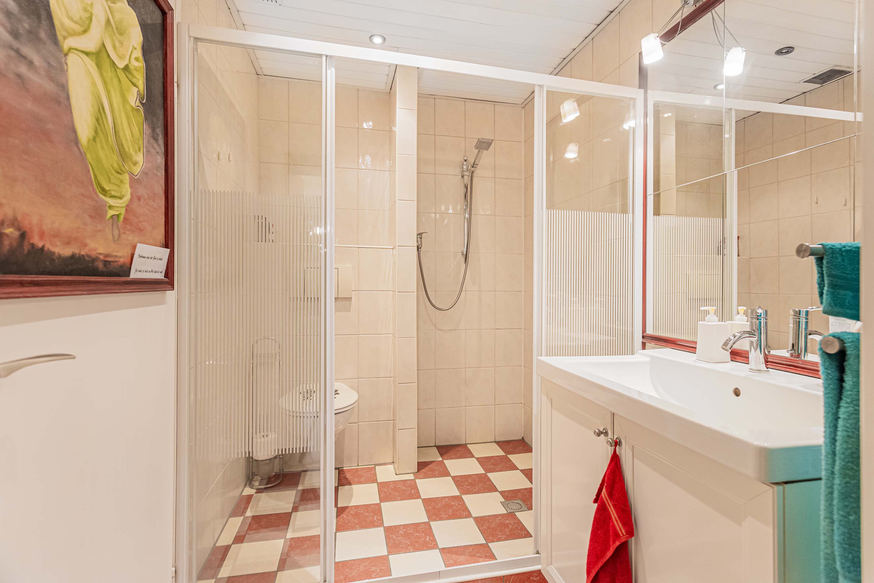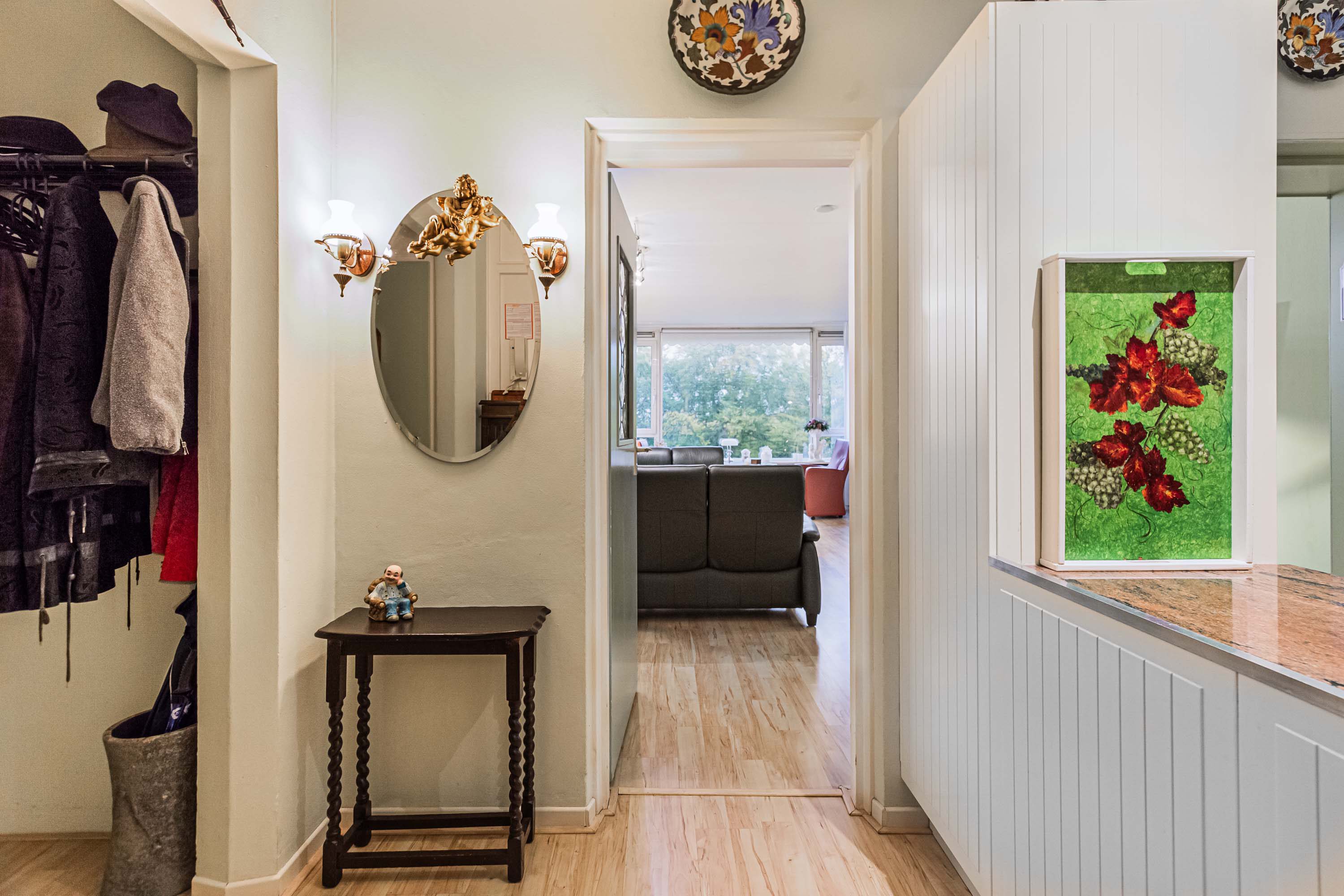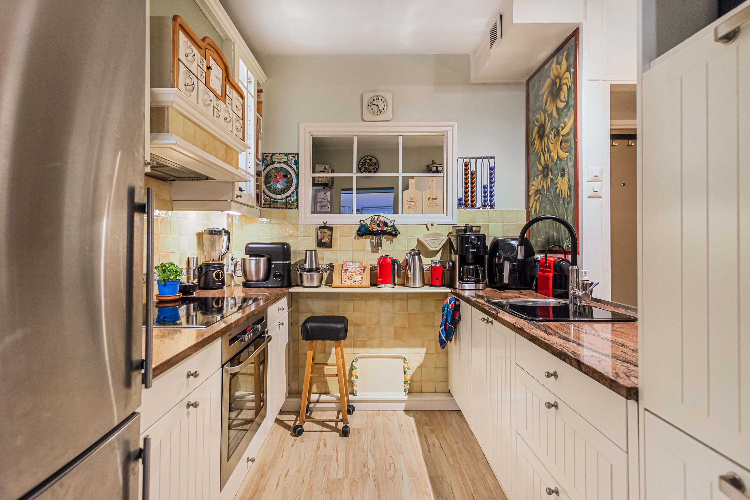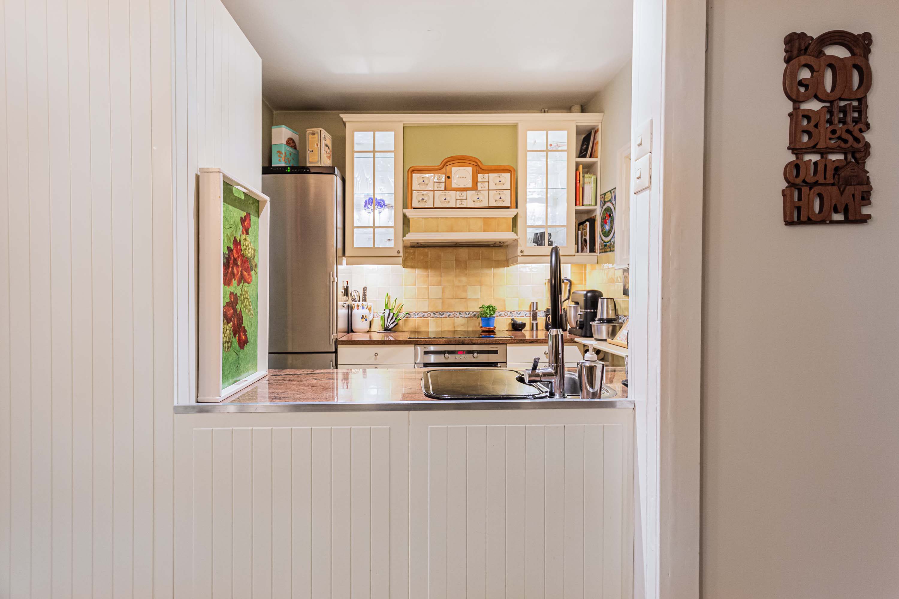 Bij binnenkomst kom je in de hal met toegang tot de vaste kast met wasmachineaansluiting, het toilet en de keuken. De hal staat in open verbinding met de keuken, wat zorgt voor extra licht en een ruimtelijk gevoel. De keuken is voorzien van een oven, kookplaat en vaatwasser, en biedt voldoende opbergruimte. Ideaal voor wie van koken houdt.