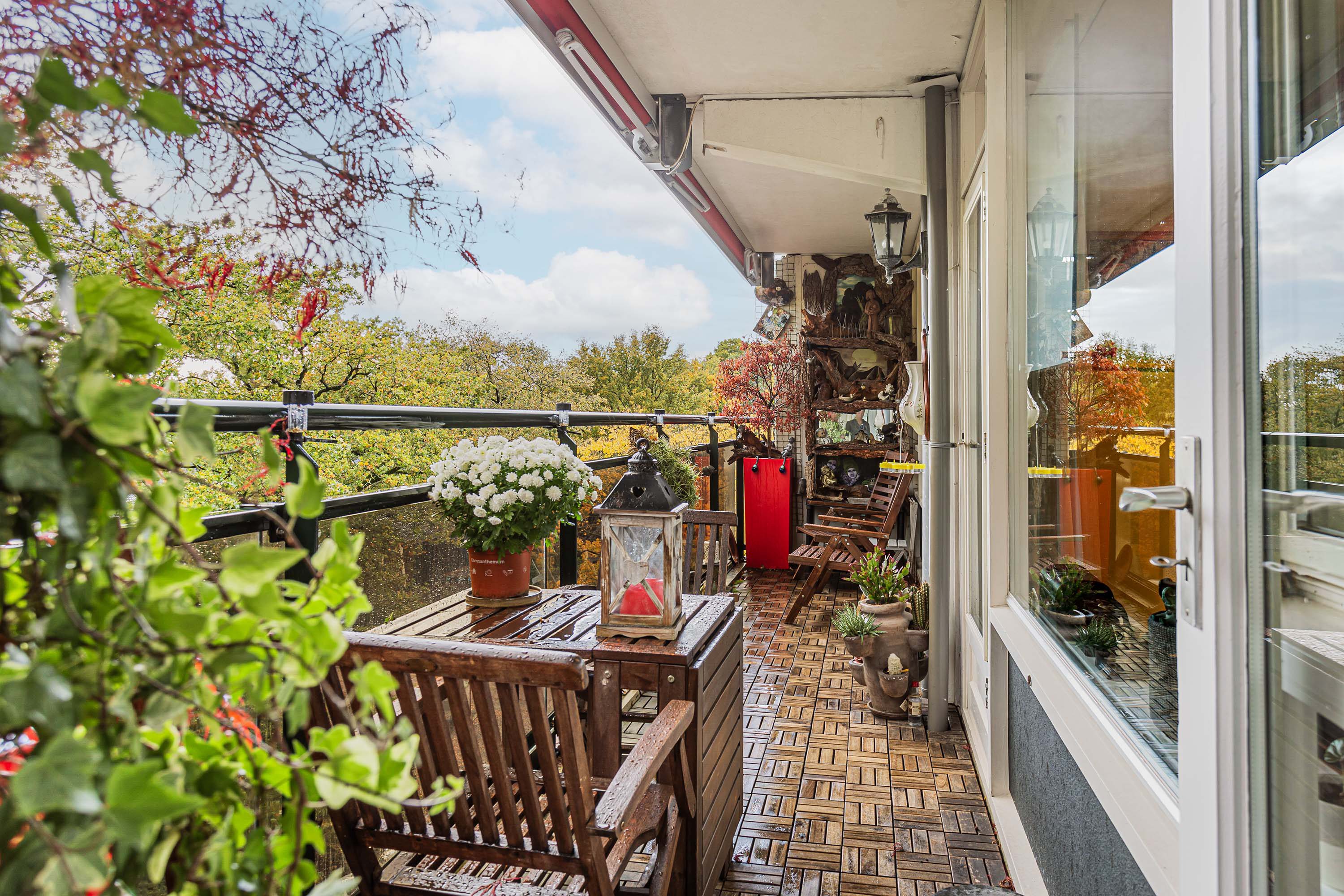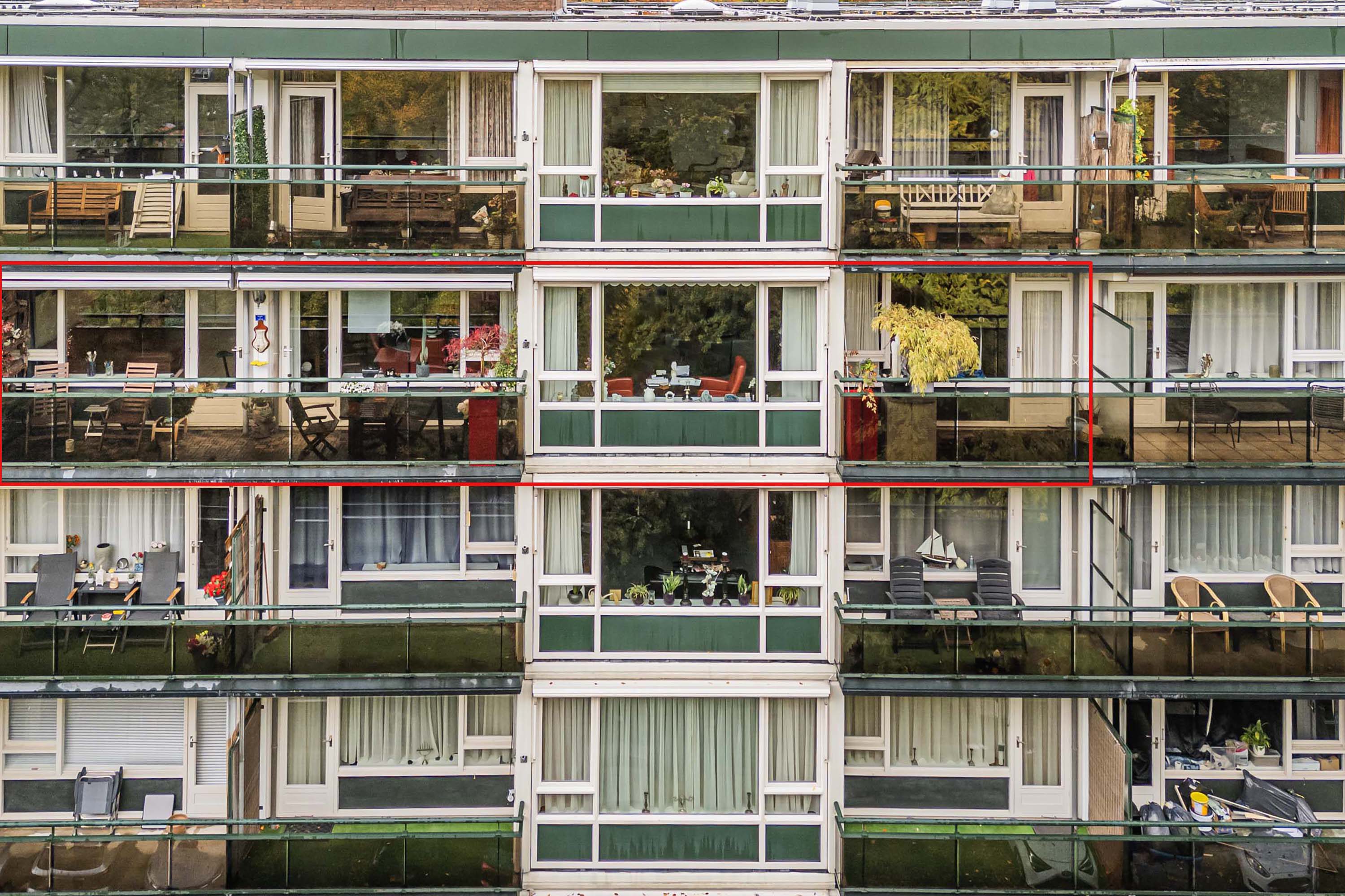 Het appartement beschikt over twee balkons. Het grote balkon van circa 11 m² is toegankelijk via de eetkamer en tweede slaapkamer. Het kleinere balkon van bijna 6 m² grenst aan de woonkamer en hoofdslaapkamer. Beide balkons liggen op het westen en bieden een vrij uitzicht op een groene laan met bomen, wat zorgt voor veel privacy. Dankzij de drie elektrische zonneschermen zit je er op warme dagen altijd prettig, perfect voor een spelmoment met kinderen of een ontspannen avond voor die graag buiten zitten.