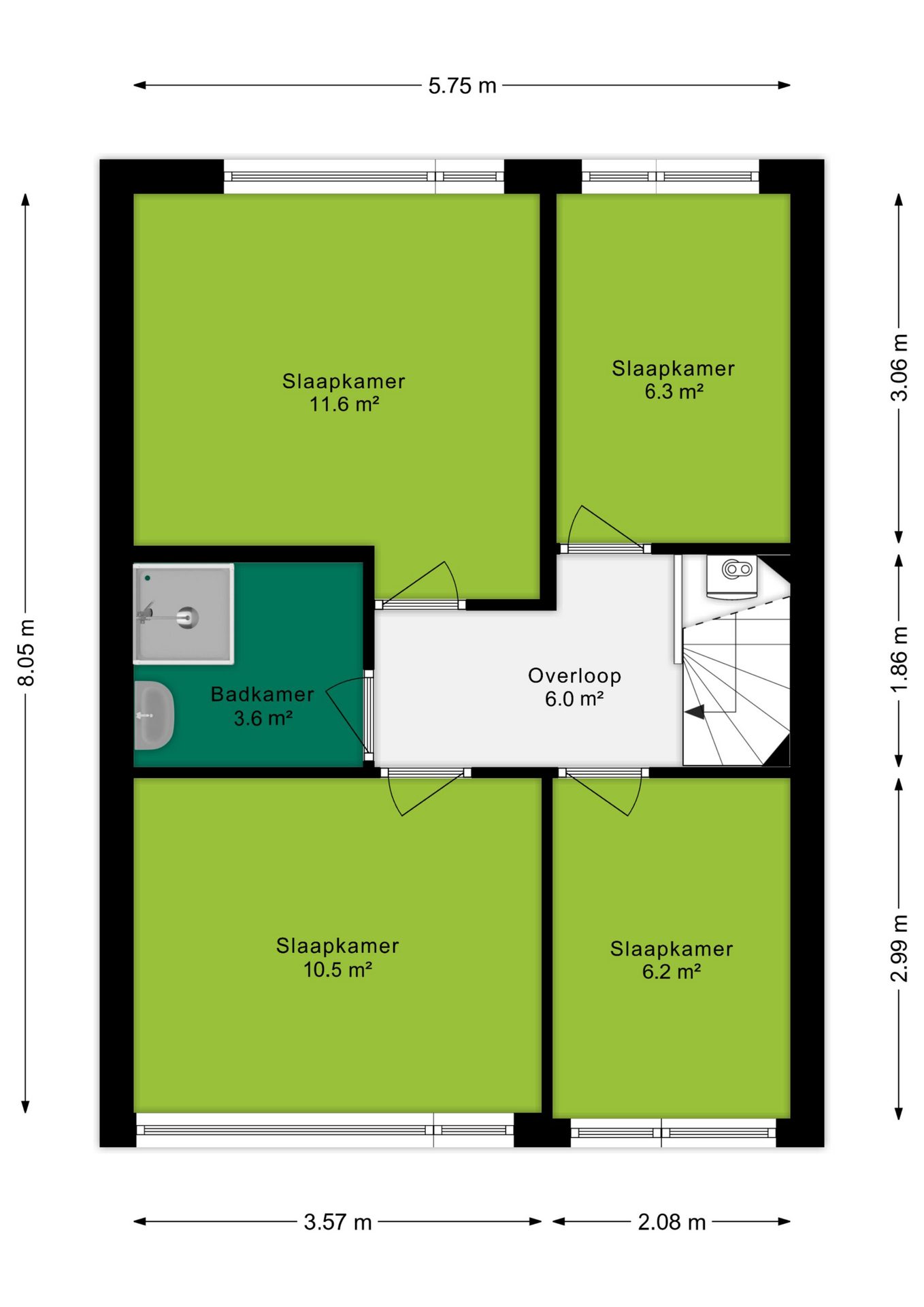 Via de overloop bereik je maar liefst vier slaapkamers en de badkamer. De slaapkamers zijn circa 12m², 11m² en twee slaapkamers van circa 6m². De kamers hebben allen rechte wanden, waardoor de ruimtes optimaal benut kunnen worden. Hierdoor heb je echt vier volwaardige slaapkamers. De badkamer is volledig getegeld in een lichte kleurstelling en voorzien van een douche, wastafel en witgoedaansluiting.